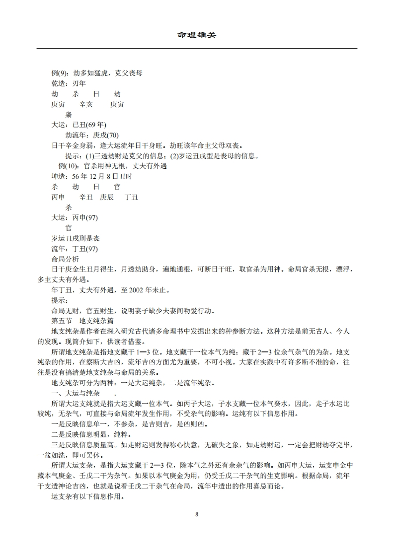 命理雄关劫才流年:乙亥(95)戊寅(98)命局分析:日元专旺,取印比为用神,忌财宫。断:95流年乙亥。劫透坐印,用神干支组合到位,该年命主发财6万余元。98年流年戊寅,财坐比为忌神,大运电冲寅木,又见年干癸水与戊合绊。该年因合伙做生意亏本2万多元。断为合伙破财的命理原因:一是戊癸合伤不化是合作不成功的信息。二是戊土偏财坐比劫是群比夺财的信息。所以断因合伙而破财。正枭印代表合伙、文书、室内房屋。正验提示。作者在研究古断技法的基础上,结合自己多年点断命伊践,总结出点断流年事项万有法则四条,本书中仅介绍两条,这两条万有法则是:1、天干为应事项之果,地支为应事项之因。2、天干透出是他人主动性、干藏是自己主动性。其余两法则将在后书中介绍一、“天干为果,地支为因”。其理论依据是:天干为苗、地支为根。天干既然为苗,就要开花结果,结果是流年吉或凶事项的归宿。地支为根,根的枯荣会影响到苗的果实,根深荣结果就坚实明显,强体现:根枯结果就质轻不明显,弱体现。任何植物不会有根无苗,也不会有苗无根,根苗相互依存。因此,点断流年应事项,天干代表流年应事项的结果,地支代表流年应事项的原因。具体采说“天干为果”,就是流年体现吉或凶的结果,如流年发财、破财、升宫、病伤、牢狱等等。“地去为因”就是流年体现吉或凶事项发生的原因。如流年病伤、破财、降宫职等等。比如说,流年为何破财,为何伤灾。作为一个合格预测师,完女全能够预测出命主流年为何破财,把破财的原因讲清楚,这样才令人信服,才算高手,不能笼统概括地说:“你今年有破财之事”象这样说,是过碰是估计的形式。告诉读者,没有真实过硬的命理功底是说不出事项发生的原因,或者说,只知其果,不知其目。作者点断流年应事项的“万有法则”为读者提示了分析思路,万不失一。例(1)57年二月二十二日丑时乾造:伤枭日劫丁酉癸卯甲午乙丑比流年:甲戍(94)日元甲木身旺,印比为忌,取伤官生财为用神。94流年甲戌。甲木比肩争夺钱财的信息,可断该年有破财之事。戌土地支为因。戌中丁火透年干上,月干癸水构成丁癸冲,丁火伤宫用神受伤。注意:用神受克必有伤害之事。说明日主是为伤害破财。实际是:该年九月(戌月)搞房产建筑高空作业摔死人(掉下伤亡)、赔款4万多元。这就是“天干为果,地支为因”的断法。例(2):71年六月初三辰坤:劫才日比辛亥乙末庚戌庚辰比流年:庚辰(2000年)命局分析:日干庚金比劫双透,日时辰戌冲引导动生身,日干以身旺论,取财生宫杀为喜用神。2000年庚辰。庚金比肩透出是动破财的信息(天干为果)己经作出肯定。再看地支辰土,辰中癸水2古籍库www.fozhu920.Com