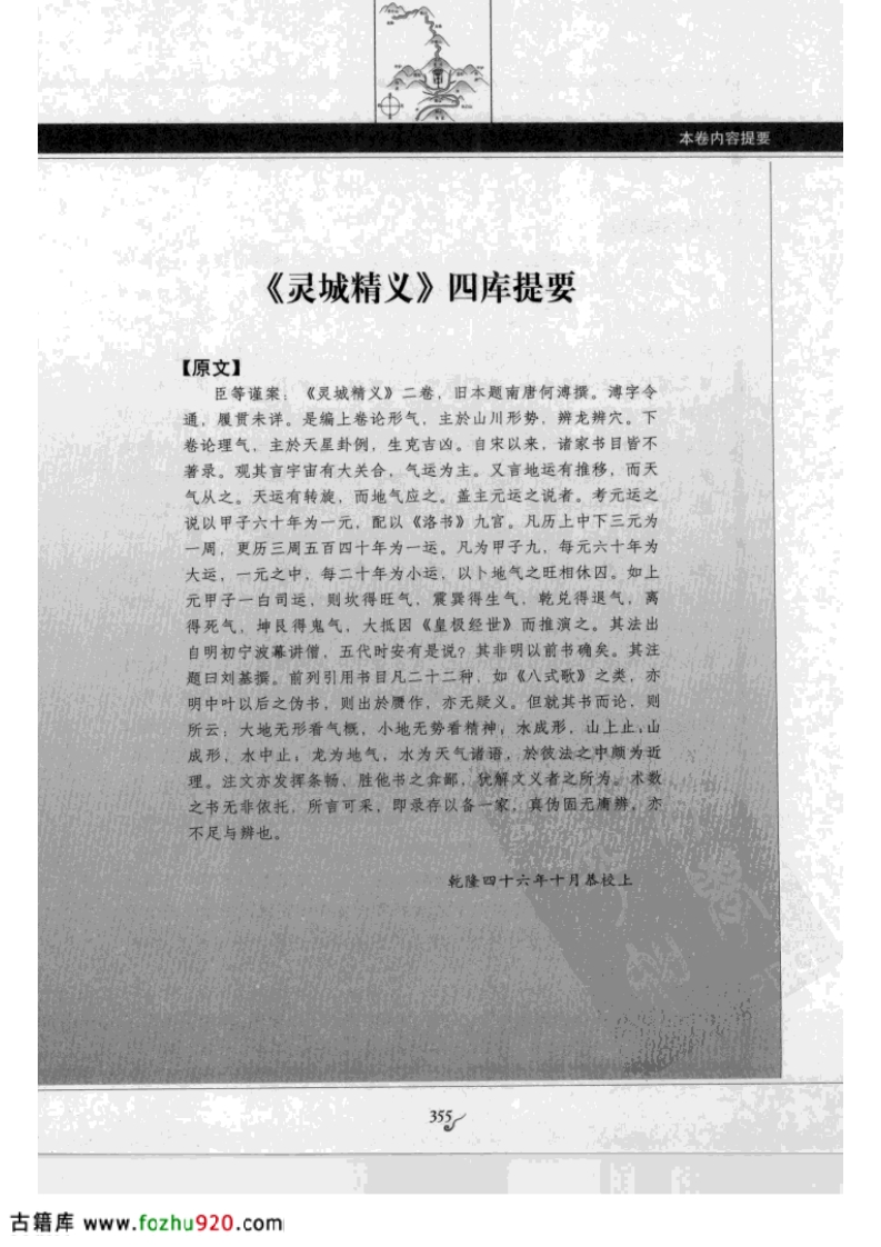 本卷内容提要《灵城精义》四库提要【原文】臣等谨案:《灵城精义》二卷,旧本题南唐何溥撰。溥字令通,履贯未详。是编上卷论形气,主於山川形势,辨龙辨穴。下卷论理气,主於天星卦例,生克吉凶。自宋以来,诸家书目皆不著录。观其言宇宙有大关合,气运为主。又言地运有推移,而天气从之。天运有转旋,而地气应之。盖主元运之说者。考元运之说以甲子六十年为一元,配以《洛书》九官。凡历上中下三元为一周,更历三周五百四十年为一运。凡为甲子九,每元六十年为大运,一元之中,每二十年为小运,以卜地气之旺相休囚。如上元甲子一白司运,则坎得旺气震巽得生气,乾兑得退气,离得死气,坤民得鬼气,大抵因《皇极经世》而推演之。其法出自明初宁波幕讲僧,五代时安有是说?其非明以前书确矣。其注题日刘基撰。前列引用书目凡二十二种,如《八式歌》之类,亦明中叶以后之伪书,则出於赝作,亦无疑义。但就其节而论,则所云:大地无形看气概,小地无势看精神,水成形,山上止,山成形,水中止,龙为地气,水为天气诸语,於彼法之中颜为近理。注文亦发挥条畅、胜他书之弇鄙,犹解文义者之所为:术数之书无非依托,所言可采,即录存以备一家,真伪固无插辨,亦不足与辨也。乾隆四十六年十月恭校上35古籍库www.fozhu920.com