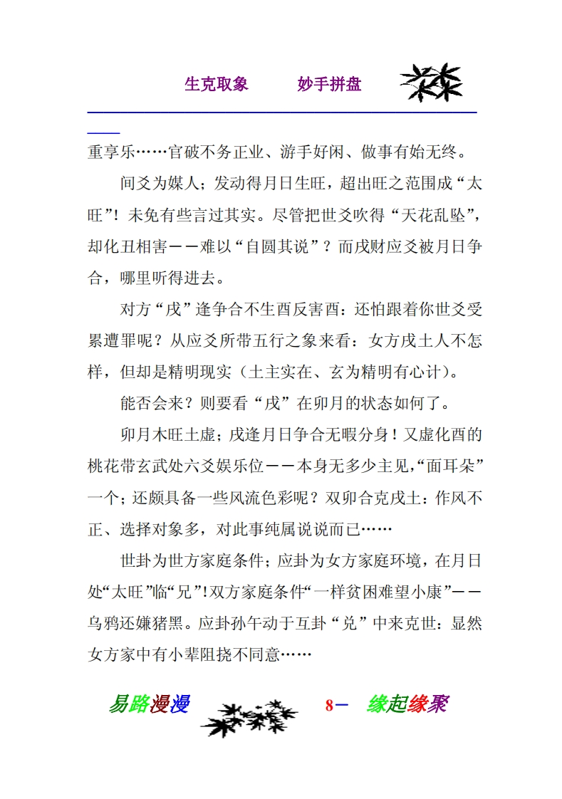 生克取象妙手拼盘淼卷首语自笔者首部《理象数突破三关》面世以后,从许多易友的来电来信中:普遍反应技术等级含量偏高!在与过去所掌握的理论思维上难以链接…明显存在着“脱轨”现象。对于这个客观存在的一一“普遍问题”?我的回答是:由于在笔者这部书中,太多断卦理论在读者的“记忆库”中仍属“空白”…要想与过去掌握的东西达到“合理接轨”?毕竞需要一个不长的过程。在你没有补上这一课之前,此类“脱节”现象乃是“想当然”之事。有鉴于此,经思虑再三!才有了这部《生克取象、妙手拼盘》著作的问世,并按技术等级编为三部曲之一、二、三部。说实话:要笔者回过头来再去写本技术层次低一点的工具书,无异于“赶鸭子上架”,颇有点“真难”的感觉!这好比从一个已经进化了的思维时代,又要转回到远古的原始思维模式之中去!尽管如此;为不辜负易友们之厚爱,亦只有勉为其难了。在本书中,笔者力求从深度中寻求广度、从单一中阐明复杂!针对读者目前存在问题,易路漫漫2一缘起缘聚古籍库www.fozhu920.com
