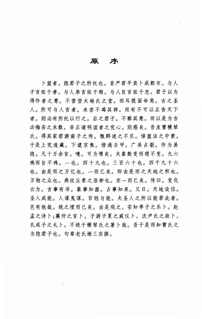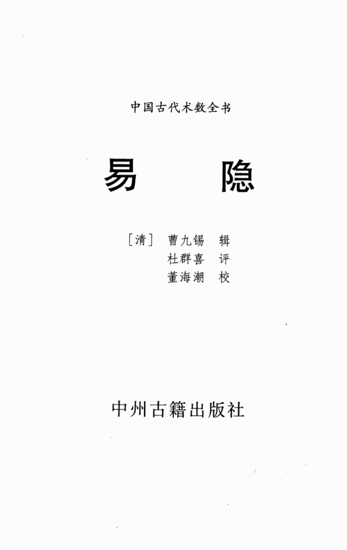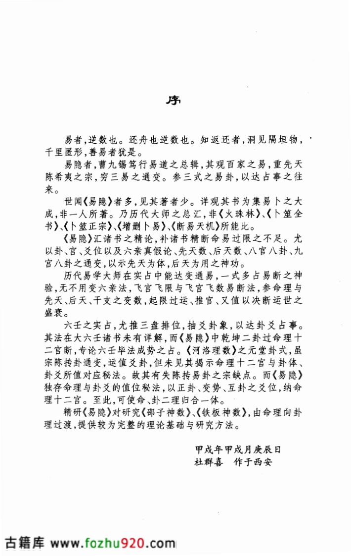 序易者,逆数也。还舟也逆数也。知返还者,洞见隔垣物,·千里匿形,善易者犹是。易隐者,曹九锡笃行易道之总辑,其观百家之易,重先天陈希夷之宗,穷三易之通变。参三式之易卦,以达占事之往来。世闻《易隐》者多,见其著者少。详观其书为集易卜之大成,非一人所著。乃历代大师之总汇,非《火珠林》、〈卜筮全书》、《卜筮正宗》、《增删卜易》、《断易天机》所能比。《易隐》汇诸书之精论,补诸书精断命易过限之不足。尤以卦、宫、爻位以及六亲真假论、先天数、后天数、八官八卦、九宫八卦之通变,以示先天为体,后天为用之神功。历代易学大师在实占中能达变通易,一式多占易断之神验,无不用变六亲法,飞宫飞限与飞宫飞数易断法,参命理与先天、后天、干支之变数,起限过运、推官、又值以决断运世之盛衰。六壬之实占,尤推三盘排位,抽爻卦象,以达卦爻占事。其法在大六壬诸书未有详解,而《易隐》中乾坤二卦过命理十二宫断,专论六壬毕法成势之占。《河洛理数》之元堂卦式,虽宗陈抟卦通变,运值爻卦,但未见其揭示命理十二官与卦体、卦爻所值对应秘法。故其有失陈抟易卦之宗缺点。而〈易隐)》独存命理与卦爻的值位秘法,以正卦、变势、互卦之爻位,纳命理十二宫。至此,可使命、卦二理归合一体。精研《易隐》对研究《邵子神数〉、《铁板神数〉,由命理向卦理过渡,提供较为完整的理论基础与研究方法。甲成年甲戍月庚辰日杜群喜作于西安古籍库www.fozhu920.com