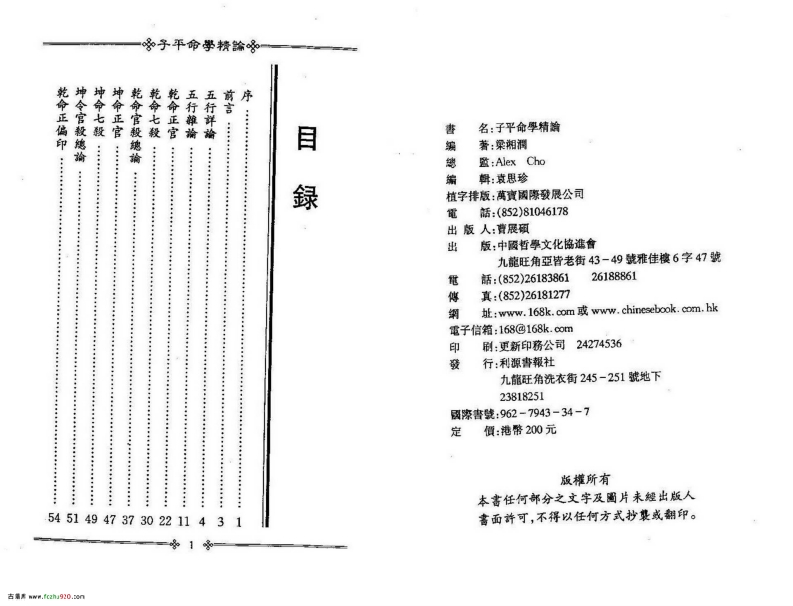 学子平命墨精豁乾命正编印坤命正官乾命官极總論乾命正官乾命七题五行雜論五行詳論警序目查名:子平命學精龄编奢:梁湘褐總蓝:Alex Cho编鲜:袁思珍録植字样版:萬寶阙藤致展公司電話:(852)81046178出版人:营展硕出版:中酸哲學文化協谁會九龍旺角亞皆老街43-49畿雅佳模6字47號花話:(852)2618386126188861傅真:(852)26181277纲址:www.168k.com或www,chinesebook.com.hk電子信箱:168@168k.0om印刷:更新印務公司24274536發行:利源書報杜九龍旺角洗衣街245-251號地下23818251圆膝書线:962-7943-34-7定價:港幣200元版權所有本書任何部分之文字及圖片未經出版人54514947373022113蓄面许可,不得以任何方式抄裴或翻印。1吉第Rswm.Czhu920.38n