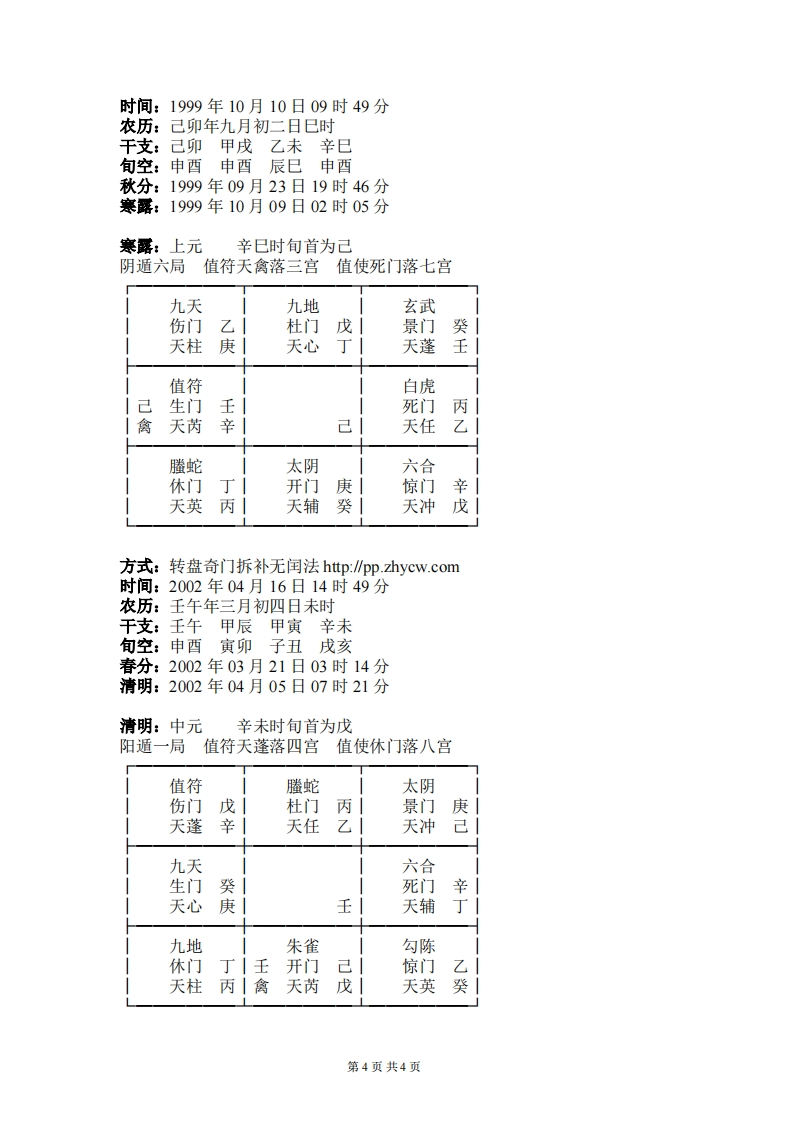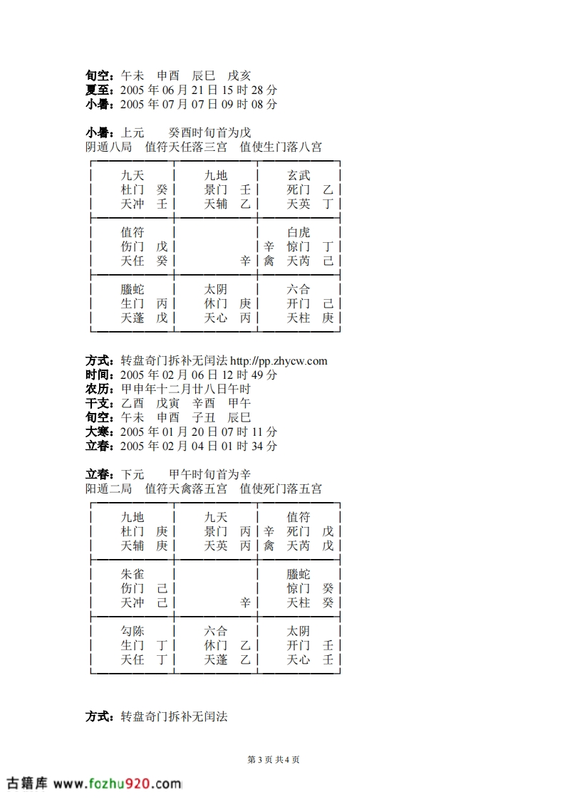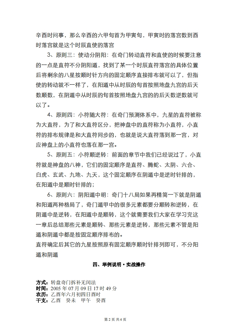 辛西时问事,那么辛西的六甲旬首为甲寅旬,甲寅时的落宫数到酉时落宫就是这个时辰直使的落宫3、原则三:使动分阴阳:在奇门转动直符和直使的时候要注意的一点是直符不分阴阳遁,找到了某一个时辰直符落宫的具体位置后将剩余的八星按顺时针方向的固定顺序直接排布就可以了,但指使的转动就不一样了,在阳遁中从时辰的旬首按照地盘九宫的后天数顺数,在阴遁中从时辰的旬首按照地盘九宫的的后天数逆数就可以了。4、原则四:小符随大符:在奇门预测体系中,九星的直符被称为大直符,为了和大直符区分,把神盘中的直符称为小直符,小直符的排布规律是和大直符同步的,也就是说大直符落到那一宫,对应神盘上的小直符也落在那一宫。5、原则五:小符顺逆转:前面的章节中我们已经说过了,小直符就是神盘的八神,它们的固定顺序是直符、腾蛇、太阴、六合、白虎、玄武、九地、九天,这个固定顺序在阴遁中是逆时针排的,在阳遁中是顺时针排的;6、原则六:阴阳遁中明:奇门十八局如果再精简一下就是阴遁和阳遁两种格局了,奇门遁甲中的很多元素都要分顺转和逆转,在阴遁中是逆转,在阳遁中是顺转,这个就需要我们大家在学习完这一章后总结那些元素是顺转、那些元素是逆转,那些元素不管是阳遁和阴遁中都是按固定顺序排布的。直符确定后其它的九星按照原有固定顺序顺时针排列即可,不分阳遁和阴遁四、举例说明·实战操作方式:转盘奇门拆补无闰法时间:2005年07月09日17时49分农历:乙酉年六月初四日酉时干支:乙酉癸未甲午癸酉第2页共4页
