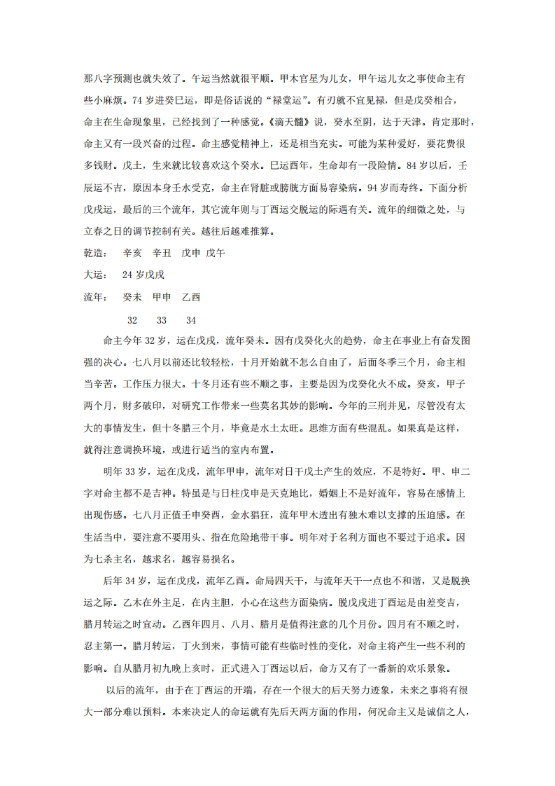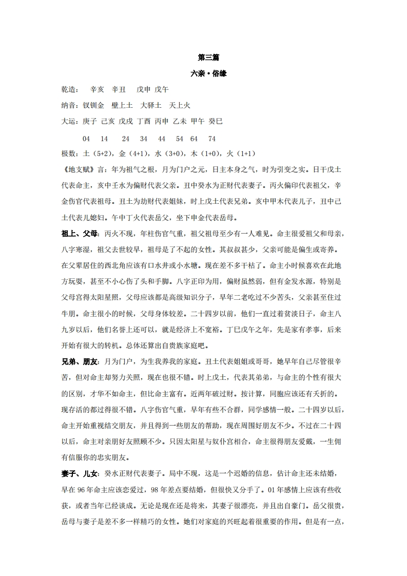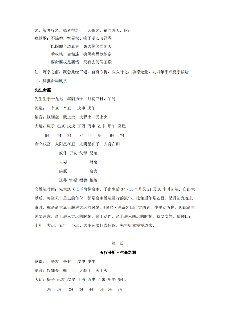 之,智者行之,德者得之,上天佑之,福与善人。附:疯颠歌:不炼拳,空弄权。痴子虔心习经卷巴国颠子道真言,愚夫傻笑面朝天拳权钱,命相连,疯颠痴愚孰能定要命要权是要钱,只有去问阎王殿注:炼拳之前,默念此经三遍,自有心得,久久行之,功德无量。九四年甲戌夏于渝居二、详批命局欣赏先生命鉴先生生于一九七二年阴历十二月初三日,午时乾造:辛亥辛丑戊申戊午纳音:钗钏金壁上土大驿土天上火大运:庚子己亥戊戌丁酉丙申乙未甲午癸已0414243444546474命立戌宫太阳星在丑太阴星在子安身在卯奴仆子女父母兄弟夫妻财帛疾厄命宫迁移宫禄福德相貌交脱运时间:先生您(以下简称命主)于出生后3年11个月又21天10小时起运。自出生以后,每逢天干是乙的年份,都是命主脱运进行的流年。比如后年是乙酉,腊月初九晚上亥时,就是命主真正脱进大运的时刻。《易经·系辞》曰:吉凶者,生乎动者也。因此命主需要注意,逢上进入吉运的时刻,宜于动作,逢上进入凶运的时刻,就要安静。仙师曰:十年一大运,五年一小运。大小运限何吉何凶,先生听我慢慢道来。第一篇五行分析·生命之源乾造:辛亥辛丑戊申戊午纳音:钗钏金壁上土大驿土天上火大运:庚子己亥戊戌丁酉丙申乙未甲午癸已0414243444546474