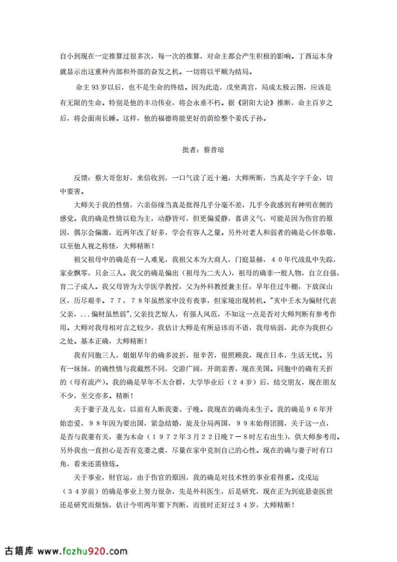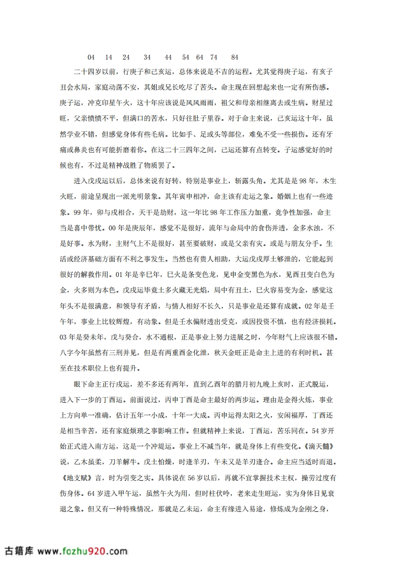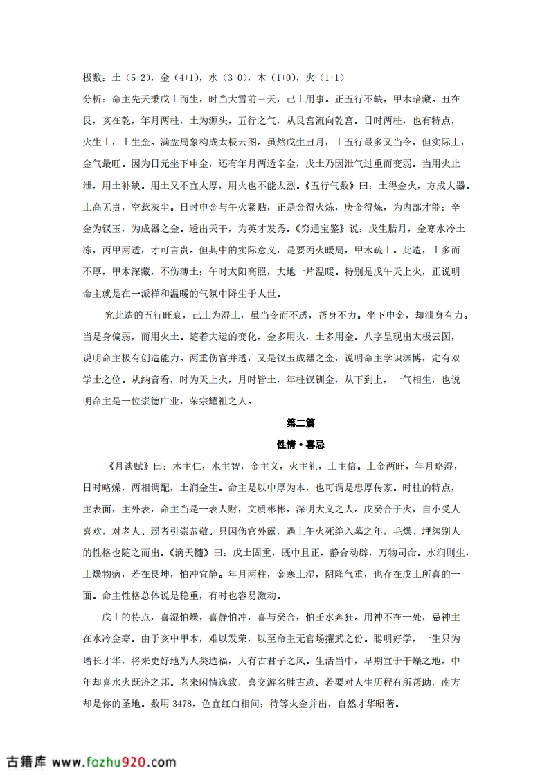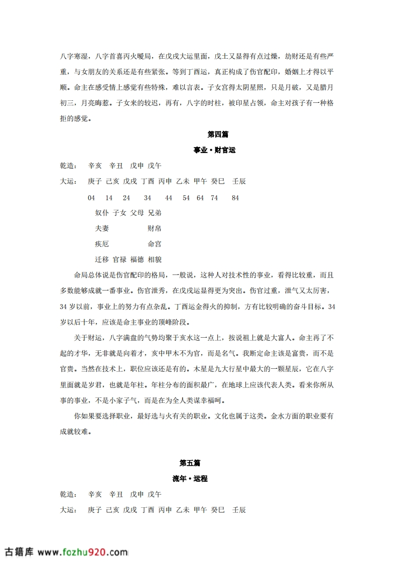 之,智者行之,德者得之,上天佑之,福与善人。附:疯颠歌:不炼拳,空弄权。痴子虔心习经卷巴国颠子道真言,愚夫傻笑面朝天拳权钱,命相连,疯颠痴愚孰能定要命要权是要钱,只有去问阎王殿注:炼拳之前,默念此经三遍,自有心得,久久行之,功德无量。九四年甲戌夏于渝居二、详批命局欣赏先生命鉴先生生于一九七二年阴历十二月初三日,午时乾造:辛亥辛丑戊申戊午纳音:钗钏金壁上土大驿土天上火大运:庚子己亥戊戌丁酉丙申乙未甲午癸已0414243444546474命立戌宫太阳星在丑太阴星在子安身在卯奴仆子女父母兄弟夫妻财帛疾厄命宫迁移宫禄福德相貌交脱运时间:先生您(以下简称命主)于出生后3年11个月又21天10小时起运。自出生以后,每逢天干是乙的年份,都是命主脱运进行的流年。比如后年是乙酉,腊月初九晚上亥时,就是命主真正脱进大运的时刻。《易经·系辞》曰:吉凶者,生乎动者也。因此命主需要注意,逢上进入吉运的时刻,宜于动作,逢上进入凶运的时刻,就要安静。仙师曰:十年一大运,五年一小运。大小运限何吉何凶,先生听我慢慢道来。第一篇五行分析·生命之源乾造:辛亥辛丑戊申戊午纳音:钗钏金壁上土大驿土天上火大运:庚子己亥戊戌丁酉丙申乙未甲午癸已0414243444546474