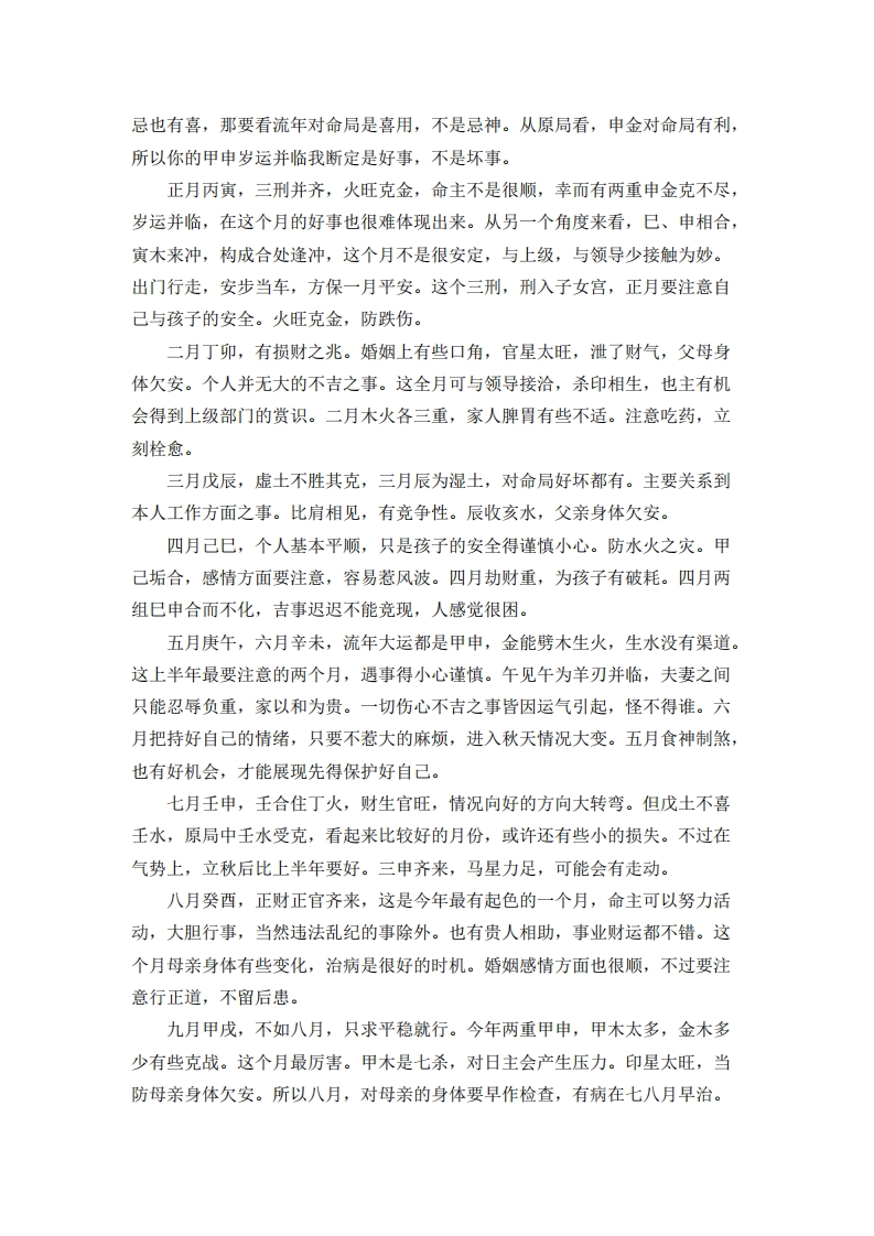 忌也有喜,那要看流年对命局是喜用,不是忌神。从原局看,申金对命局有利,所以你的甲申岁运并临我断定是好事,不是坏事。正月丙寅,三刑并齐,火旺克金,命主不是很顺,幸而有两重申金克不尽,岁运并临,在这个月的好事也很难体现出来。从另一个角度来看,已、申相合,寅木来冲,构成合处逢冲,这个月不是很安定,与上级,与领导少接触为妙。出门行走,安步当车,方保一月平安。这个三刑,刑入子女宫,正月要注意自己与孩子的安全。火旺克金,防跌伤。二月丁卯,有损财之兆。婚姻上有些口角,官星太旺,泄了财气,父母身体欠安。个人并无大的不吉之事。这全月可与领导接洽,杀印相生,也主有机会得到上级部门的赏识。二月木火各三重,家人脾胃有些不适。注意吃药,立刻栓愈。三月戊辰,虚土不胜其克,三月辰为湿土,对命局好坏都有。主要关系到本人工作方面之事。比肩相见,有竞争性。辰收亥水,父亲身体欠安。四月己已,个人基本平顺,只是孩子的安全得谨慎小心。防水火之灾。甲己垢合,感情方面要注意,容易惹风波。四月劫财重,为孩子有破耗。四月两组已申合而不化,吉事迟迟不能竞现,人感觉很困。五月庚午,六月辛未,流年大运都是甲申,金能劈木生火,生水没有渠道。这上半年最要注意的两个月,遇事得小心谨慎。午见午为羊刃并临,夫妻之间只能忍辱负重,家以和为贵。一切伤心不吉之事皆因运气引起,怪不得谁。六月把持好自己的情绪,只要不惹大的麻烦,进入秋天情况大变。五月食神制煞,也有好机会,才能展现先得保护好自己。七月王申,壬合住丁火,财生官旺,情况向好的方向大转弯。但戊土不喜壬水,原局中壬水受克,看起来比较好的月份,或许还有些小的损失。不过在气势上,立秋后比上半年要好。三申齐来,马星力足,可能会有走动。八月癸酉,正财正官齐来,这是今年最有起色的一个月,命主可以努力活动,大胆行事,当然违法乱纪的事除外。也有贵人相助,事业财运都不错。这个月母亲身体有些变化,治病是很好的时机。婚姻感情方面也很顺,不过要注意行正道,不留后患。九月甲戌,不如八月,只求平稳就行。今年两重甲申,甲木太多,金木多少有些克战。这个月最厉害。甲木是七杀,对日主会产生压力。印星太旺,当防母亲身体欠安。所以八月,对母亲的身体要早作检查,有病在七八月早治。