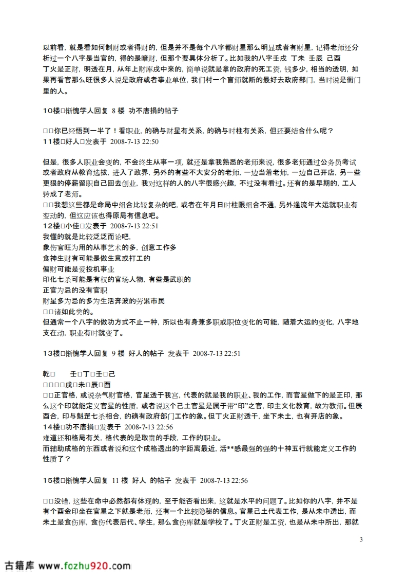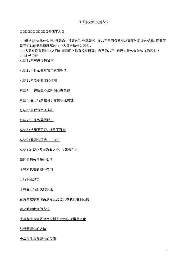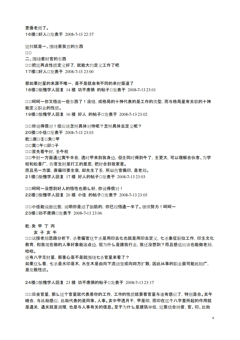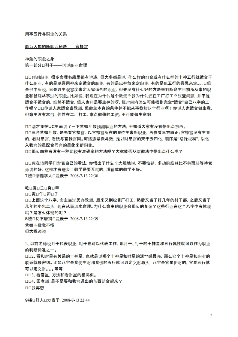 用事五行与职业的关系鲜为人知的断职业秘法一官禄宫神煞的职业之象第一部分口引子一话说职业命理口口预测职业,很多命理书籍里都有讲述,但大多都是说,什么样的组合或有什么样的十神五行就适合干什么职业,有的是以喜用神来定适合的职业,有的是以神煞来定职业,有的是以五行的喜忌来定口但是书中所说,只是以主观态度来定人家适合的职业,但并没有什么好的方法来判断命主目前所从事的职业和會经从事过的职业。比如说,我现在为什么是个教师?我为什么还在工厂打工?这些问题并不是适合不适合的,纵然不适合,但人也还是要生存的呀,短时间内怎么可能找到完全“适合”自己八字的工作呢?口口你说人家适合当教师,但命主本身的条件并不能从事教师这个行业啊!你说人家适合做生意但命主没有本钱,仍然在工厂打工,拿点微薄的工资,不可能做生意啊口口刚才我在UC里面讲了一下紫微斗数预测职业的方法,不知道大家有没有悟出点东西。口口三合紫微斗数,是先看官禄宫,以官禄宫所在的星位主来断职业,再参看三方四正:官禄宫没有主星的,看财帛宫,看法与官禄宫同。河洛派紫微斗数,是以财帛宫的天干去四化,顺序是“忌禄权科”,以化入我宫的星配合同官的星象来断职业。口口那么四柱有没有一种此较有准确率的方法呢?大家能否从紫微法中悟出点什么呢?口口现在请同学们发表自己的看法,你悟出了什么?大胆地说,不要怕错,多动脑筋总比不劳而获等待老师讲的好,这样才有进步!教学是要互动的,灌输式的教学不好。7楼口惭愧学人口发表于2008-7-1322:30乾0庚0壬口癸口甲口口寅口午口卯口子口口上面这个八字,命主当过民办教师,后来又到松香厂打工,然后又当了好几年的村干部,之后又当了几年的小包工头,现在从事风水命理。为什么命主的职业会那么的复杂?这些行业在这个八字中有体现吗?是怎么体现的呢?8楼口功不唐捐口发表于2008-7-1322:39紫微斗数我不懂但大概说说1、以前老师说月干代表职业,时干也可以代表工作,那月干、时干的十神星和五行属性就可以作为职业的判断标准之一。口口2、看和财星有关系的十神星,也就是说哪个十神星和财星的活*感最强,那么这个十神星和职业的联系就最密切。比如八字是食伤生财那食伤的五行就可以定义财源头,八字是官星护财的,官星五行就可以定义财。。。等等口口3、看官星,方法和看财星的相类似。口口4、回老师:是不是要和我宫透出的东西结合起来?口口我再想9楼口好人口发表于2008-7-1322:44