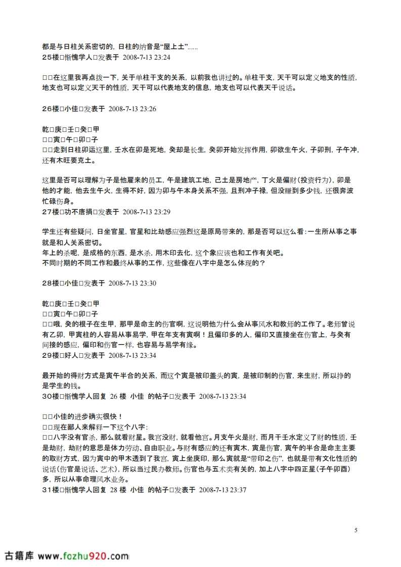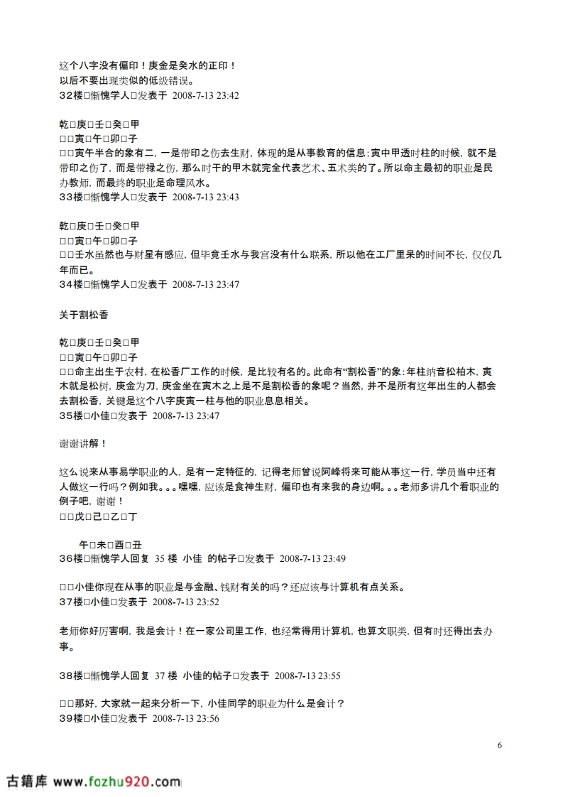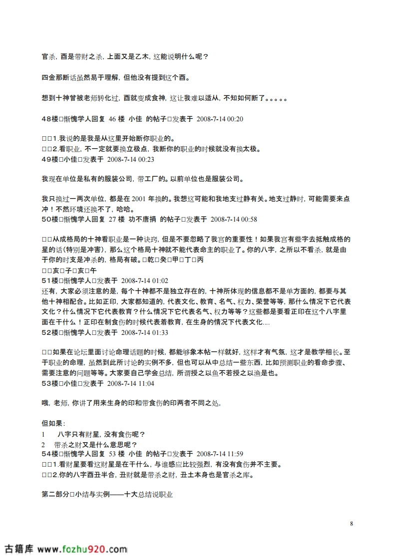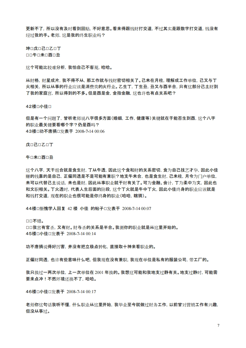 用事五行与职业的关系鲜为人知的断职业秘法一官禄宫神煞的职业之象第一部分口引子一话说职业命理口口预测职业,很多命理书籍里都有讲述,但大多都是说,什么样的组合或有什么样的十神五行就适合干什么职业,有的是以喜用神来定适合的职业,有的是以神煞来定职业,有的是以五行的喜忌来定口但是书中所说,只是以主观态度来定人家适合的职业,但并没有什么好的方法来判断命主目前所从事的职业和會经从事过的职业。比如说,我现在为什么是个教师?我为什么还在工厂打工?这些问题并不是适合不适合的,纵然不适合,但人也还是要生存的呀,短时间内怎么可能找到完全“适合”自己八字的工作呢?口口你说人家适合当教师,但命主本身的条件并不能从事教师这个行业啊!你说人家适合做生意但命主没有本钱,仍然在工厂打工,拿点微薄的工资,不可能做生意啊口口刚才我在UC里面讲了一下紫微斗数预测职业的方法,不知道大家有没有悟出点东西。口口三合紫微斗数,是先看官禄宫,以官禄宫所在的星位主来断职业,再参看三方四正:官禄宫没有主星的,看财帛宫,看法与官禄宫同。河洛派紫微斗数,是以财帛宫的天干去四化,顺序是“忌禄权科”,以化入我宫的星配合同官的星象来断职业。口口那么四柱有没有一种此较有准确率的方法呢?大家能否从紫微法中悟出点什么呢?口口现在请同学们发表自己的看法,你悟出了什么?大胆地说,不要怕错,多动脑筋总比不劳而获等待老师讲的好,这样才有进步!教学是要互动的,灌输式的教学不好。7楼口惭愧学人口发表于2008-7-1322:30乾0庚0壬口癸口甲口口寅口午口卯口子口口上面这个八字,命主当过民办教师,后来又到松香厂打工,然后又当了好几年的村干部,之后又当了几年的小包工头,现在从事风水命理。为什么命主的职业会那么的复杂?这些行业在这个八字中有体现吗?是怎么体现的呢?8楼口功不唐捐口发表于2008-7-1322:39紫微斗数我不懂但大概说说1、以前老师说月干代表职业,时干也可以代表工作,那月干、时干的十神星和五行属性就可以作为职业的判断标准之一。口口2、看和财星有关系的十神星,也就是说哪个十神星和财星的活*感最强,那么这个十神星和职业的联系就最密切。比如八字是食伤生财那食伤的五行就可以定义财源头,八字是官星护财的,官星五行就可以定义财。。。等等口口3、看官星,方法和看财星的相类似。口口4、回老师:是不是要和我宫透出的东西结合起来?口口我再想9楼口好人口发表于2008-7-1322:44