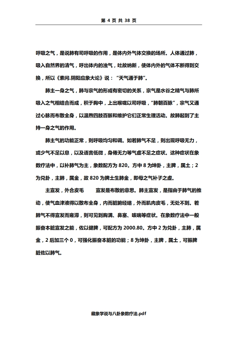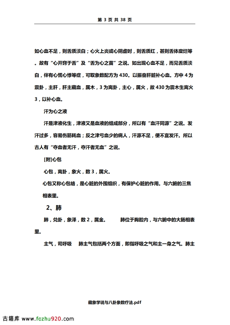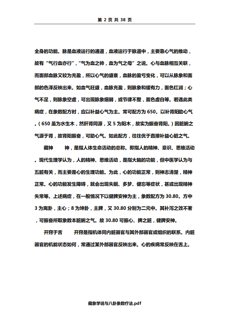 第2页共38页全身的功能。脉是血液运行的通道,血液运行于脉道中,主要靠心气的推动,故有“气行血亦行”,“气为血之帅,血为气之母”之说。心与血脉相互关联,而面部血脉又较为充盈,所以心气的盛衰,血脉的盈亏变化,可以从脉象和面部的色泽反映出来。如血气旺盛,血脉充盈,则脉象和缓有力,面色红润;心气不足,则脉象空虚,可出现脉象细弱,或节律不整,面色虚白等。若遇此类病症,在象数配方时,应以补益心气为主。常可配方为650。以补肾阳助心气。(650虽为水生木,然肝肾同源,又5为阳木,故实为振奋肾阳。)因脏腑之气源于肾,故肾阳振奋,可助心气。如此配方,往往优于直接补益心脏之气。藏神神,是指人体生命活动的总称。即指人的精神、意识、思维活动。现代生理学认为,人的精神、思维活动,是指大脑的功能,但中医学认为与五脏有关,而主要是心的生理功能。为此,心的功能正常,则神志清楚,精神正常。心的功能发生障碍,就会出现失眠、多梦、健忘等症状,甚或出现精神失常等。上述病症,在一般情况下以健脾安神为主,象数配方为30.80。方中3为离卦,主心;8为坤卦,主脾,又30.80分别为二元中。其补泻之效不著,可振奋所取象数本脏腑之气。故30.80可振心、脾之脏,健脾安神。开窍于舌开窍是指机体同内脏器官与其外部器官或组织的联系。内脏器官的机能状态如何,常通过某外部器官反映出来。心的疾病常反映在舌上。藏象学说与八卦象数疗法.pdf