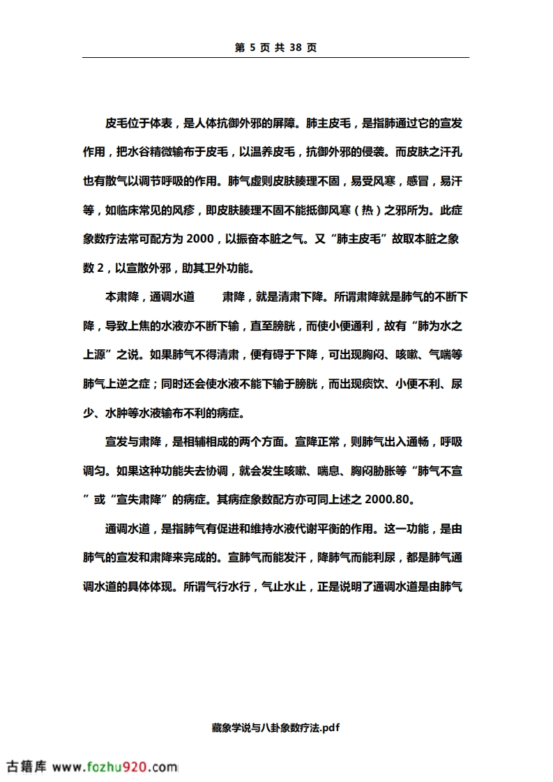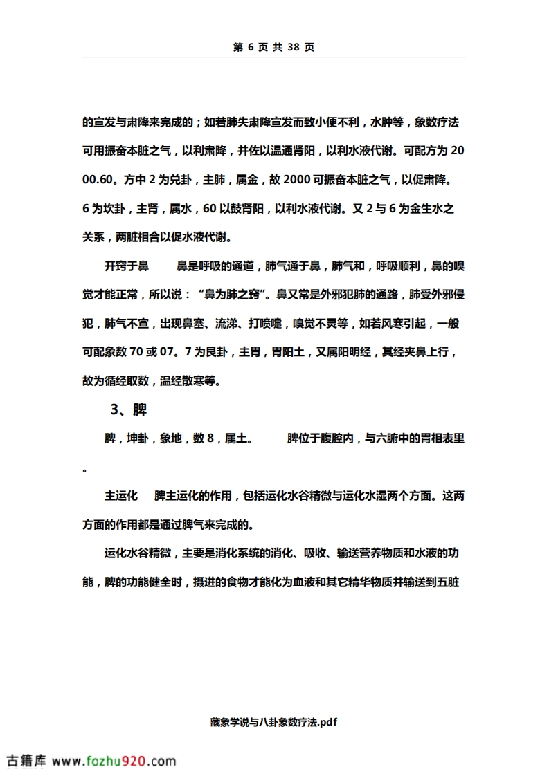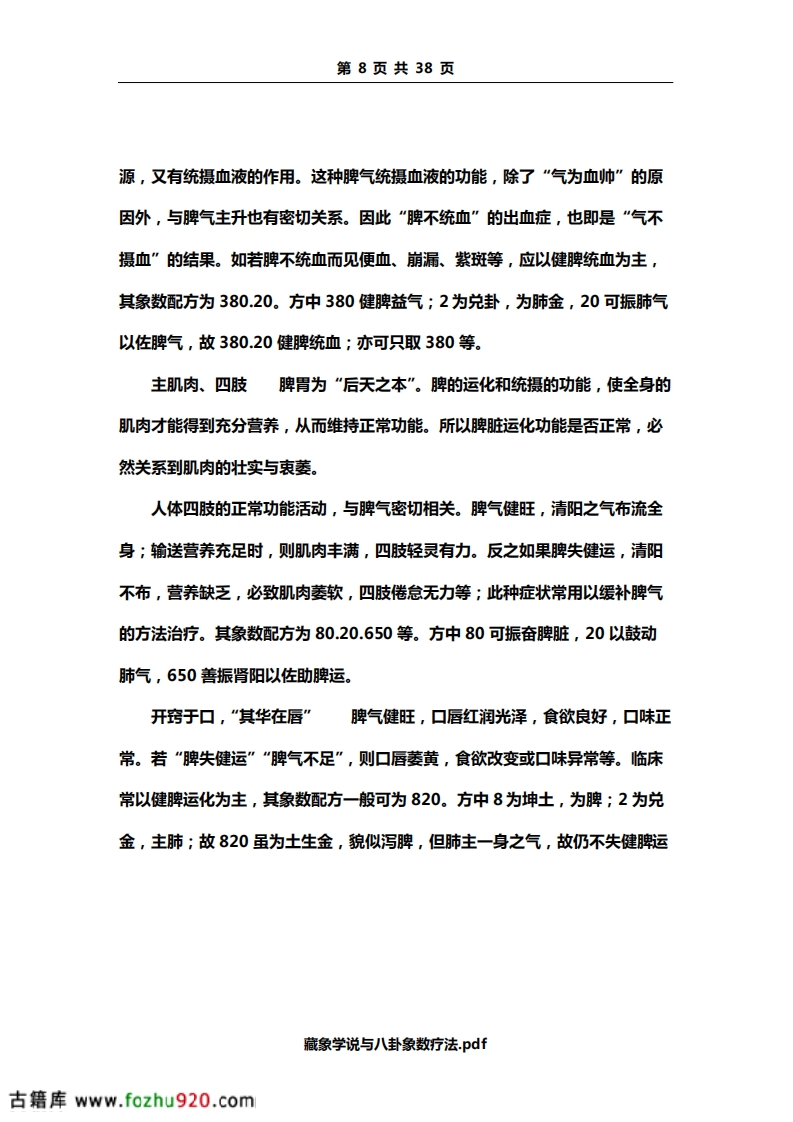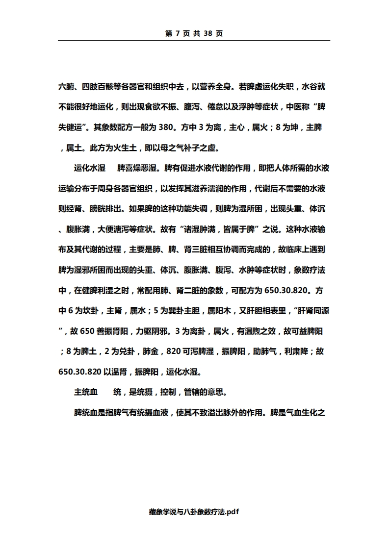 第2页共38页全身的功能。脉是血液运行的通道,血液运行于脉道中,主要靠心气的推动,故有“气行血亦行”,“气为血之帅,血为气之母”之说。心与血脉相互关联,而面部血脉又较为充盈,所以心气的盛衰,血脉的盈亏变化,可以从脉象和面部的色泽反映出来。如血气旺盛,血脉充盈,则脉象和缓有力,面色红润;心气不足,则脉象空虚,可出现脉象细弱,或节律不整,面色虚白等。若遇此类病症,在象数配方时,应以补益心气为主。常可配方为650。以补肾阳助心气。(650虽为水生木,然肝肾同源,又5为阳木,故实为振奋肾阳。)因脏腑之气源于肾,故肾阳振奋,可助心气。如此配方,往往优于直接补益心脏之气。藏神神,是指人体生命活动的总称。即指人的精神、意识、思维活动。现代生理学认为,人的精神、思维活动,是指大脑的功能,但中医学认为与五脏有关,而主要是心的生理功能。为此,心的功能正常,则神志清楚,精神正常。心的功能发生障碍,就会出现失眠、多梦、健忘等症状,甚或出现精神失常等。上述病症,在一般情况下以健脾安神为主,象数配方为30.80。方中3为离卦,主心;8为坤卦,主脾,又30.80分别为二元中。其补泻之效不著,可振奋所取象数本脏腑之气。故30.80可振心、脾之脏,健脾安神。开窍于舌开窍是指机体同内脏器官与其外部器官或组织的联系。内脏器官的机能状态如何,常通过某外部器官反映出来。心的疾病常反映在舌上。藏象学说与八卦象数疗法.pdf