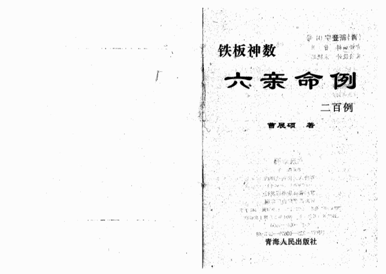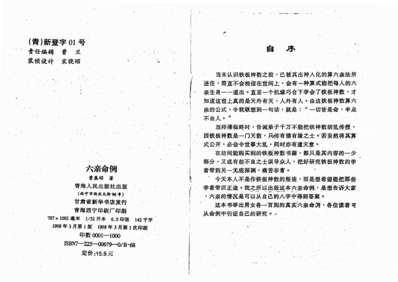 (青)新登字01号责任编辑曹兰自序装领设计“宋晓昭当来认识铁板神数之前·已被其出神入化的算六亲法所迷住·简直不会相信在世间上,会有一种算式能把每人的六亲生肖一一道出·直至一个机缘巧合下学会了铁板神数·才知道这世上真的是天外有天,人外有人·由这铁板神数算六亲的公式,令我联想到一句话,就是:“一切皆是命·半点不由人。”当师傅临终时·告减弟子千万不能把铁神数胡乱传授·因铁板神数是一门天数·凡传有德有缘之士。若妾然将其算式公开·必会令世事大乱·同时亦有遣天意。在坊间能购买到的铁板掉数书精,都只是其内容的一少部分,又或有些不良之士误导众人,把好研究铁板神数的学六亲命例者带到另一无底深湖·痛苦非常·曹展项著今天本人不是作铁板神数的叛徒·而是想希望能把那些青海人民出版杜出版学者带回正途·我之所以出版这本六亲命例·是想告诉大家(西宁有西美大所6手)·六亲的情况是可以从自己的八字中得到答案·甘谢省新华书店发行这本书举出男女各一百则的真实六亲命例·各位读者可青海西宁印制厂印刷从命例中引证自己的研究。:787×10m毫米132开本6.5印张142千字1998年3月第1版1998年3月第1次印刚印数0001一10001sBN7-225-006790/B-68定价15.8元