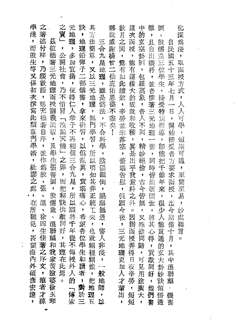 訣,地理铅彈子其方法簡單數月之間這次中的玄空三合九尾地理,授盐,且自出機杼股儒遗三位學生學钱,而般生等又保初次撰寫此類專門學術,紅認之處,在所難免,甚望海内外顶彦宏達,之著迹付梓,巧殺數語,姑充著自序,並作為般、張、溫、徐四生佳著之序文,筆者才又以三元党有如此有道樣,包兹值批著三元地理函授講義出版,及學生張書圖,殷儒童、溫聯福和我家黄脸婆徐玉琴之寳」,公開社會,乃不惜肾「没漏天機』之罪,而把私铁供獻同好,其理在此焉元地理,多加宣揚,使得仁人老子不再相信三合九具二部儒書那就威謝揚會二仙庇佑恩德不地理,拿來研智是儒法效萬象成突!勞和收發並各撰著三元地理,以偽創獎,宝堪痛心各入不同,精妙絕偷,古令皆無化深為淡,取國授方式,人人可學,短期可通,至简至易,妙這難言。所以篮將千年從不傅授外人,希昱各位學生和職者無門學習,所以明知其非正統工尖,也就期裡潮酿,把地理五,不合科學,陰陽頭倒,禍福無憑,害人非淺,一般地師,並未落空,差堪告慰,但顾个後,三元地理更加人才辈出,,興是出乎我意料之外。因辦面授弄得日校辛勞,短短,又殊途同歸,可見用途廣大册,同時皆出版間世,將其心得,贡默同好,他們書接受特别指導,即能把千餘年來,很少人能賞通的玄大卦妙欲領悟透自民國五十三年七月一日,開始接受各方要求臨授,范令期僅十月,其中源聯福·眼書的「傳家,對於三