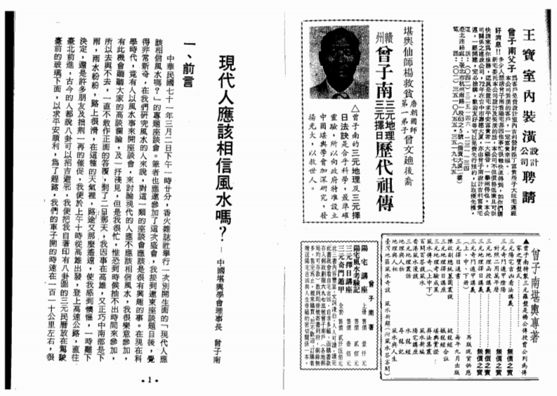 一、前言:豪前的玻璃下面,以求平安质利,為了趣路,我們的軍子關的時速在一百一十公里左右,很豪北前進,古今的人都就八卦可以招杏避邪,我便把我自著印有八卦圖的三元民断放在解映啊,雨水粉粉,臻上很滑,在這種的天解视,路途又那聚羞速,使我感到情低,一時難下决定,還是許多朋友及抽荆一再的催促,我便於上午十時從高雄出發,登上高速公路,直往有此观會雕鞘大家的高談福論,及一抒淡見,但是我很忙,性恐到時候抽不出時間來參加,所以去興不去,一直不敢作正面的答覆,剩了二品那天,我因事在高雄,又正巧中南部是下學時代,竞有人以凰水事来開座谈會,来时論现代的人適不應談相宿風水,我很樂意加,得非常新奇,在我們研究風水的人来就,對這一類的座談會應酸是很有興趣的事·在現在科酸相信風水嗎?』的專题座談會。筆者也雅邀参加了這衣盛會,我接到迷東座談题目後,覺中華民國七十一年三月二日下午一時廿分,香火離就此摩行一次别期生面的現代人患現代人應該相信風水嗎?杨光大,以敢世人。中國堪典学會加深研究,精蜜验,所以向政府种准設日法铁是合乎科學,最準唯△賞子南的三元地理及三元舞雅會子南體歷代祖傳遇,一随,定必拾,重和友好等可以免先行的国之建公司,2年在雷中市大量,水由子南政計吉富黄轩清息电本公司款计及的,水公司不快你服,风是宅求平安富黄者一大编音,一用得也。本公多少人子毛因事忙快速得到,你公司黄的戶,一定富黄幸幅王寶室内装潢24P聘請水无无丝y中國沭奥学會理事長子南三元奇門道甲三元日满座地地宅人人厘水水老验配考译机水奇上目水甲六九七子镜上南想不全书售水新解(附水客)曾子南堪輿專著人生合业无寿平九月出版五雪子南种蒙三无最型是杨公得校营公到為得無值之寶