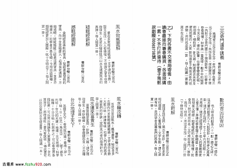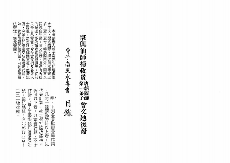 法游理,簡此拳聞。如貴書局要代销的話,可依後面貌傳,今年起即决定交各地書局代销,十敦促,為使該者糯間方便,並酱流只是自己零售,今受會友們及各界人的若述,拒為讀者喜愛與霸美,從前詞港白生動,圖文並茂,且是有系统多,冠古冠今,暢銷國内外,因其文水工夫,聞名國際,摸這風水專答之本會创辦人曾子南先生的塔與国曾子南風水專書三二一孫信箱。德,通訊地址:台北那政八四!打折·曾子常那按檬户00069738伍册以下者,以零售計算,不予代销計算,依定價打陸折侵待。,凡每一種驛满陸册以上者,以甲、下列各警歌迎普局代销景曾文迪後奇