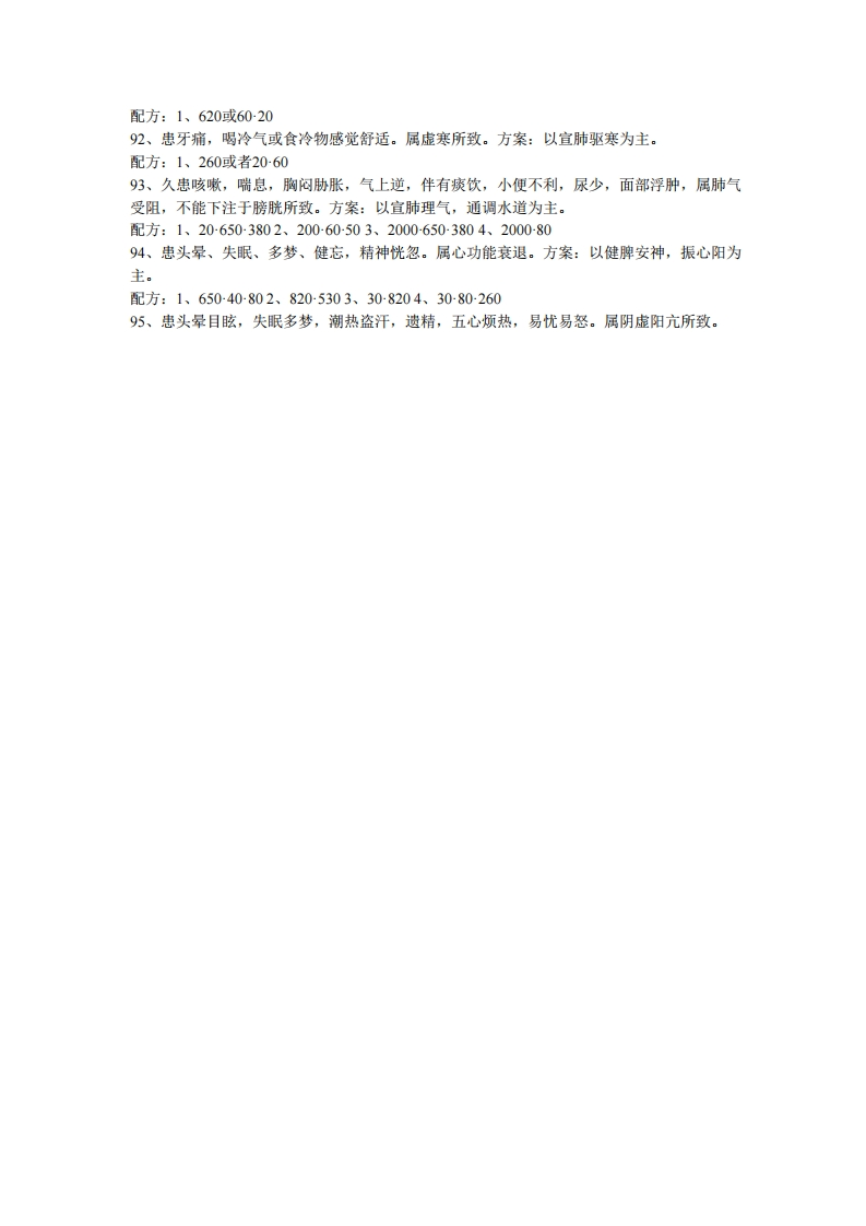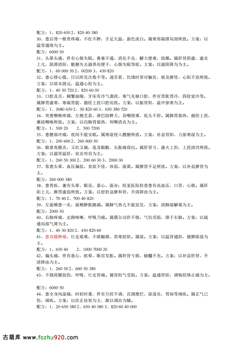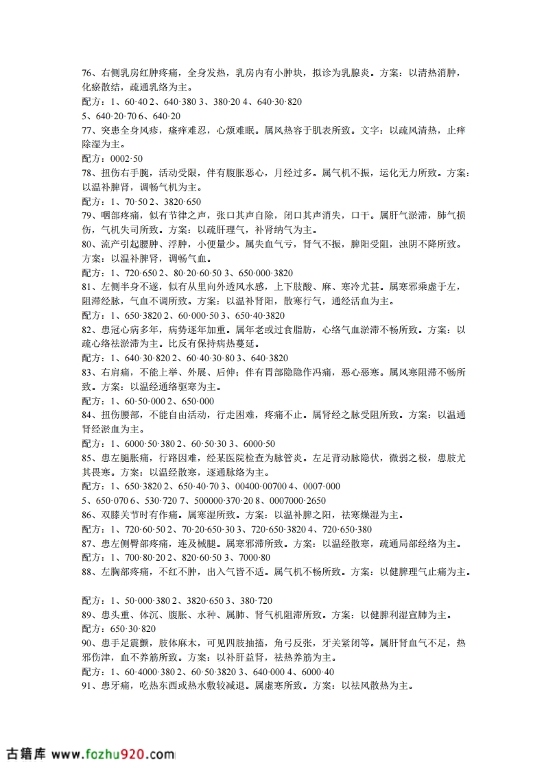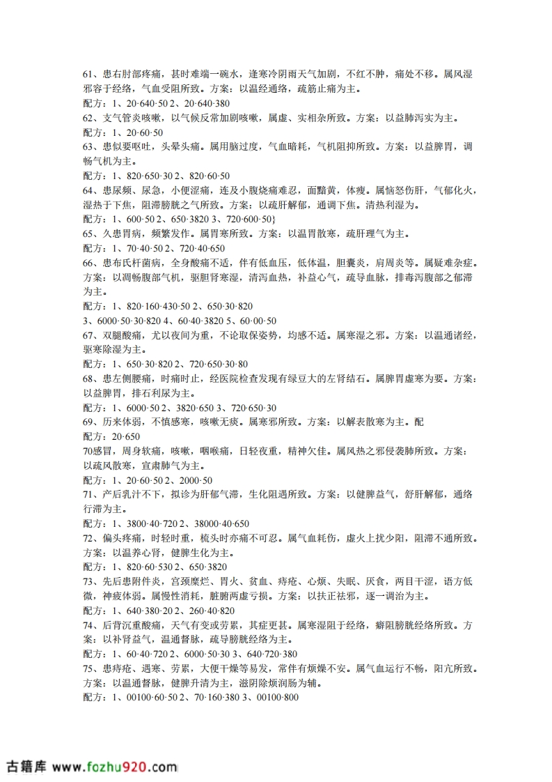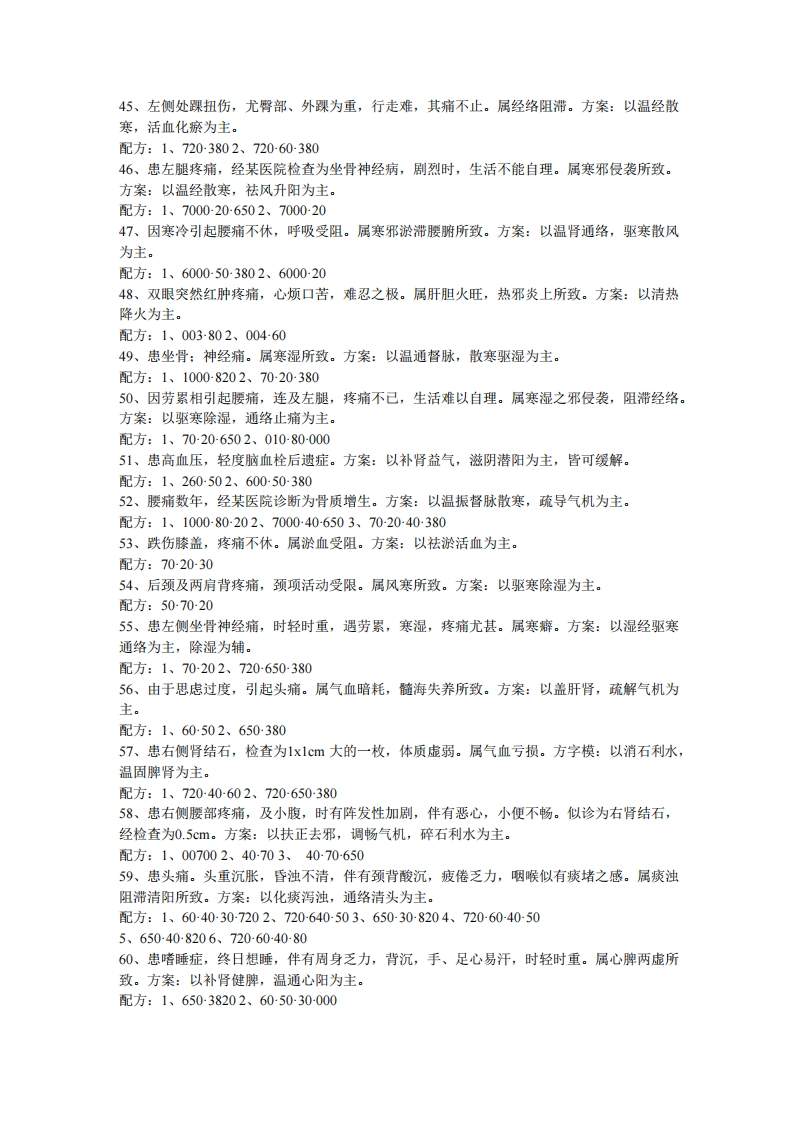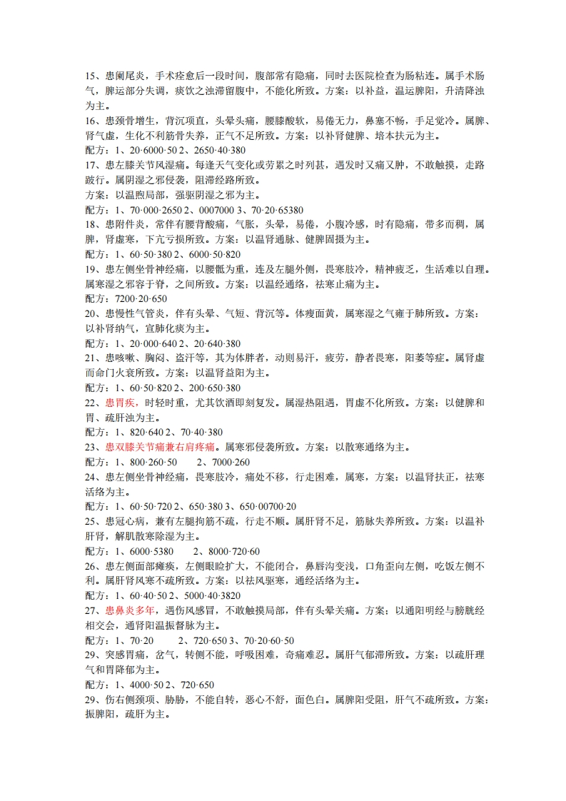 15、患阑尾炎,手术痊愈后一段时间,腹部常有隐痛,同时去医院检查为肠粘连。属手术肠气,脾运部分失调,痰饮之浊滞留腹中,不能化所致。方案:以补益,温运脾阳,升清降浊为主。16、患颈骨增生,背沉项直,头晕头痛,腰膝酸软,易倦无力,鼻塞不畅,手足觉冷。属脾、肾气虚,生化不利筋骨失养,正气不足所致。方案:以补肾健脾、培本扶元为主。配方:1、206000502、265040-38017、患左膝关节风湿痛。每逢天气变化或劳累之时列甚,遇发时又痛又肿,不敢触摸,走路跛行。属阴湿之邪侵袭,阻滞经路所致。方案:以温煦局部,强驱阴湿之邪为主。配方:1、70-000-26502、00070003、70-20-6538018、患附件炎,常伴有腰背酸痛,气胀,头晕,易倦,小腹冷感,时有隐痛,带多而稠,属脾,肾虚寒,下亢亏损所致。方案:以温肾通脉、健脾固摄为主。配方:1、60503802、600050-82019、患左侧坐骨神经痛,以腰骶为重,连及左腿外侧,畏寒肢冷,精神疲乏,生活难以自理。属寒湿之邪容于脊,之间所致。方案:以温经通络,祛寒止痛为主。配方:72002065020、患慢性气管炎,伴有头晕、气短、背沉等。体瘦面黄,属寒湿之气雍于肺所致。方案:以补肾纳气,宣肺化痰为主。配方:1、20-000-6402、20-640-38021、患咳嗽、胸闷、盗汗等,其为体胖者,动则易汗,疲劳,静者畏寒,阳萎等症。属肾虚而命门火衰所致。方案:以温肾益阳为主。配方:1、60-50-8202、20065038022、患胃疾,时轻时重,尤其饮酒即刻复发。属湿热阻遇,胃虚不化所致。方案:以健脾和胃、疏肝浊为主。配方:1、8206402、704038023、患双膝关节痛兼右肩疼痛。属寒邪侵袭所致。方案:以散寒通络为主。配方:1、800260502、7000-26024、患左侧坐骨神经痛,畏寒肢冷,痛处不移,行走困难,属寒,方案:以温肾扶正,祛寒活络为主。配方:1、60507202、6503803、65000700-2025、患冠心病,兼有左腿拘筋不疏,行走不顺。属肝肾不足,筋脉失养所致。方案:以温补肝肾,解肌散寒除湿为主。配方:1、600053802、8000720-6026、患左侧面部瘫痪,左侧眼睑扩大,不能闭合,鼻唇沟变浅,口角歪向左侧,吃饭左侧不利。属肝肾风寒不疏所致。方案:以祛风驱寒,通经活络为主。配方:1、6040502、500040-382027、患鼻炎多年,遇伤风感冒,不敢触摸局部,伴有头晕关痛。方案:以通阳明经与膀胱经相交会,通肾阳温振督脉为主。配方:1、70202、7206503、7020-605029、突感胃痛,岔气,转侧不能,呼吸困难,奇痛难忍。属肝气郁滞所致。方案:以疏肝理气和胃降郁为主。配方:1、4000502、72065029、伤右侧颈项、胁胁,不能自转,恶心不舒,面色白。属脾阳受阻,肝气不疏所致。方案:振脾阳,疏肝为主。
