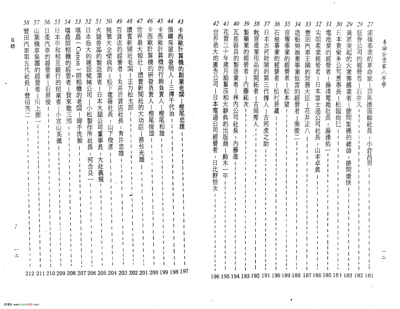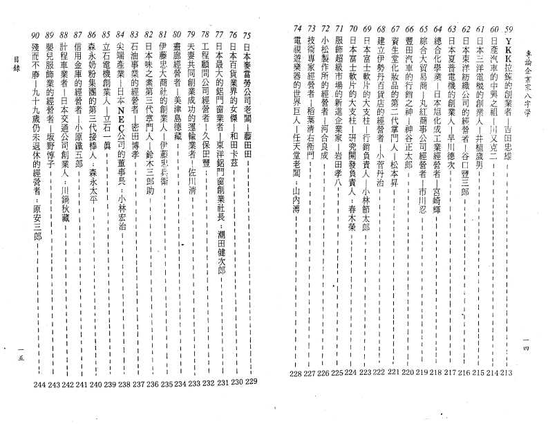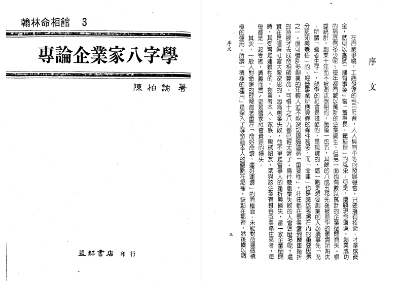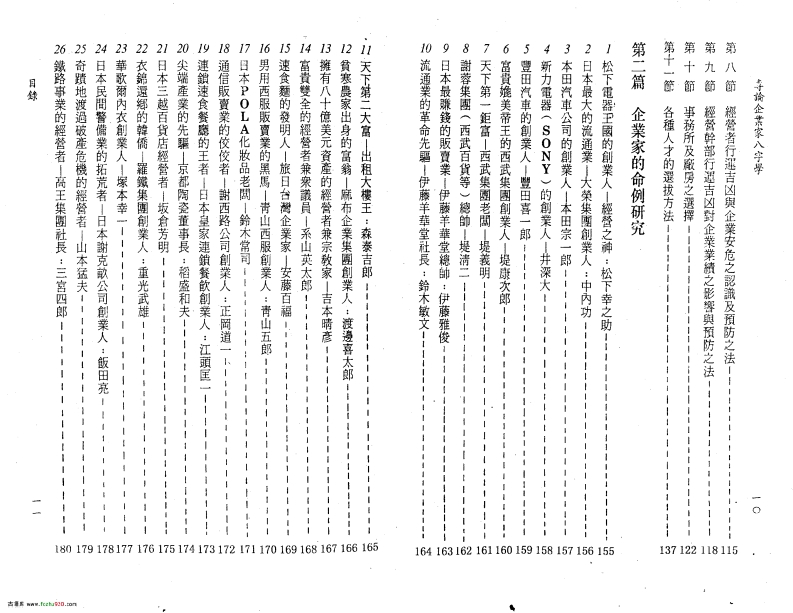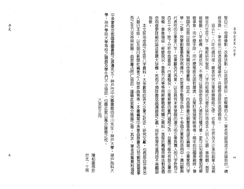 指教。序文學,神戶學院大學等校之戰員及學生门不少協動,也藉此致以萬分謝意之枕。中承蒙東京都國會图書館之渡迹先生,神戶市中央害館的中川先生。神戶大學,神戶商科大長之全力支持與鼓舞,益群書店同□協助,謹籍此致萬分感謝之意。其次,筆者收集資料過程人绿日本版,以及朝日新聞社桶著之人物事典等等。本書編寫中承蒙益群書店公司劉英富蟹事命例做更詳細的論远是最大缺憾。若有不须群盡或疏漏錯误之處,尚新命理先進同好不各殇函規模、事菜頜域、經營现況,發展方向等等與經營戰略有糊之資料。唯限於篇帽而無法對各個百五十名,除了分析命這喜忌,行蓮概况,企菜經營的套門過程之外,並毒可能分析該企業的代表性的企業家八字,並余顧各行各業,以及具有未來發展的潜力的企業負黄人的八字計有三學」之事,欣蒙副董事長欣然應允,於是著手整理手頭上一千多個企業家的命例中,選出松具現國内並無出版與企茉有鹏的命理書籍,因此,向益群書店劉量事長提及编寫「企業家的八字營事業,用什發手段、用什麼戀度去面對環境、去策訂發展策略等等。兩年前回國探观時,發經誉觀。八字结構、行運状况,不懂可以顶現命适本人適於何種行業,更可以知道他會如何經營者的生辰八字,幾經研究發现,八字的粗辑狀况會反映於命這本人的人生觀、事物觀,甚至極意義」·筆者努力地透酒各種楊合,各種营道鼓吹這個觀念。整自己。發挥優點,改善缺點,以這就更美好、更嫘燃的人生。筆者常認為這才是瑜命的「積專岭企業家八字學乙亥年正月本文珠用命例之生最八字資料,大多数取自各大企業之社史、研究文獻,也有取自世界名過去七、八年的歲月裡,籍著研究企業經營戰略之使,收集了世界各大企業的創業人或經台北·士杯陳柏諒序於