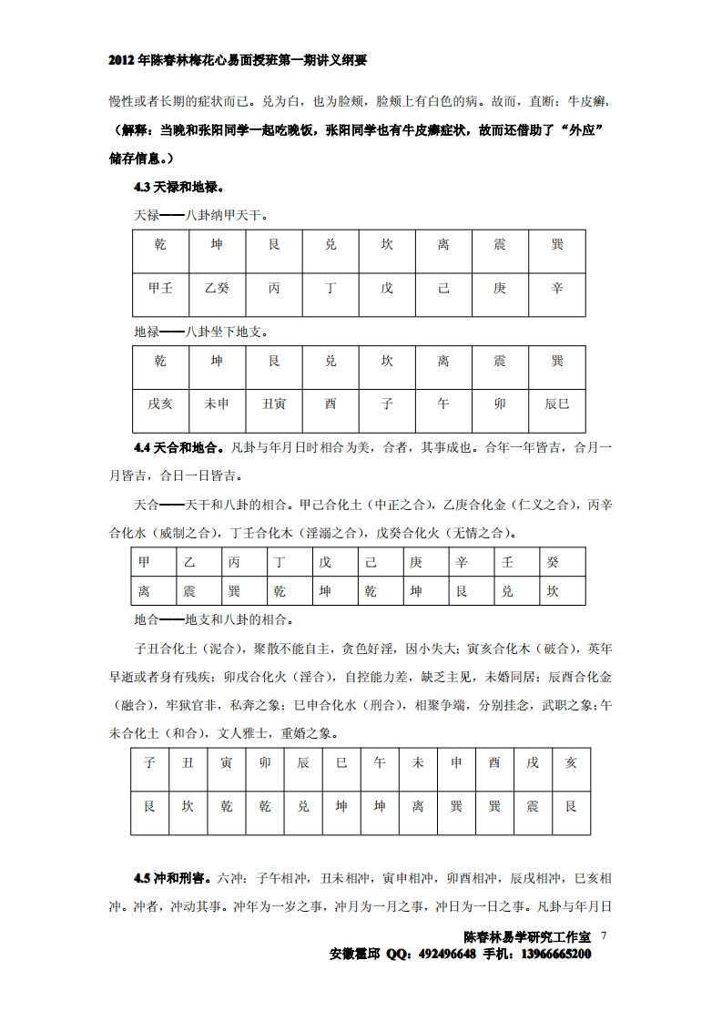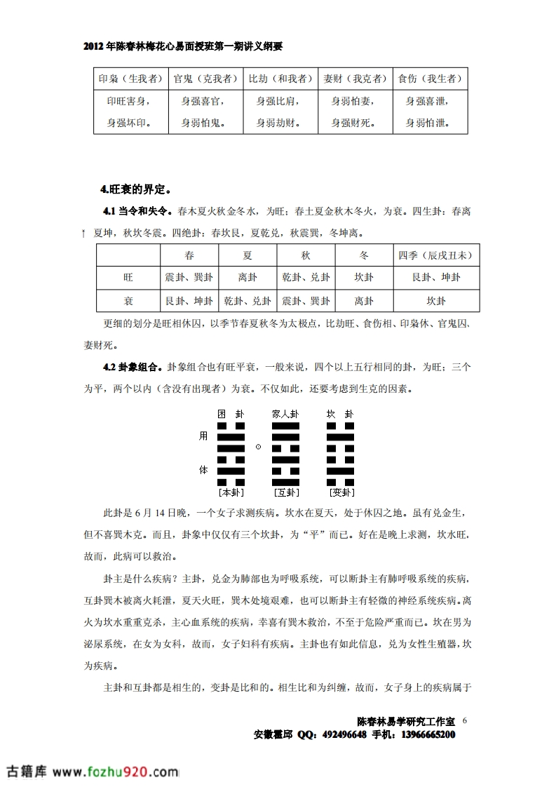 2012年陈春林梅花心易面授班第一期讲义纲要第一讲再谈体用1.定性和定量梅花离不开体用,体用是大格局之定位。体卦是主,用卦是宾。体卦可以对应具体求测的人和事,用卦是外部环境(人事、器物、时间、环境)。体用之使用,在梅花易中有定性的作用:卦象组合揭示的是定量。定性:宏观的吉凶成败之判定。如建房、投产、婚姻、求财等事项的整体吉凶成败。定量:微观的得失顺逆之分析。如开始、过程和结局所遇到的各种事情。定性好比说一个人是好是坏,品质素养如何?定量就是对此人进一步分析。如好中藏坏,坏中藏好。我们常说,阴中有阳,阳中有阴。一个十恶不赦的坏人,没准也有人品中的优点:一个美誉盛传的人,没准也有贪财好色的瑕疵。体卦和用卦组合,不外乎五种关系:生克比耗泄。生:就是用卦生体卦。“生”是一种付出、关心、帮助、支撑的信息提现。有贵人相助、意外得财、事业亨通、求谋顺利等信息。克:用卦克制体卦。“克”是遇到阻碍、困难压力、轻则口舌是非,重则伤病逢灾。比:体卦和用卦比和。“比”是如鱼得水,难中有助之意。耗:体卦克用卦。“耗”是自己操心费力,克服困难,或得之艰难,甚至得之无益。泄:体卦生用卦。“泄”是被动付出、破财损失。从性格上看,有施舍心、仁慈心,乐于助人。震卦蹇卦复卦■■■■■■用■■■■■■■■体■■[本卦]互卦][变卦]这个卦,体卦和用卦比和。体卦为得到帮扶,人缘好,外部环境给卦主创造了得天独厚的优势。如果测投资,主卦震卦和震卦比和,这是合伙的生意。互卦艮土克坎水,得财艰难,需要克才可以得到。变卦也是如此。震木克坤土,也需要克。这是大的格局判断,也是定性问题。如果要挖掘细节,震为动,为奔走,所做的事情奔波比较大。也可以说,在奔波中得财。互卦中坎水是艮土的财。可以说,财和坎水有关。坎为车,为流动,也为酒水。我们要陈春林易学研究工作室2安徽量邱QQ:492496648手机:13966665200