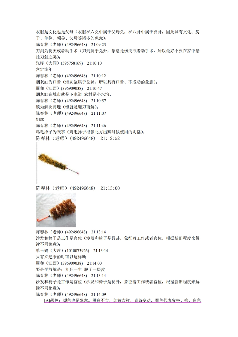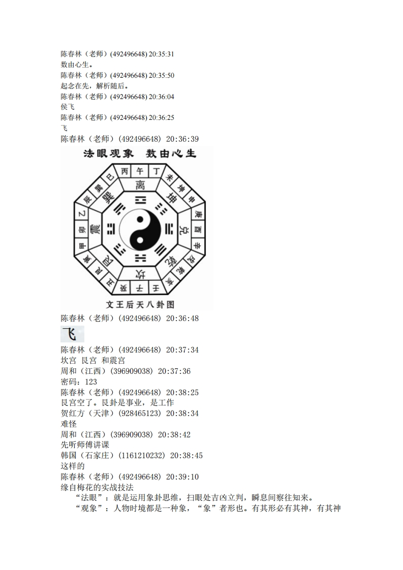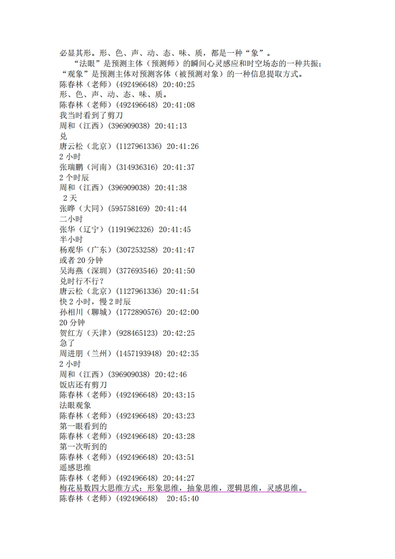 必显其形。形、色、声、动、态、味、质,都是一种“象”。“法眼”是预测主体(预测师)的瞬间心灵感应和时空场态的一种共振:“观象”是预测主体对预测客体(被预测对象)的一种信息提取方式。陈春林(老师)(492496648)20:40:25形、色、声、动、态、味、质。陈春林(老师)(492496648)20:41:08我当时看到了剪刀周和(江西)(396909038)20:41:13兑唐云松(北京)(1127961336)20:41:262小时张瑞鹏(河南)(314936316)20:41:372个时辰周和(江西)(396909038)20:41:382天张晔(大同)(595758169)20:41:44二小时张华(辽宁)(1191962326)20:41:45半小时杨观华(广东)(307253258)20:41:47或者20分钟吴海燕(深圳)(377693546)20:41:50兑时行不行?唐云松(北京)(1127961336)20:41:54快2小时,慢2时辰孙相川(聊城)(1772890576)20:42:0020分钟贺红方(天津)(928465123)20:42:25急了周进朋(兰州)(1457193948)20:42:352小时周和(江西)(396909038)20:42:46饭店还有剪刀陈春林(老师)(492496648)20:43:15法眼观象陈春林(老师)(492496648)20:43:23第一眼看到的陈春林(老师)(492496648)20:43:28第一次听到的陈春林(老师)(492496648)20:43:51遥感思维陈春林(老师)(492496648)20:44:27梅花易数四大思维方式:形象思维,抽象思维,逻辑思维,灵感思维。陈春林(老师)(492496648)20:45:40