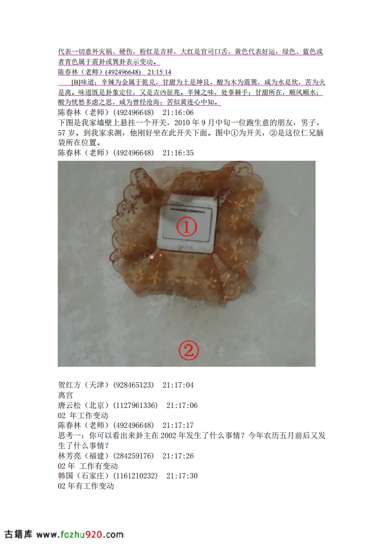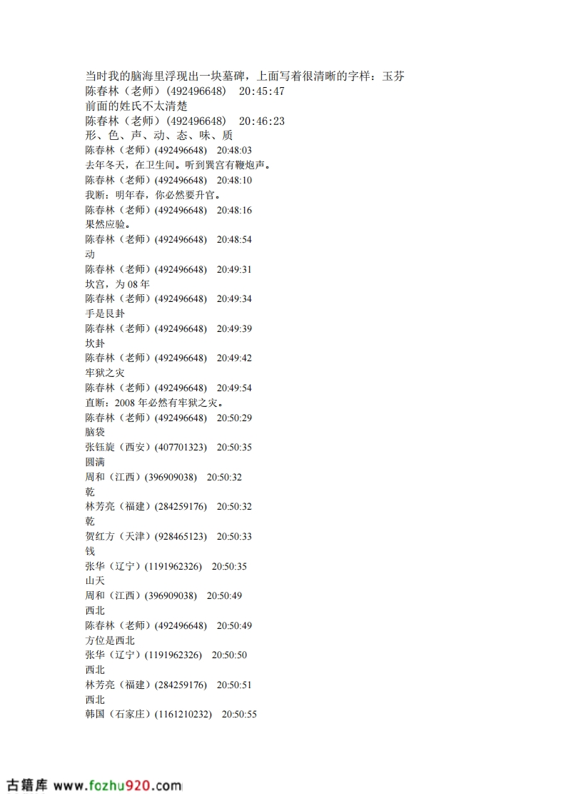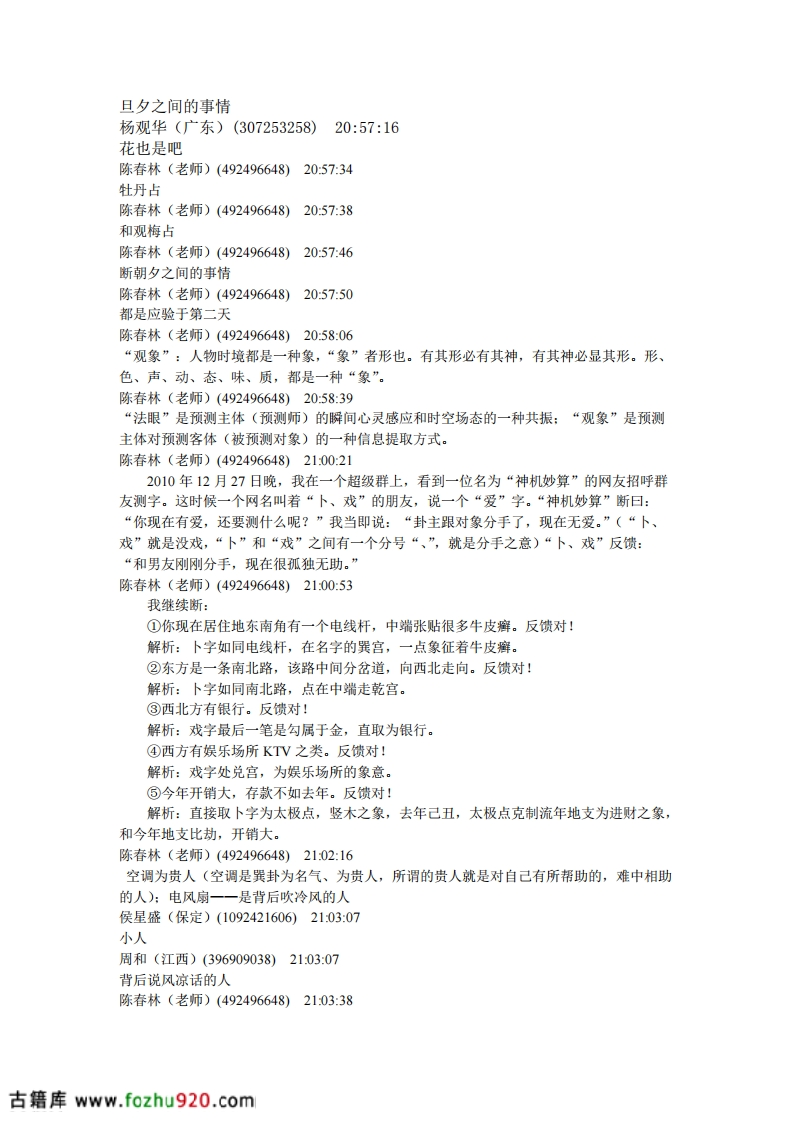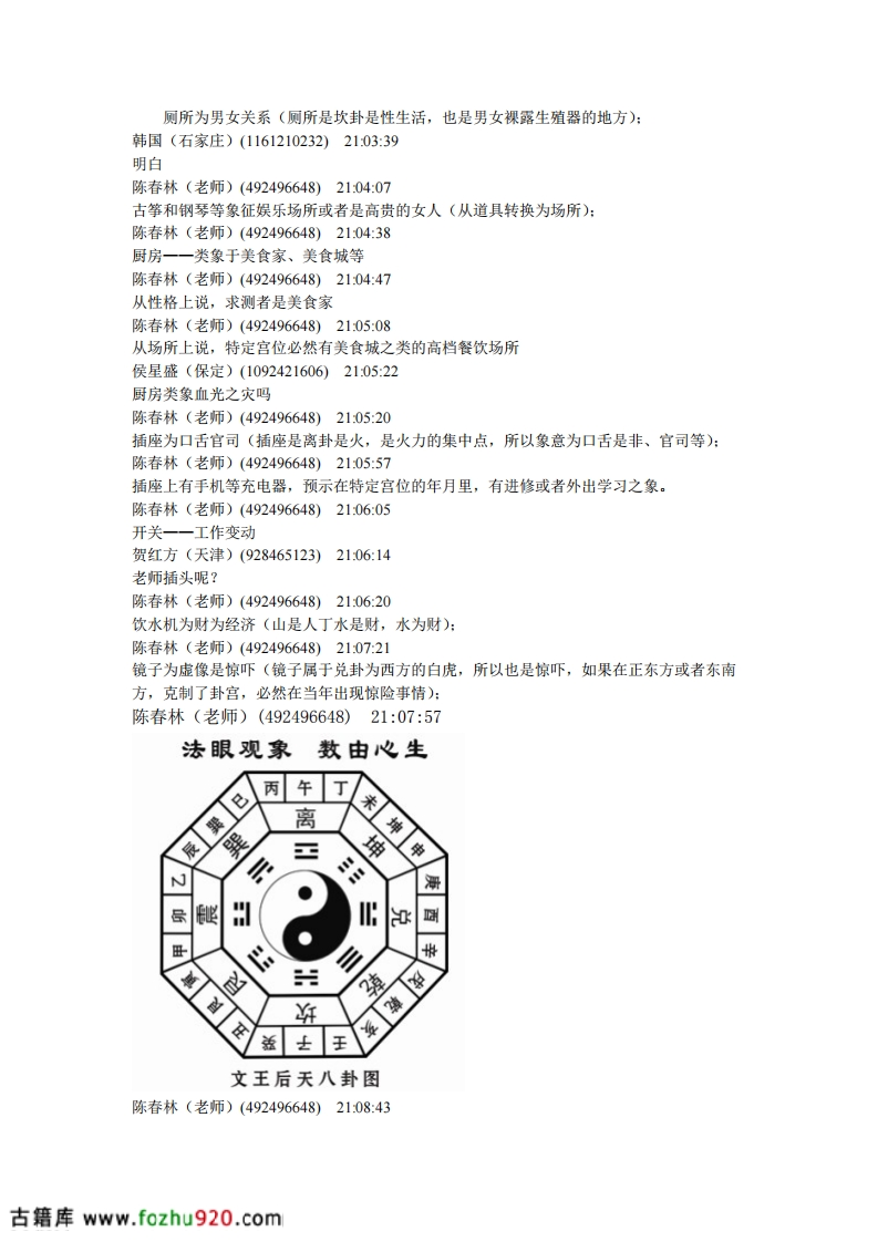 必显其形。形、色、声、动、态、味、质,都是一种“象”。“法眼”是预测主体(预测师)的瞬间心灵感应和时空场态的一种共振:“观象”是预测主体对预测客体(被预测对象)的一种信息提取方式。陈春林(老师)(492496648)20:40:25形、色、声、动、态、味、质。陈春林(老师)(492496648)20:41:08我当时看到了剪刀周和(江西)(396909038)20:41:13兑唐云松(北京)(1127961336)20:41:262小时张瑞鹏(河南)(314936316)20:41:372个时辰周和(江西)(396909038)20:41:382天张晔(大同)(595758169)20:41:44二小时张华(辽宁)(1191962326)20:41:45半小时杨观华(广东)(307253258)20:41:47或者20分钟吴海燕(深圳)(377693546)20:41:50兑时行不行?唐云松(北京)(1127961336)20:41:54快2小时,慢2时辰孙相川(聊城)(1772890576)20:42:0020分钟贺红方(天津)(928465123)20:42:25急了周进朋(兰州)(1457193948)20:42:352小时周和(江西)(396909038)20:42:46饭店还有剪刀陈春林(老师)(492496648)20:43:15法眼观象陈春林(老师)(492496648)20:43:23第一眼看到的陈春林(老师)(492496648)20:43:28第一次听到的陈春林(老师)(492496648)20:43:51遥感思维陈春林(老师)(492496648)20:44:27梅花易数四大思维方式:形象思维,抽象思维,逻辑思维,灵感思维。陈春林(老师)(492496648)20:45:40