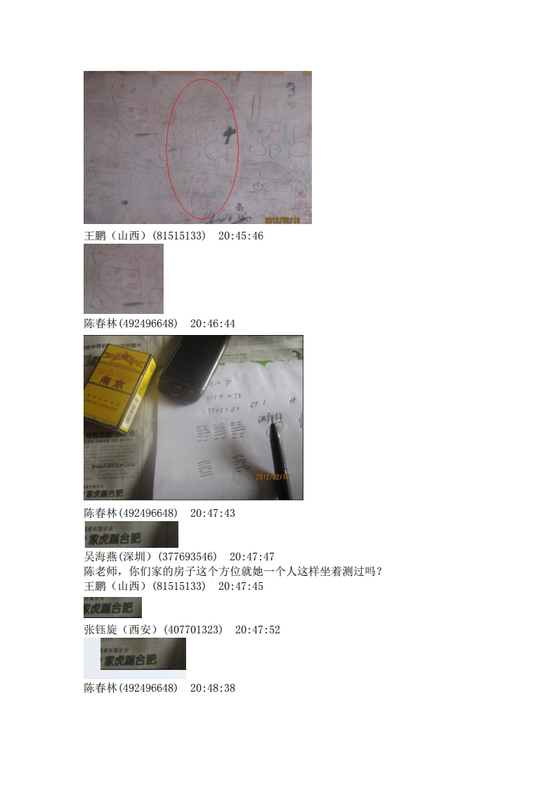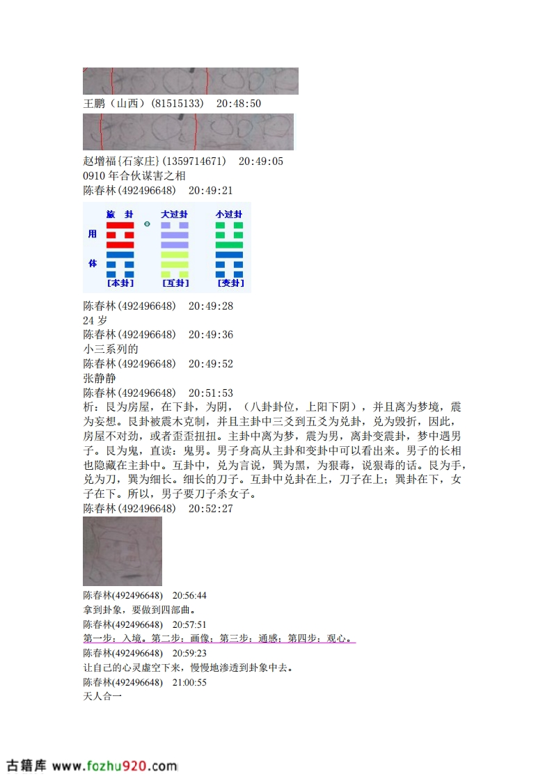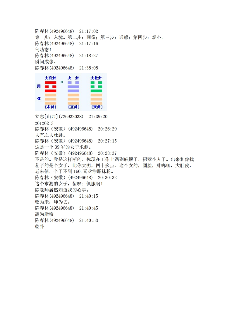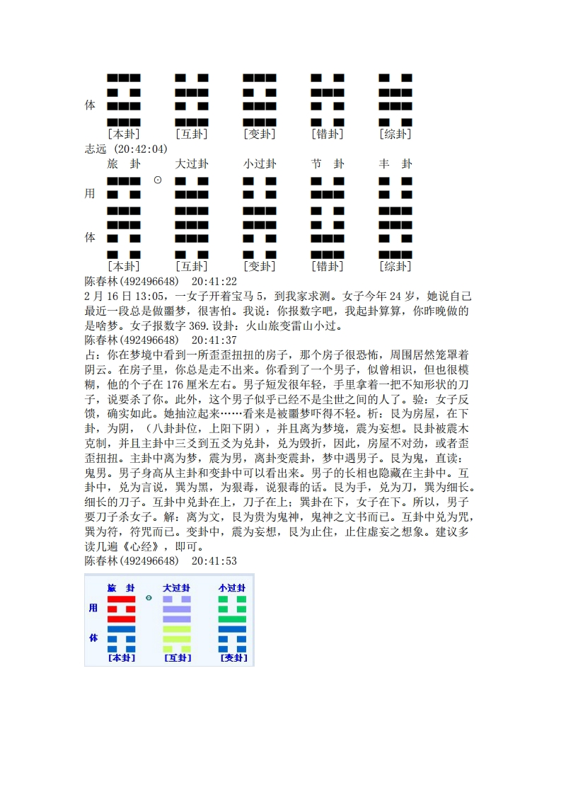体■■■■[本卦][互卦][变卦][错卦][综卦]志远(20:42:04)旅卦大过卦小过卦节卦丰卦⊙■■■■■用■■◆■■■体■■■[本卦][互卦][变卦][错卦][综卦]陈春林(492496648)20:41:222月16日13:05,一女子开着宝马5,到我家求测。女子今年24岁,她说自己最近一段总是做噩梦,很害怕。我说:你报数字吧,我起卦算算,你昨晚做的是啥梦。女子报数字369.设卦:火山旅变雷山小过。陈春林(492496648)20:41:37占:你在梦境中看到一所歪歪扭扭的房子,那个房子很恐怖,周围居然笼罩着阴云。在房子里,你总是走不出来。你看到了一个男子,似曾相识,但也很模糊,他的个子在176厘米左右。男子短发很年轻,手里拿着一把不知形状的刀子,说要杀了你。此外,这个男子似乎已经不是尘世之间的人了。验:女子反馈,确实如此。她抽泣起来…看来是被噩梦吓得不轻。析:艮为房屋,在下卦,为阴,(八卦卦位,上阳下阴),并且离为梦境,震为妄想。艮卦被震木克制,并且主卦中三爻到五爻为兑卦,兑为毁折,因此,房屋不对劲,或者歪歪扭扭。主卦中离为梦,震为男,离卦变震卦,梦中遇男子。艮为鬼,直读:鬼男。男子身高从主卦和变卦中可以看出来。男子的长相也隐藏在主卦中。互卦中,兑为言说,巽为黑,为狠毒,说狠毒的话。艮为手,兑为刀,巽为细长。细长的刀子。互卦中兑卦在上,刀子在上:巽卦在下,女子在下。所以,男子要刀子杀女子。解:离为文,艮为贵为鬼神,鬼神之文书而已。互卦中兑为咒,巽为符,符咒而已。变卦中,震为妄想,艮为止住,止住虚妄之想象。建议多读几遍《心经》,即可。陈春林(492496648)20:41:53封大过封小过封[本封]互封][麦封]