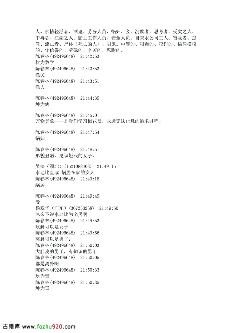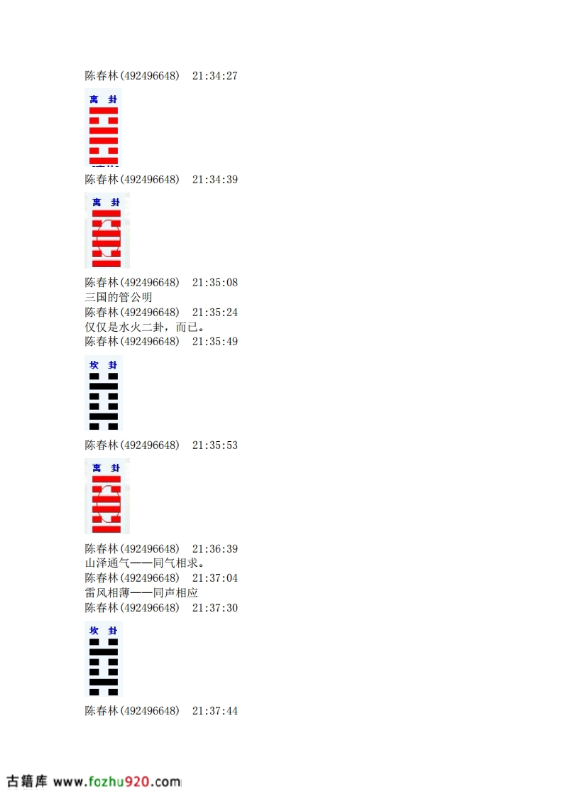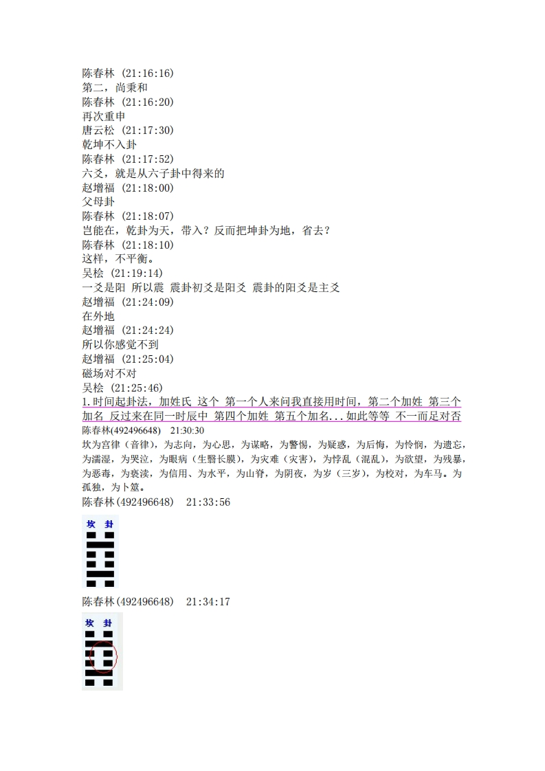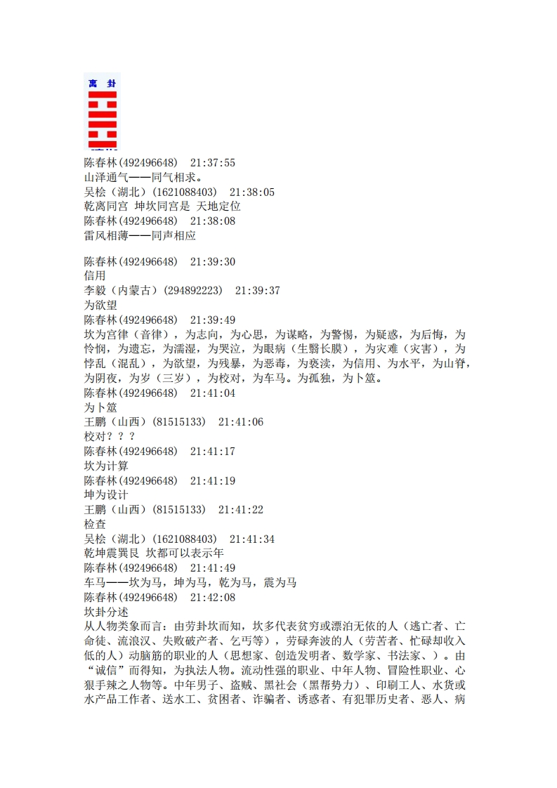 陈春林(21:16:16)第二,尚秉和陈春林(21:16:20)再次重申唐云松(21:17:30)乾坤不入卦陈春林(21:17:52)六爻,就是从六子卦中得来的赵增福(21:18:00)父母卦陈春林(21:18:07)岂能在,乾卦为天,带入?反而把坤卦为地,省去?陈春林(21:18:10)这样,不平衡。吴桧(21:19:14)一爻是阳所以震震卦初爻是阳爻震卦的阳爻是主爻赵增福(21:24:09)在外地赵增福(21:24:24)所以你感觉不到赵增福(21:25:04)磁场对不对吴桧(21:25:46)》1.时间起卦法,加姓氏这个第一个人来问我直接用时间,第二个加姓第三个加名反过来在同一时辰中第四个加姓第五个加名.如此等等不一而足对否陈春林(492496648)2130:30坎为宫律(音律),为志向,为心思,为谋略,为警惕,为疑惑,为后悔,为怜悯,为遗忘,为濡湿,为哭泣,为眼病(生翳长膜),为灾难(灾害),为悖乱(混乱),为欲望,为残暴,为恶毒,为亵渎,为信用、为水平,为山脊,为阴夜,为岁(三岁),为校对,为车马。为孤独,为卜筮。陈春林(492496648)21:33:56坎封陈春林(492496648)21:34:17坎卦