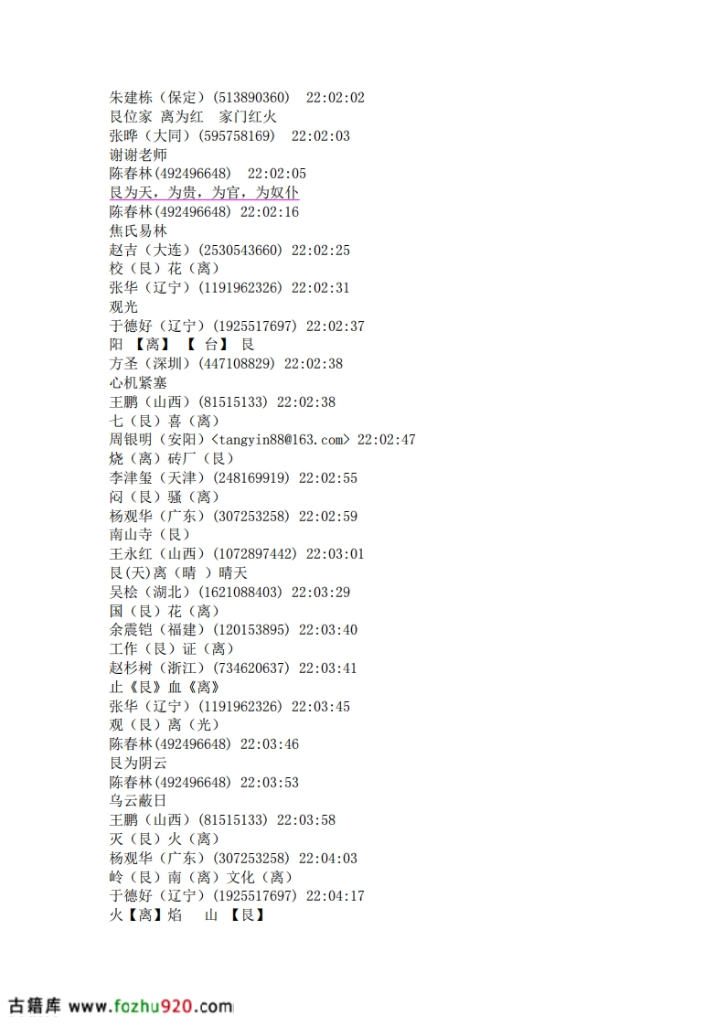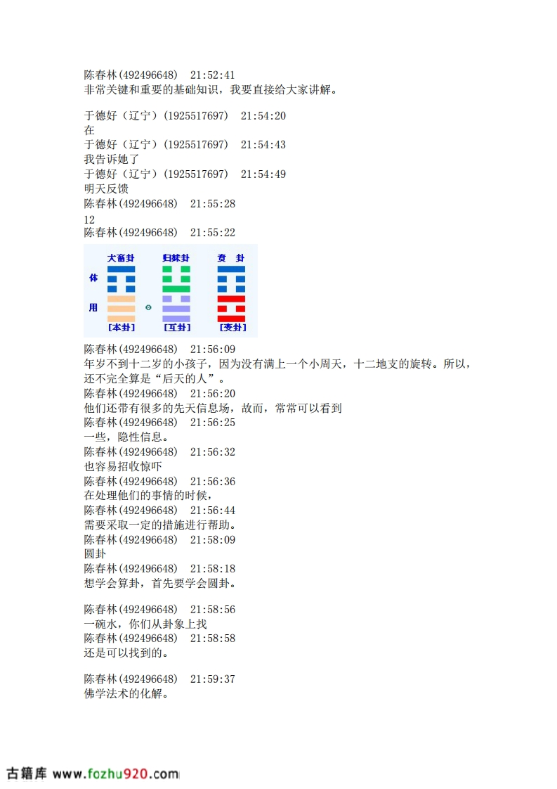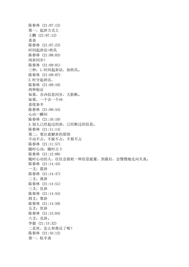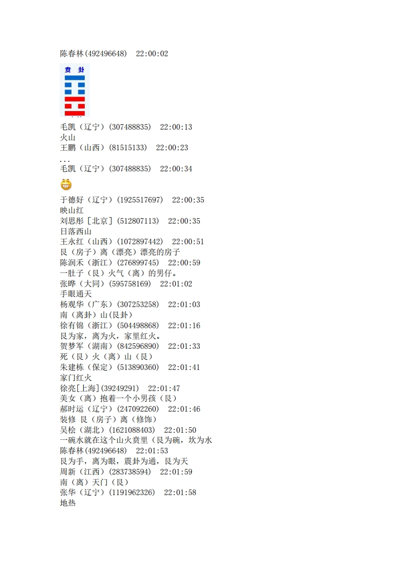 陈春林(21:16:16)第二,尚秉和陈春林(21:16:20)再次重申唐云松(21:17:30)乾坤不入卦陈春林(21:17:52)六爻,就是从六子卦中得来的赵增福(21:18:00)父母卦陈春林(21:18:07)岂能在,乾卦为天,带入?反而把坤卦为地,省去?陈春林(21:18:10)这样,不平衡。吴桧(21:19:14)一爻是阳所以震震卦初爻是阳爻震卦的阳爻是主爻赵增福(21:24:09)在外地赵增福(21:24:24)所以你感觉不到赵增福(21:25:04)磁场对不对吴桧(21:25:46)》1.时间起卦法,加姓氏这个第一个人来问我直接用时间,第二个加姓第三个加名反过来在同一时辰中第四个加姓第五个加名.如此等等不一而足对否陈春林(492496648)2130:30坎为宫律(音律),为志向,为心思,为谋略,为警惕,为疑惑,为后悔,为怜悯,为遗忘,为濡湿,为哭泣,为眼病(生翳长膜),为灾难(灾害),为悖乱(混乱),为欲望,为残暴,为恶毒,为亵渎,为信用、为水平,为山脊,为阴夜,为岁(三岁),为校对,为车马。为孤独,为卜筮。陈春林(492496648)21:33:56坎封陈春林(492496648)21:34:17坎卦