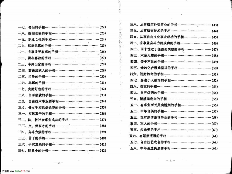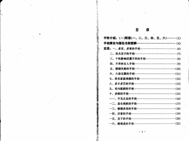 目录手形介绍:(一)附图(一、二、三、四、五、六)…(1)手相掌纹与部位名称图解……………(4)实录:一、多灾,多害的手相…………(6)二、克夫克子的手相………(7)三、个性影响而遭不幸的手相…………(8)四、不幸的女人手相…(9)五、婚烟失败的手相………(10)六、六亲无靠的手相……(11)七、没有家庭美满的手相…(12)八、多才多艺的手相………(13)九、有内驻病的手相(14)十、多病的手相…(们5)一一、不无正业的手相…(16)一二、易生残疾的手相………17)一三、婚烟多变的手相·(18)一四、厉害的手相…(19)一五、克子的手相…(20)一六、婚难成的手相(21)-1-