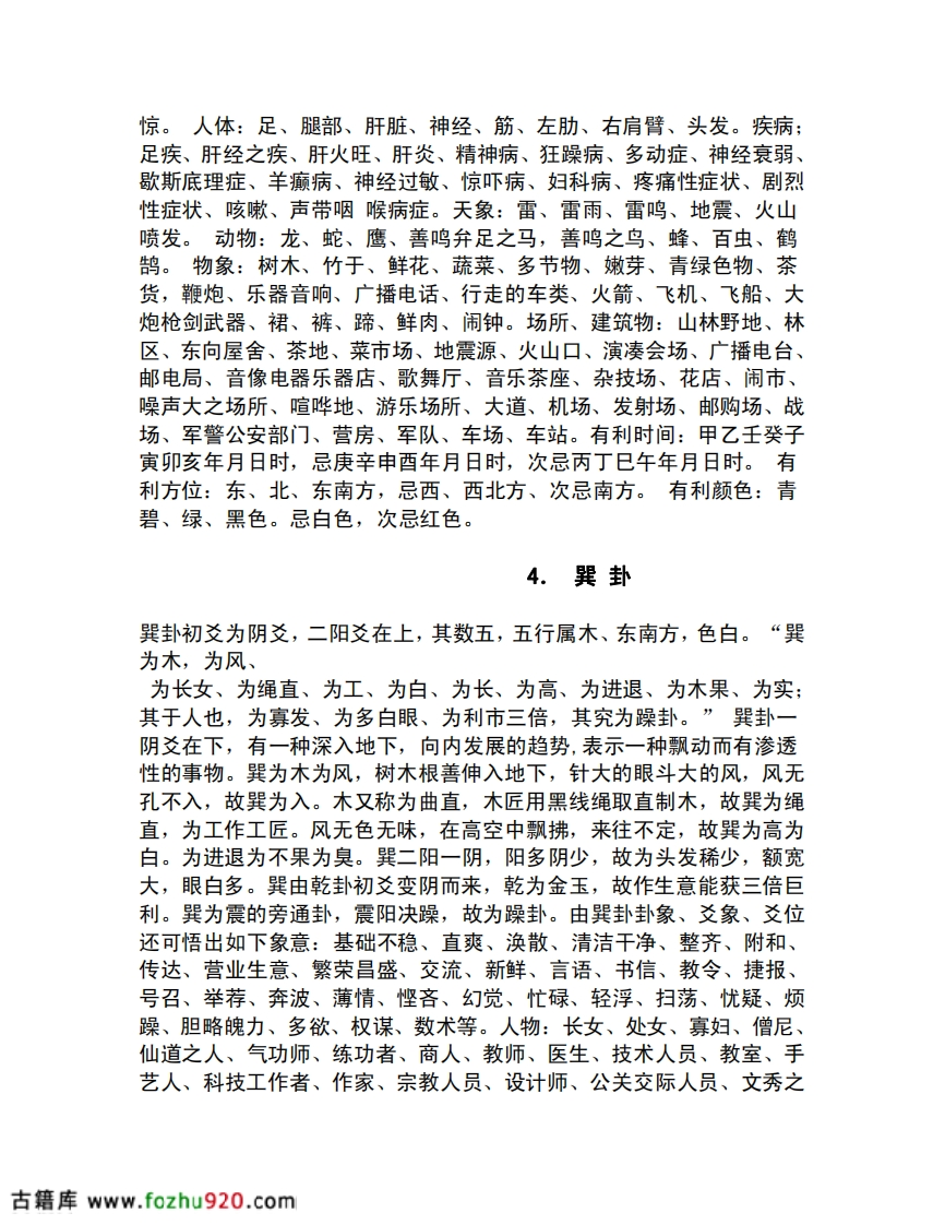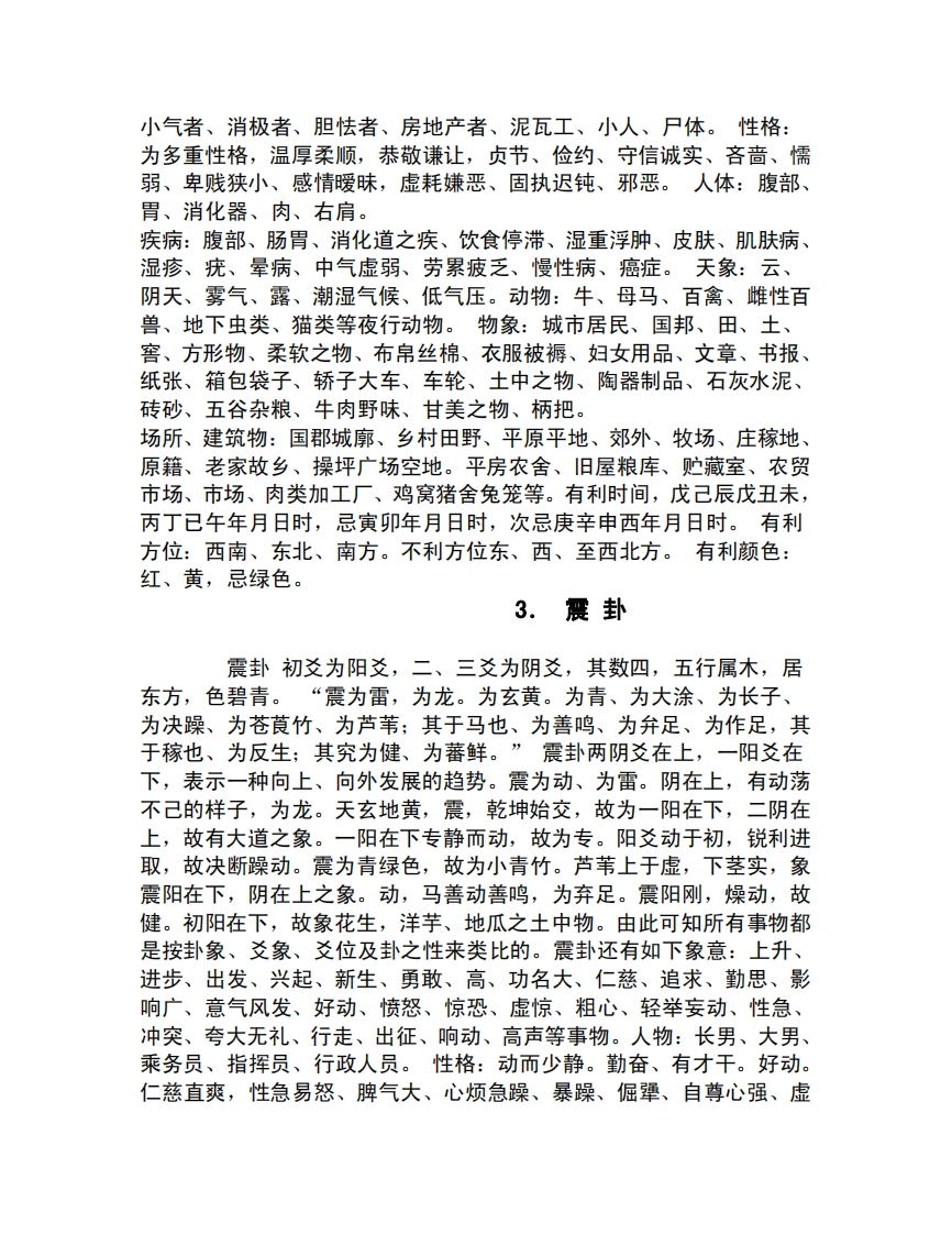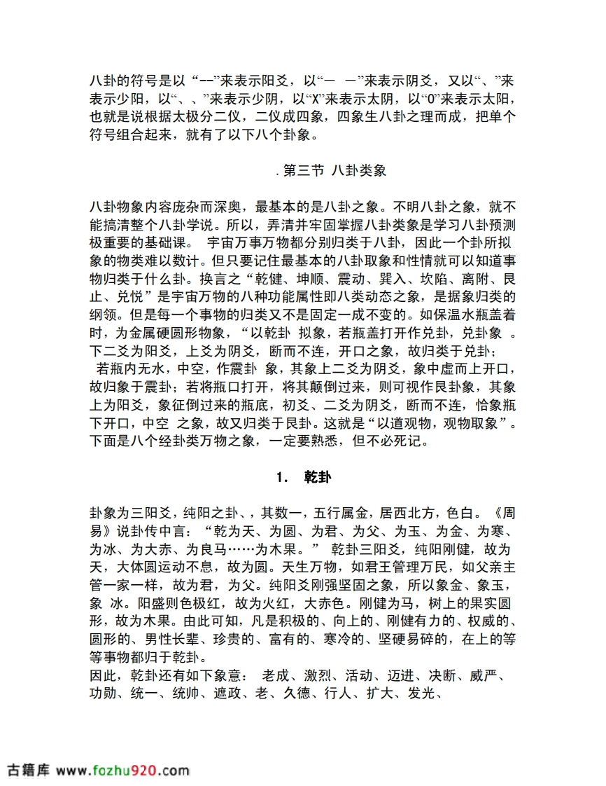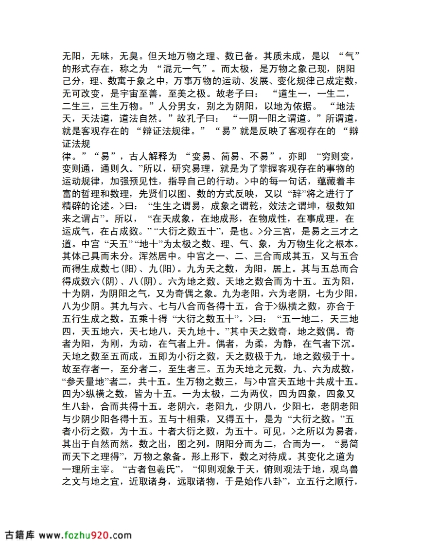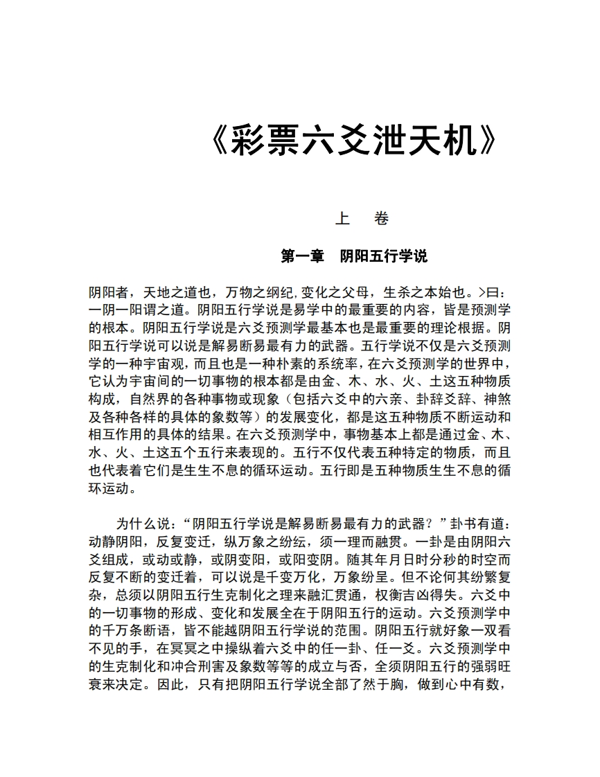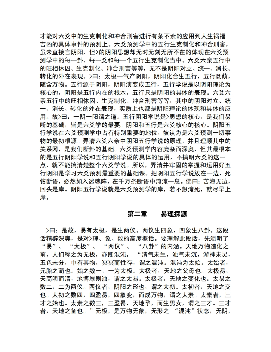 才能对六爻中的生克制化和冲合刑害进行有条不紊的应用到人生祸福吉凶的具体事件的预测上。六爻预测学中的五行生克制化和冲合刑害,虽未直接言阴阳,但>的阴阳思想却无时无刻无所不在的体现在六爻预测学中的每一卦、每一爻和每一个五行生克制化当中。六爻六亲五行中的旺相休囚、生克制化、冲合刑害等等,无不是阴阳对立、统一、消长、转化的外在表现。>曰:太极一气产阴阳,阴阳化合生五行,五行既萌,随含万物。五行源于阴阳,阴阳演变成五行,五行学说是以阴阳理论为核心的,阴阳是五行内在的根本,五行只是阴阳的具体的表现。六爻六亲五行中的旺相休囚、生克制化、冲合刑害等等,其中的阴阳对立、统一、消长、转化的外在表现,实质上也都是阴阳理论的体现和具体的应用。故>日:一阴一阳谓之道。五行阴阳学说是>思想的核心,是我们易断的基础,皆是六爻学的最要。阴阳和五行是六爻核心的核心。阴阳五行学说在六爻预测学中占有特别重要的地位,被认为是六爻预测一切事物的最初根源。弄清六爻六亲中阴阳五行学说的原理,并且理顺其中的关系网,是我们断卦的基础。六爻预测学内容庞杂而深奥,但其最根本的是五行阴阳学说和五行阴阳学说的具体的运用,不搞明六爻的这一点,就不能搞清楚整个六爻学说。所以,弄清并牢固的掌握和运用好五行阴阳是学习六爻预测最重要的基础课。把阴阳五行学说放在一边,死钻断语,必然如入迷魂阵,在千万条断语中淹淹一息。佛日:苦海无边,回头是岸。阴阳五行学说就是六爻预测学的岸,若不想淹死,就尽早上岸。第二章易理探源>日:是故,易有太极,是生两仪。两仪生四象,四象生八卦。这段话精辟深奥,是对>理、象、数的高度概括。要理解此段话,先须明了“易”、“太极”、“两仪”、“八卦”的内涵。天地万物造化之前,人们称之为无极,亦即混沌。“清气未生,浊气未沉,游神未灵,五色未分,中有其物,冥冥而性存,谓之混沌。混沌为太始。太始者,元胎之萌也。始之数一,一为太极。太极者,天地之父母也。太极易,天高明而清,地博厚则浊,谓之太易。太极者,天地之变化也。太易之数二,二为两仪。两仪者,阴阳之形也,谓之太初。太初者,天地之交也。太初之数四,四盈易,四象变,而成万物,谓之太素。太素者,三才之始也。太素之数三,三盈易,天地孕,而生男女,谓之三才。三才者,天地之备也。”无极,是万物无象,无形之“混沌”状态,无阴,