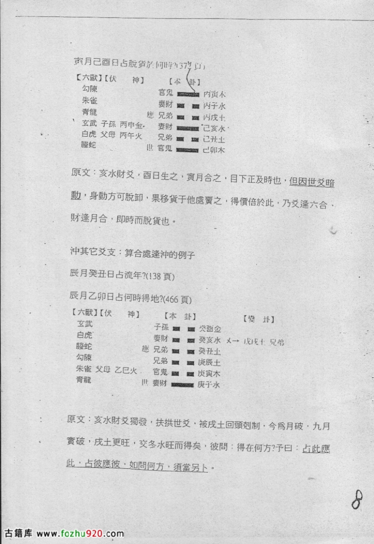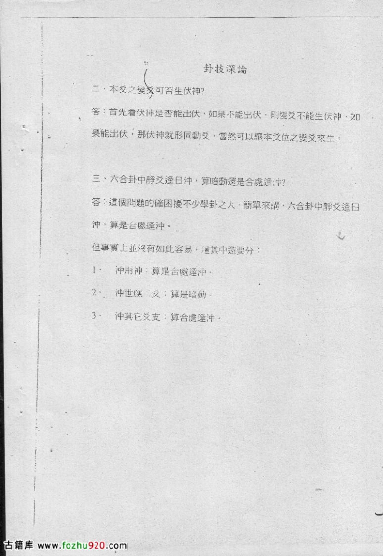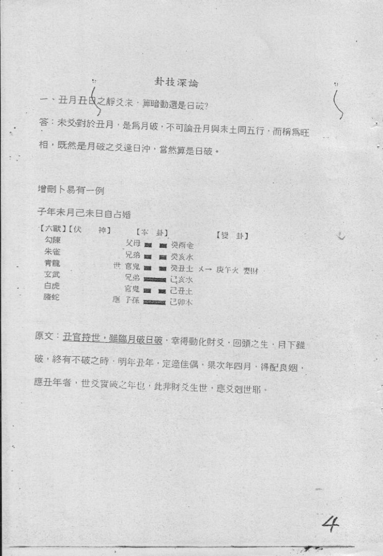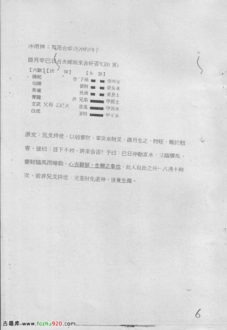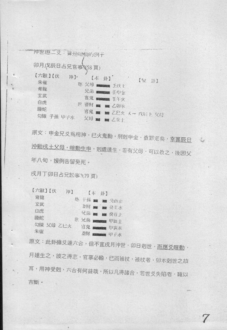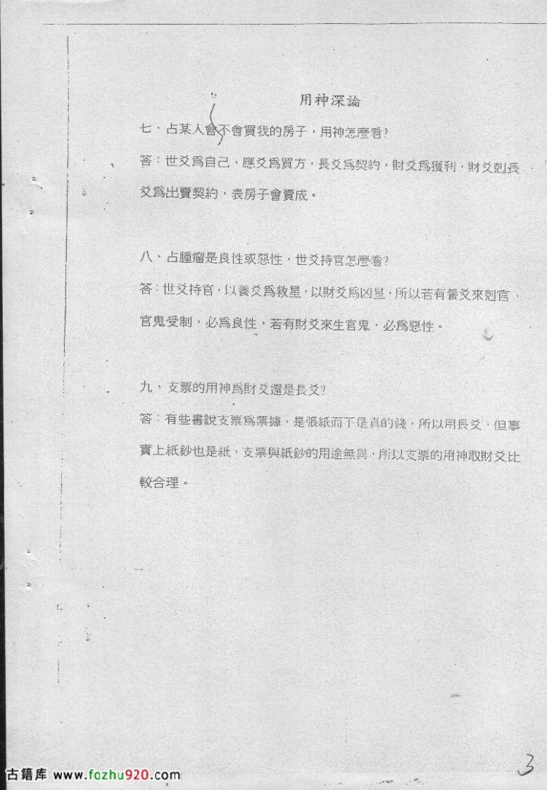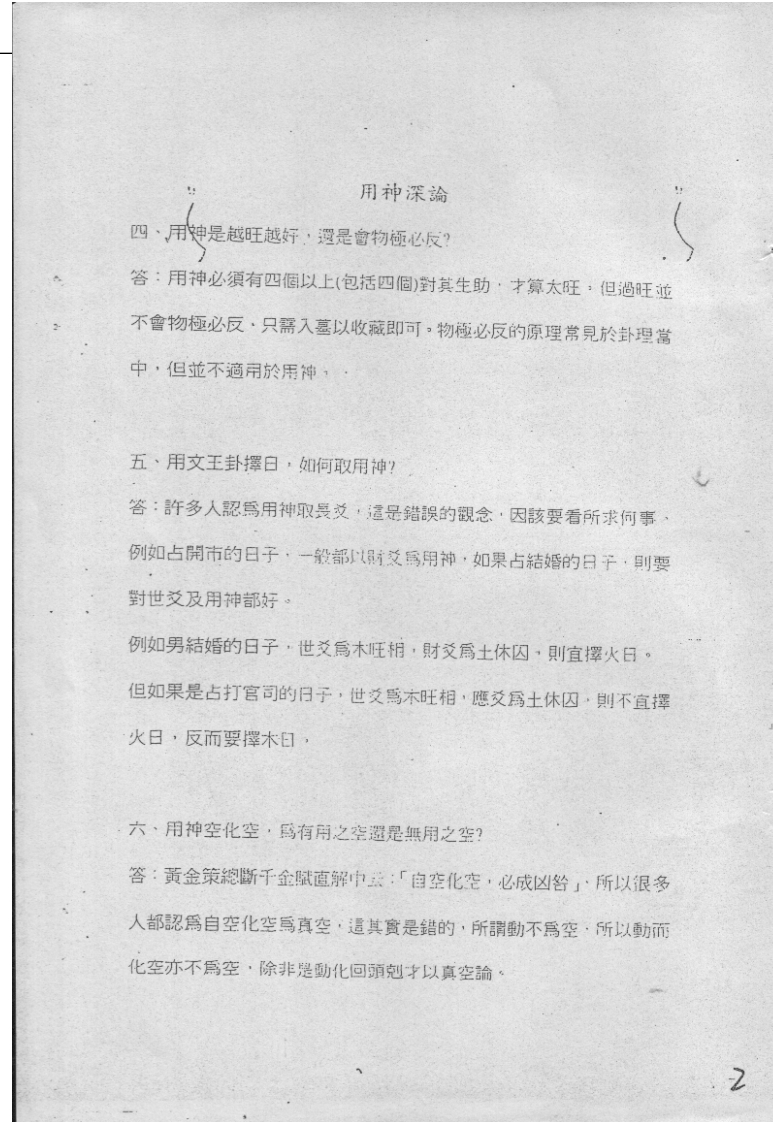 用神深論四·用神是越旺越好·還是逾物極必反?答:用神必須有四個以上(包括四個)對其生助·才算太旺,但過旺並不會物極必反·只需入墓以收藏即可,物極必反的原理常見於卦理常中,但並不適吊於用神,·五·用文王卦擇日·如何取用神?答:許多人認爲用神取曼艾·遣是错誤的觀念·因骸要看所求何事例如占開市的日子·一般部以j效写用神,如果占結婚的日子·则要對世爻及用神部好。例如男結婚的日子·世爻篇木旺相·財爻篇土休囚,則宜擇火日但如果是占打宫司的日子,世艾焉木旺相,應爻属土休囚·则不宜擇火日,反而要擇木日,六·用神空化空·马有用之空還是無用之生?答:黃金策總断千金赋直解中云:「自空化空,心成凶咎」·所以很多人都認爲自空化空爲真空·還其贪是错的,所謂動不爲空·所以動而化空亦不爲空·除非是動化回頭剋中以真空論2