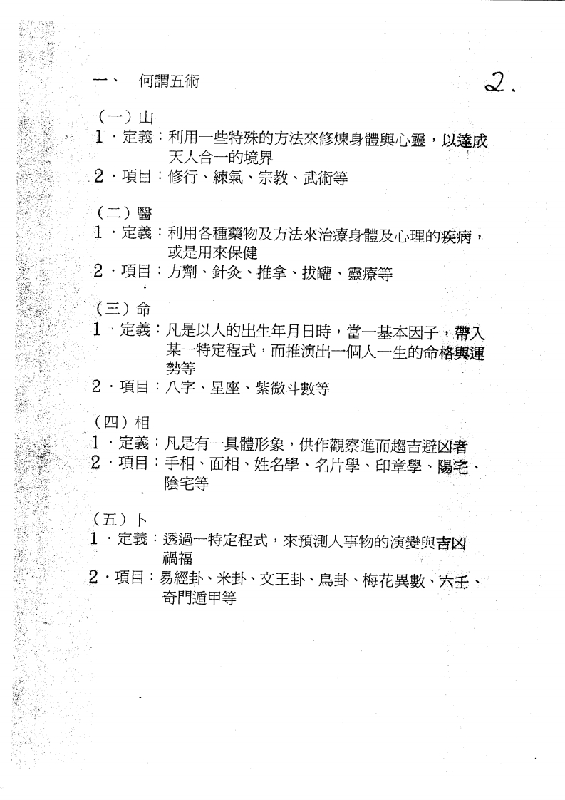 何謂五術2.(一)山1·定義:利用一些特殊的方法來修煉身體與心靈,以蓬成天人合一的境界2·項目:修行、練氣、宗教、武術等(二)醫1·定義:利用各種藥物及方法來治療身體及心理的疾病,或是用來保健2·項目:方劑、針灸、推拿、拔罐、靈療等(三)命1·定義:凡是以人的出生年月日時,當一基本因子,帶入某一特定程式,而推演出一個人一生的命格與運勢等2·項目:八字、星座、紫微斗數等(四)相1·定義:凡是有一具體形象,供作觀察進而趨吉避凶者2·項目:手相、面相、姓名學、名片學、印章學、陽宅、陰宅等(五)卜1·定義:透過一特定程式,來預測人事物的演變與吉凶禍福2·項目:易經卦、米卦、文王卦、鳥卦、梅花異數、六壬、奇門遁甲等