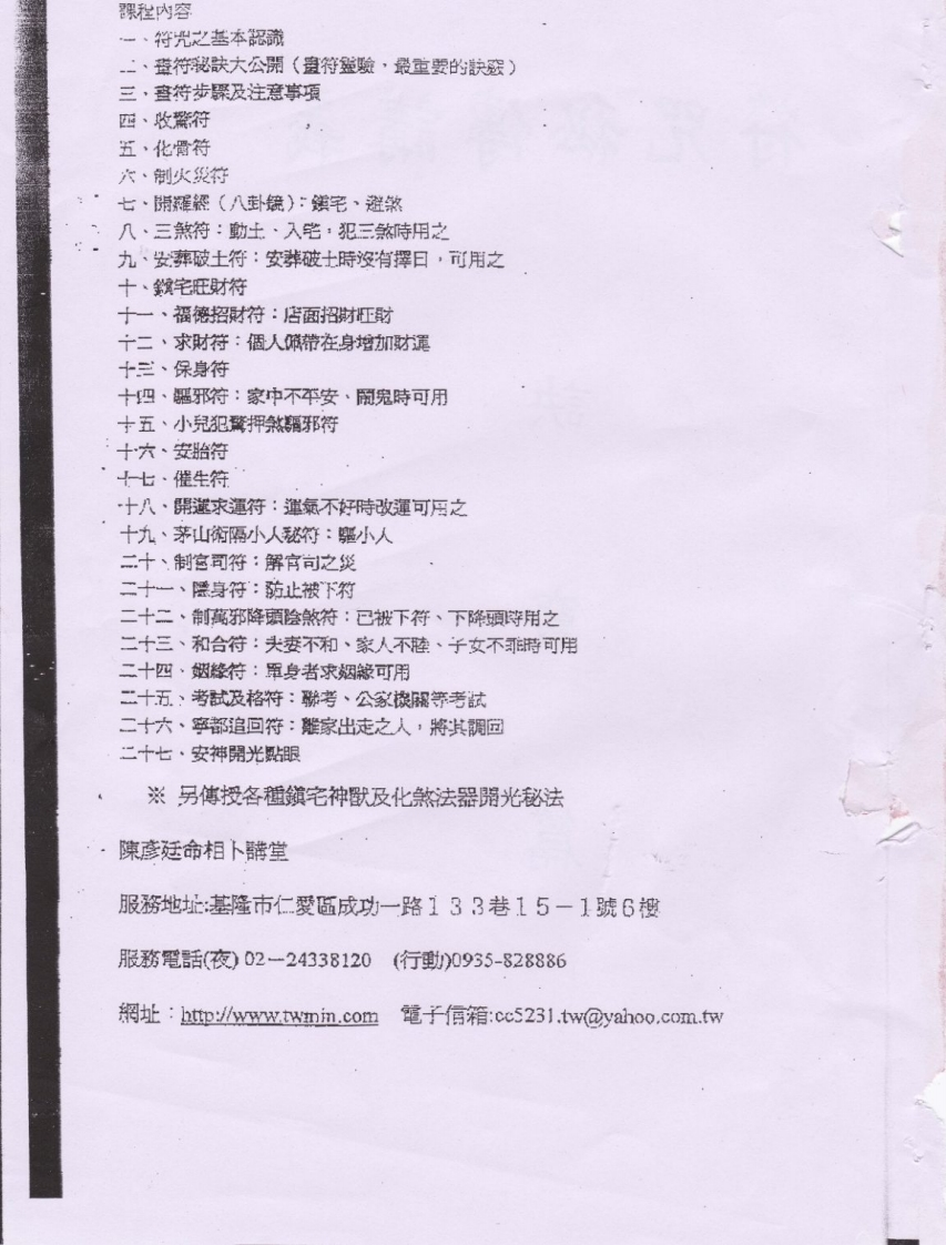 果程内容一、符光之基本韶箭·登符彩欲大公開(夏符靈骏,最重要的訣宏)三·盘符步聚及注意寧项四·收驚符五·化骨符穴·制火级符七·開羅韶(八卧镜):宅·避煞几·三煞符:勤土·入笔·犯三煞時用之九·安葬破土符:安葬破土時沒有挥日,可用之十·缤宅狂财符十一·福德招财符:店面招财正財十二·求财符:個人碱带在身增加财遥十三、保身符十四·腿邪符:家中不卒安·刷鬼時可用十五·小兒犯凳押煞寤邪特十六·安骀符七·催生符·十八·開遂求運符:運氣不好時改運可两之十九·茅山俯隔小人秘符:噩小人二十、制室司符:解官向之災二十一、腰身符:防止被下豹二十二·制萬邪降頭脍煞符:已被下符、下降頭等用之二十三、和合符:关凌不和·家人不藤·子女不带可用二十四·姻絳符:罩身者求烟嫩可用二十五.:考试及格符:聯考、公家误耀等考试二十六·卒部追回符:熊家出走之人·將其稠回二十七·安神開光贴眼※另傅授各鎭宅神獸及化煞法器脂光秘法陳彦廷命相卜酵堂服務地址基隆市仁愛成功一路133巷15-1號6搜服務話(夜)02一24338120(行勤)0935-828886辋址:http://www.twmin.com笔子伺箱:cc5231.tw@yaho0,com.fw