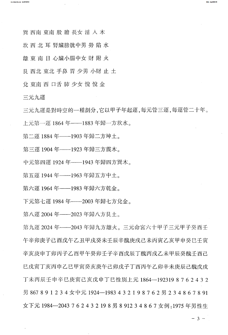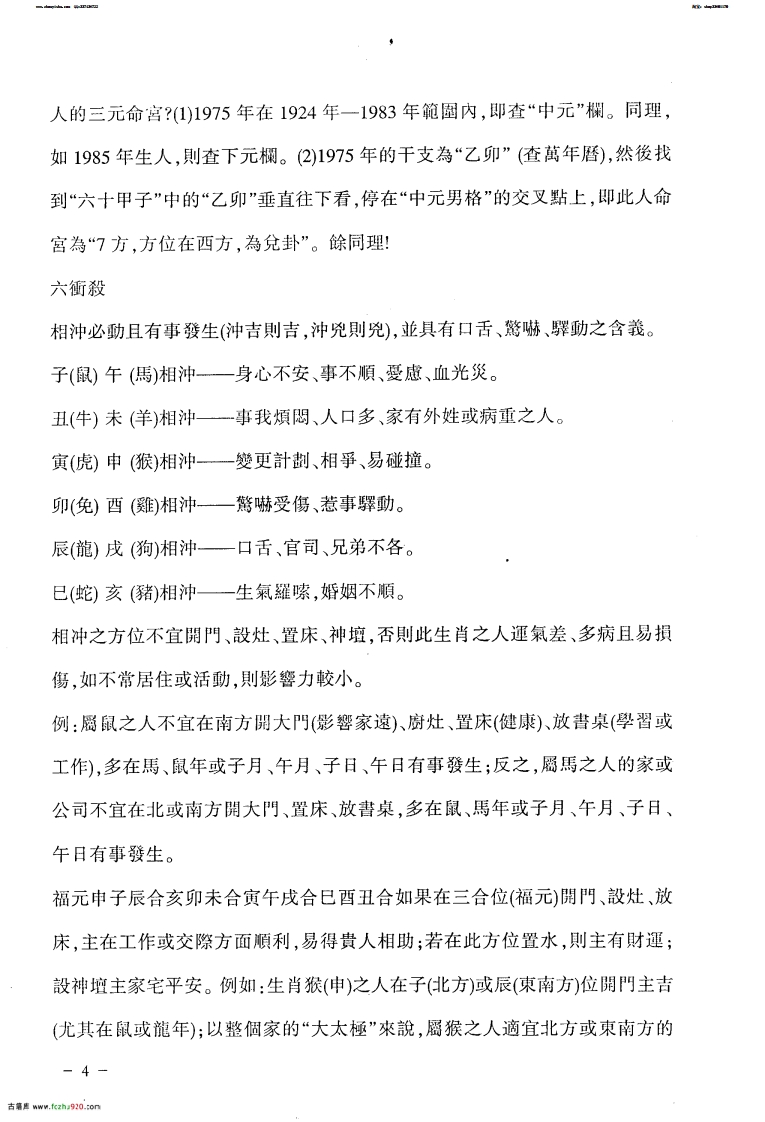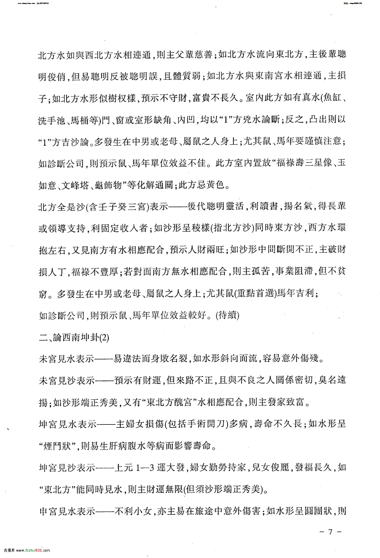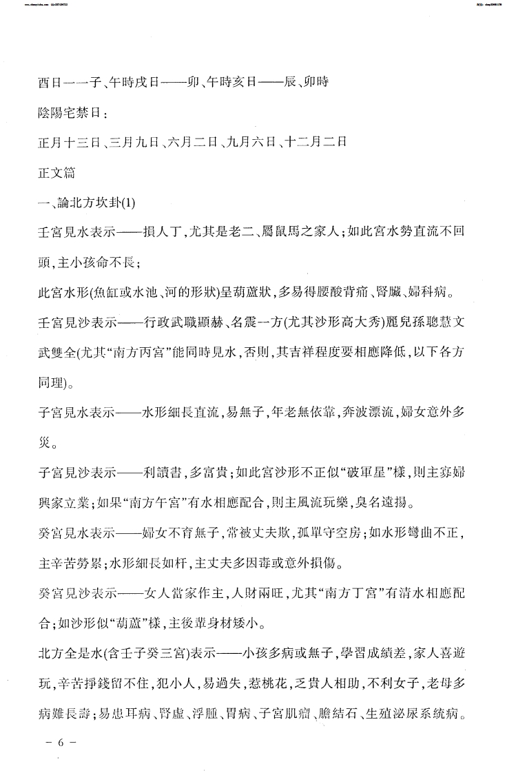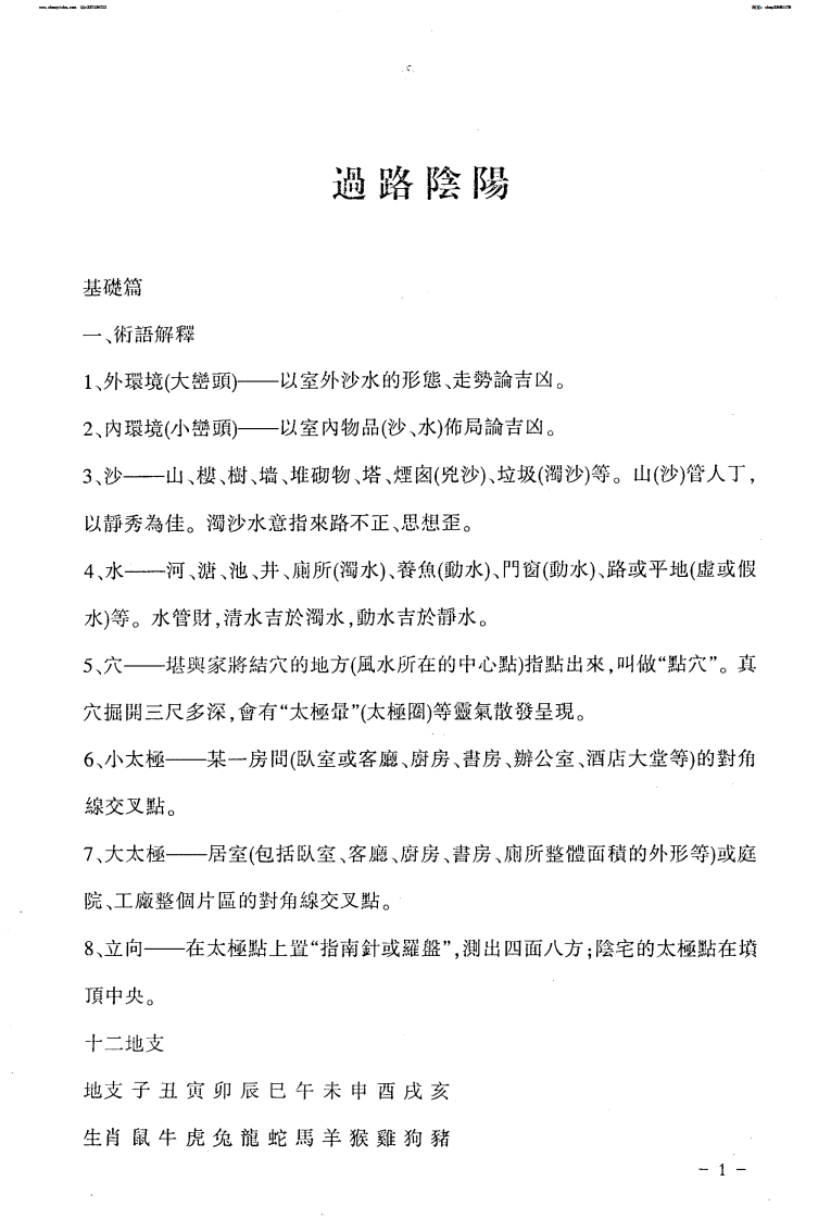 過路陰陽基礎篇一、術語解釋1、外環境(大巒頭)一以室外沙水的形態、走勢論吉凶。2、内環境(小巒頭)一以室內物品(沙、水)布局論吉凶。3、沙一山、樓、樹、墙、堆砌物、塔、煙囪(兇沙)、垃圾(濁沙)等。山(沙)管人丁,以靜秀為佳。潤沙水意指來路不正、思想歪。4、水一一河、溏、池、井、廁所(濁水)、養魚(動水)、門窗(動水)、路或平地(虚或假水)等。水管财,清水吉於濁水,動水吉於都水。5、穴一堪與家將結穴的地方(風水所在的中心點)指點出來,叫做“點穴”。真穴掘開三尺多深,會有“太極量”(太極圈)等靈氣散發呈現。6、小太極一某一房問(队室或客廳、廚房、書房、辦公室、酒店大堂等)的對角線交叉點。7、大太極一居室(包括队室、客廳、廚房、書房、庙所整體面積的外形等)或庭院、工廠整個片區的對角線交叉點。8、立向一在太極點上置“指南針或羅盤”,测出四面八方;陰宅的太極點在墳頂中央。十二地支地支子丑寅卯辰已午未申酉戌亥生肖鼠牛虎免龍蛇馬羊猴雞狗猪