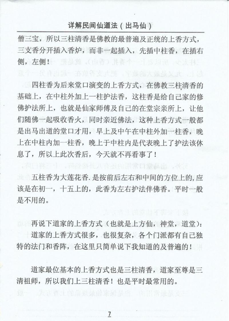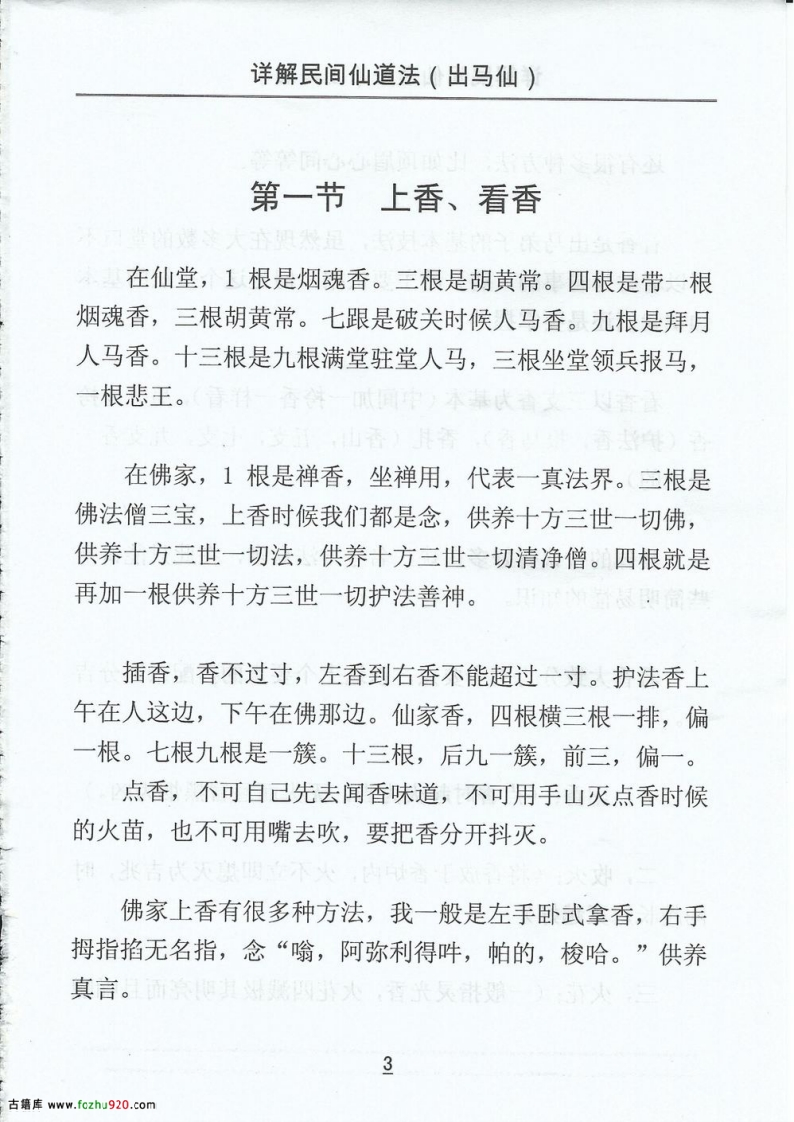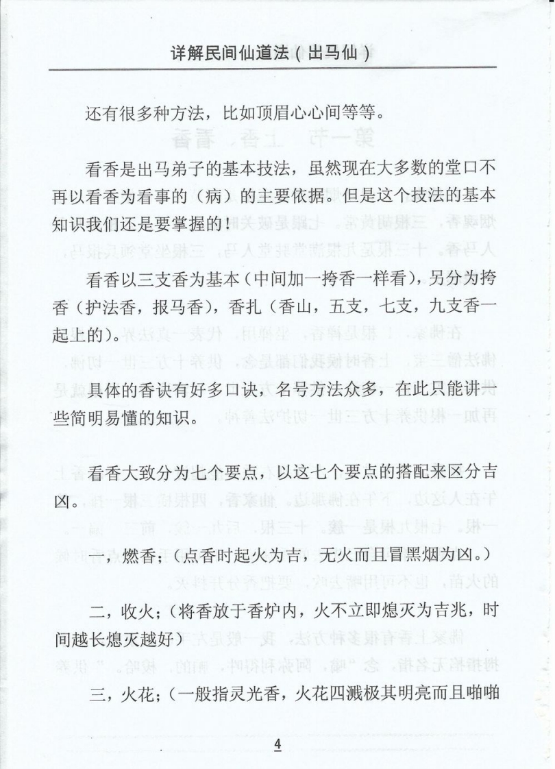 出马仙-详解民间仙道法sishuge47天前发布关注私信90.99MB407页04510出马仙-详解民间仙道法此内容为付费资源,请付费后查看¥5¥10VIP会员免费立即购买您当前未登录!建议登陆后购买,可保存购买订单付费资源 第1页 / 共407页 第2页 / 共407页 第3页 / 共407页 第4页 / 共407页 第5页 / 共407页 第6页 / 共407页 第7页 / 共407页 第8页 / 共407页 试读已结束,还剩399页,您可下载完整版后进行离线阅读 © 版权声明文章版权归作者所有,未经允许请勿转载。THE END五术专题 文本预览 详解民间仙道法(出马仙)第四卷ω堂口的有关知识第四章堂口的有关知识第一节上香和看香、看香密决、香火上的全息世界、七土二香谱、二土四香谱第二节神(佛)入仙供奉的方法和禁忌第三节堂口结构、仙堂的组成、查事时候的调兵遣将、第四节堂口的分类、香堂的区分、堂口形式、谈暗堂的表现形式、出马仙堂口的一些分类、从一次治病的经历浅谈一种特殊的堂口形式、合堂和龙凤堂第五节四正堂口的具体解说第六节浅谈养堂第七节旗令印剑安到轩第八节谈大堂系列客转2 查看更多 收起部分 喜欢就支持一下吧点赞10 分享QQ空间微博QQ好友海报分享复制链接收藏