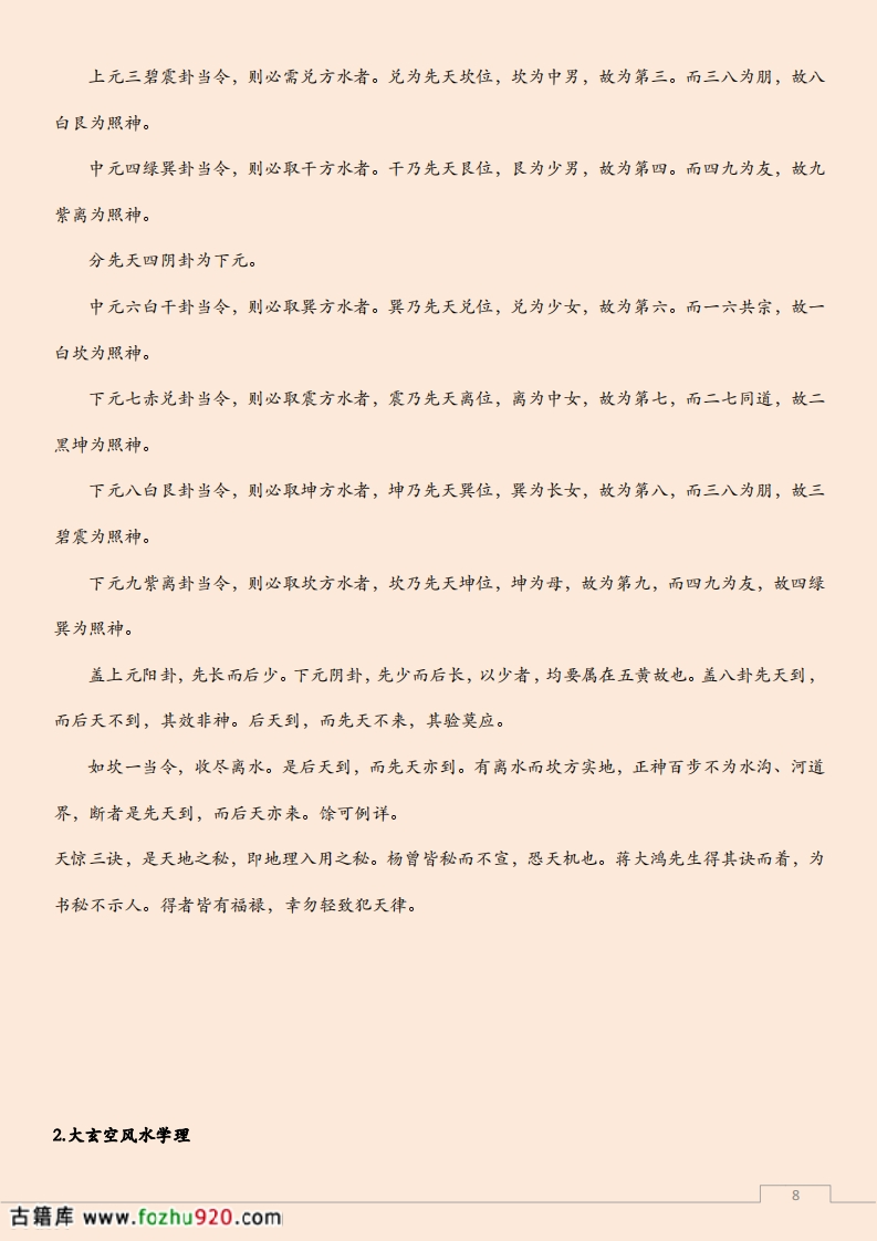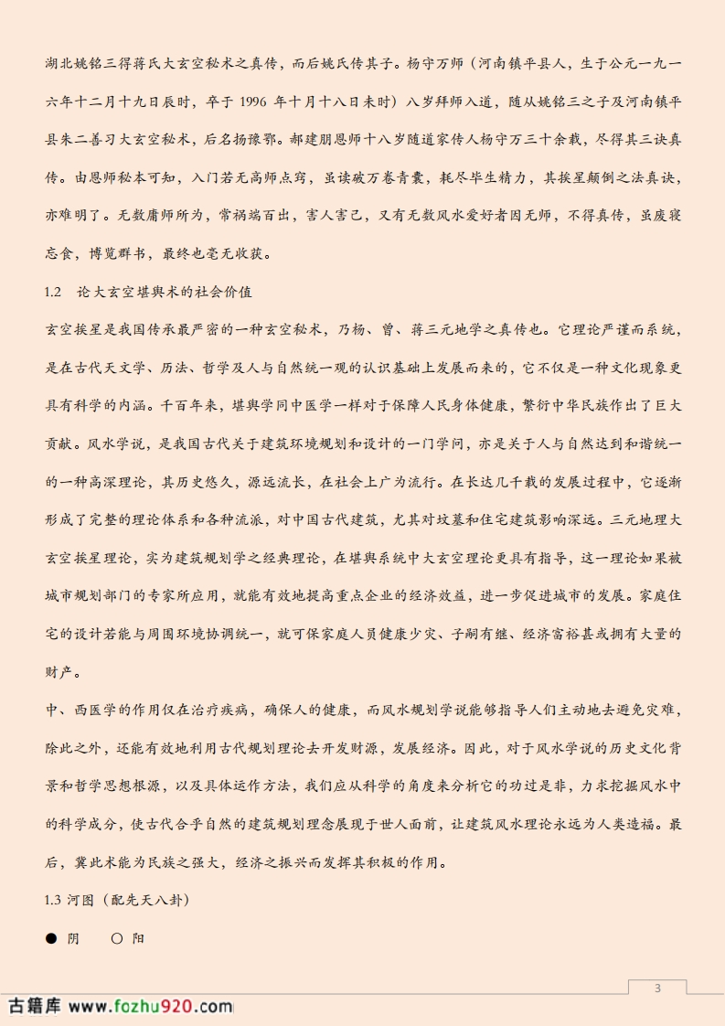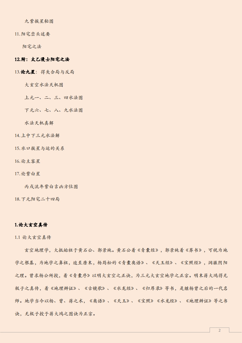 九紫挨星秘图11.阳宅峦头述要阳宅之法12.附:太乙漫士阳宅之法13.论九星:得失合局与反局大玄空水法天机图上元一、二、三、四水法图下元六、七、八、九水法图水法天机真解14.上中下三元水法解15.水口挨星与运的关系16.论主客星17.论紫白星丙戍流年紫白吉凶方位图18.下元阳宅二十四局1.论大玄空真传1.1论大玄空真传玄空地理学,大抵始祖于黄石公、郭景纯。黄石公着《青囊经》,郭景纯着《葬书》,可视为地学之根基,为地学之鼻祖,迨至唐末,杨筠松的《青囊奥语》、《天玉经》、《宝照经》,洞澈阴阳之理。曾求杨公所授,着《青囊序》以明大玄空之正诀,为三元大玄空地学之正宗。明末蒋大鸿得无极子之真传,着《地理辨证》、《古镜歌》、《水龙经》、《归厚录》等书,是继杨曾之后的一代名师。地学当今以杨、曾、蒋之术,《奥语》、《天玉》、《宝照》《水龙经》、《地理辩证》等之书诀,无极子授予蒋大鸿之图诀为正宗。