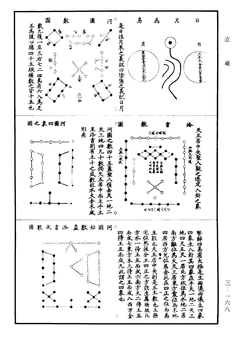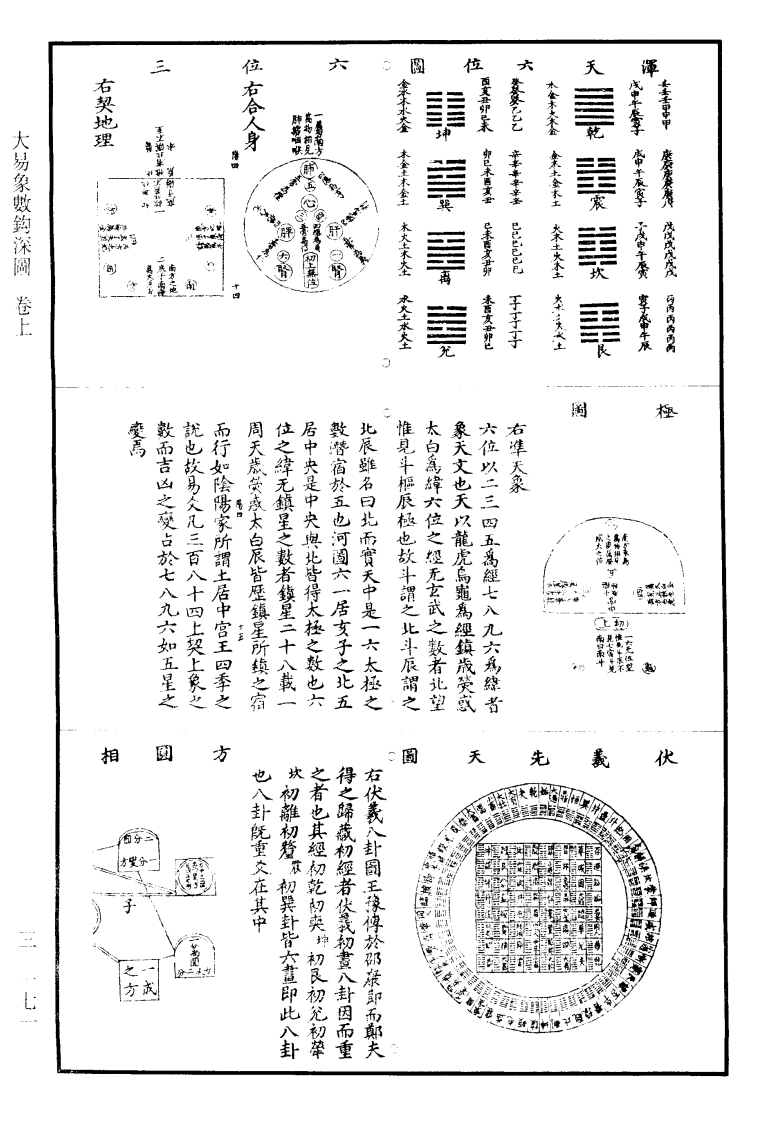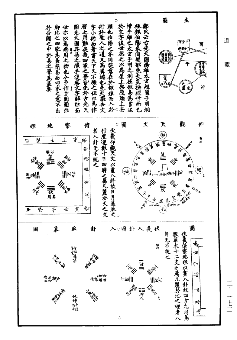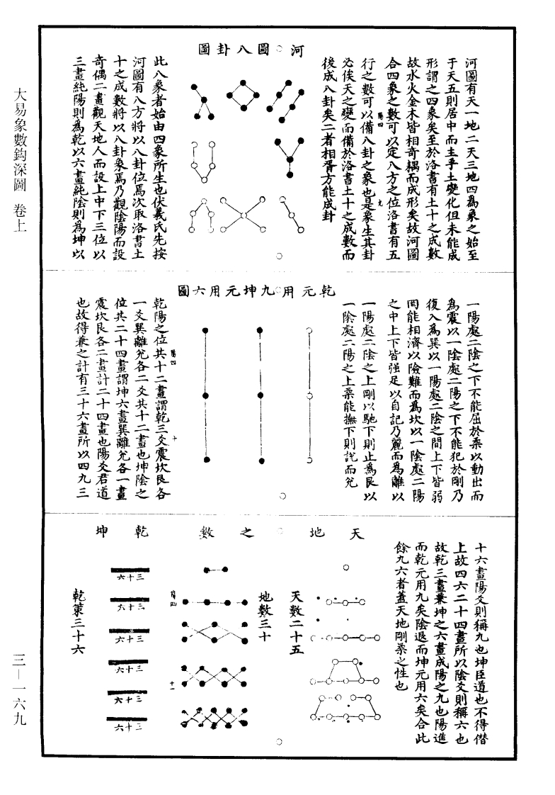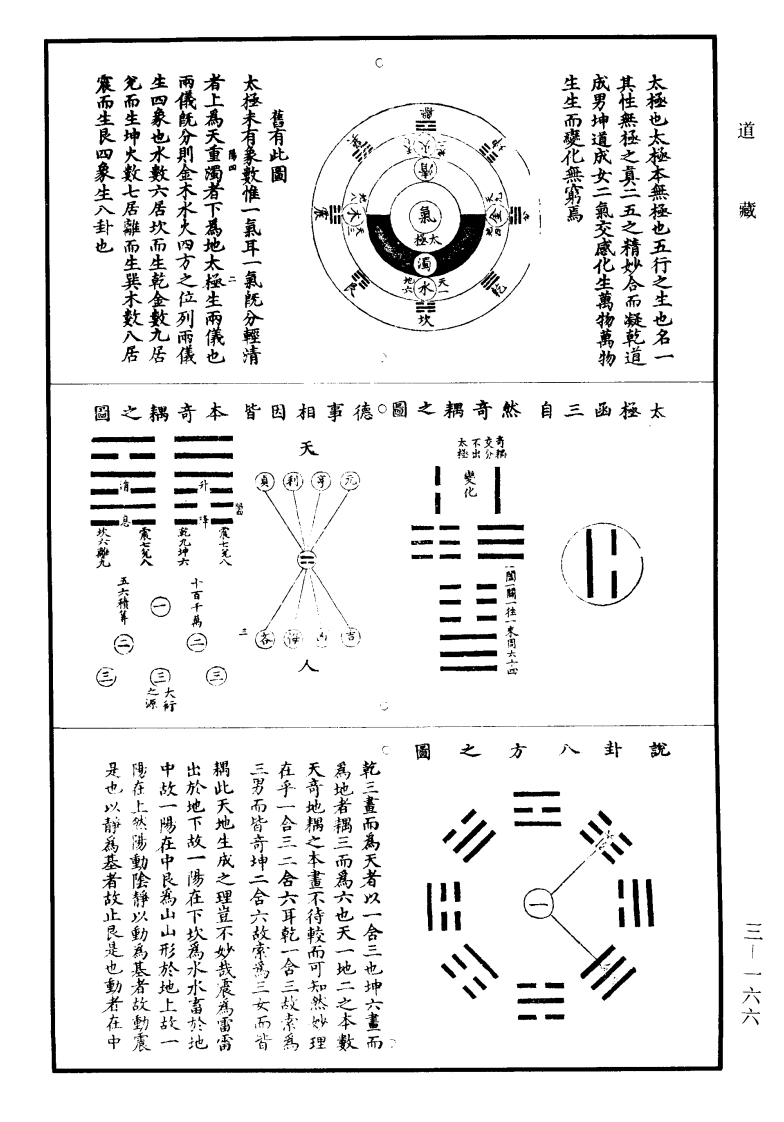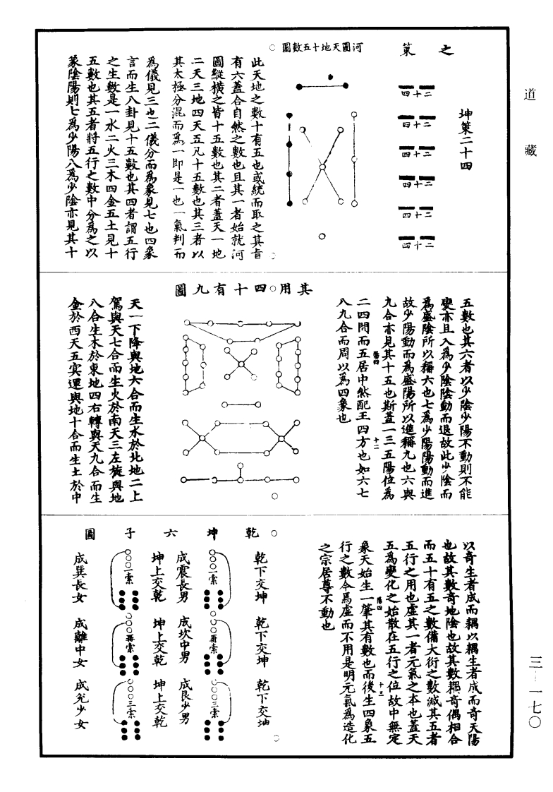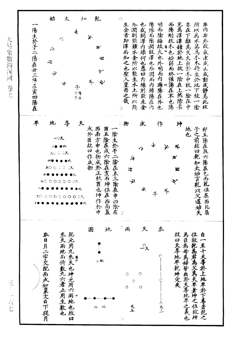 震而生展四象生入卦也完而生坤火教七居誰而生美木数入居生四象也术教六居坎而生乾金教九居雨侯既分則金木术大四方之位列雨供者上馬天重满者下為地太極生兩佛也太極未有象软惟一氣耳一氣历分輕清舊有此圖生生而變化無窮焉天成男坤道成女二氣交感化生萬物萬物其性無極之真二五之精妙合而疑乾道太極也太極本無極也五行之生也名一道藏圖之耦奇本皆因相事德·圖之耦奇然自三函校太天鑫玉亲南园影三三⊙十百干)国開一往一来周大心人圆之卦說是也以静為基者故止尺是也動者在中種在上终传勤陰静以動乃美者故的震中放一陽在中民出於地下枝一陽山山形於地上故一下坎為水水富於地關此天地生成之理豈不妙贵震為雷雷三男而皆奇坤二在平一合三二合六耳乾一合三故索爲天奇地锅之本不待較而可知然理為地者锅三而為六也天一地二之本教乾三畫而為天者以一合三也坤六畫而l六故索鴻三女而皆三—一六六