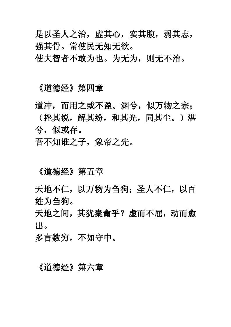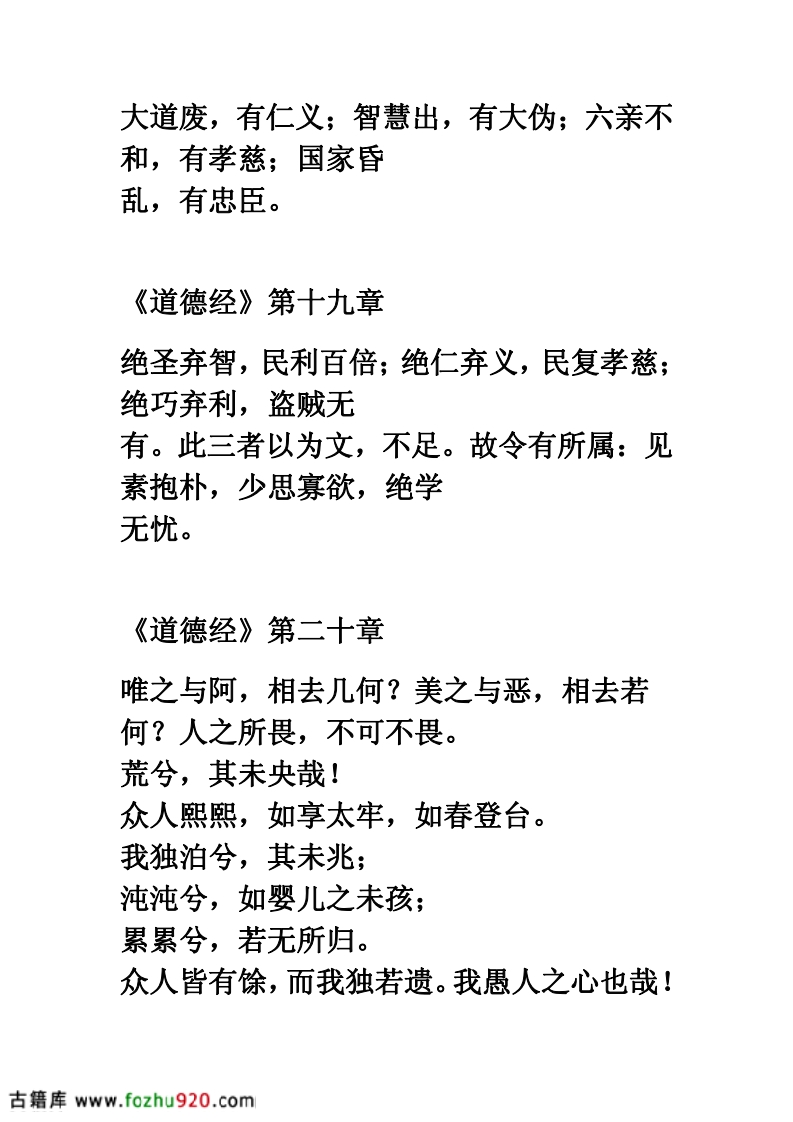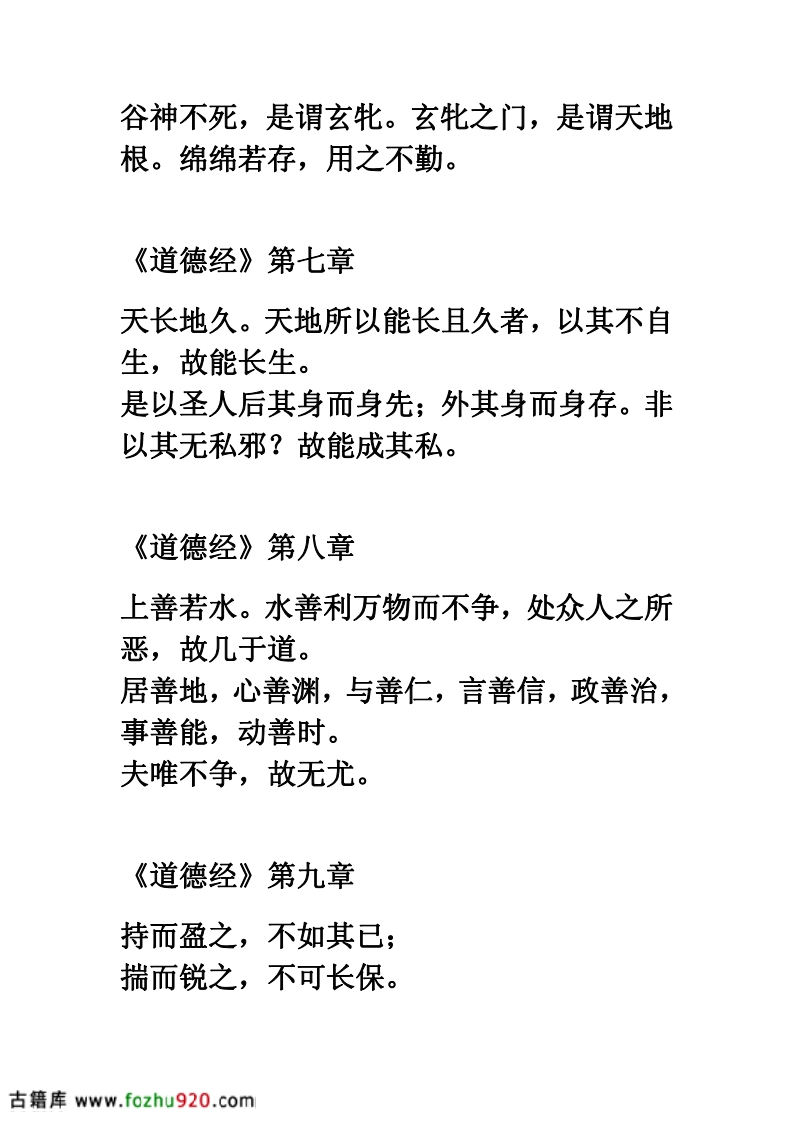 道德经(全文)sishuge46天前发布关注私信0.79MB105页02414道德经(全文)此内容为付费资源,请付费后查看¥5¥10VIP会员免费立即购买您当前未登录!建议登陆后购买,可保存购买订单付费资源 第1页 / 共105页 第2页 / 共105页 第3页 / 共105页 第4页 / 共105页 第5页 / 共105页 第6页 / 共105页 第7页 / 共105页 第8页 / 共105页 试读已结束,还剩97页,您可下载完整版后进行离线阅读 © 版权声明文章版权归作者所有,未经允许请勿转载。THE END五术专题 文本预览 是以圣人之治,虚其心,实其腹,弱其志,强其骨。常使民无知无欲。使夫智者不敢为也。为无为,则无不治。《道德经》第四章道冲,而用之或不盈。渊兮,似万物之宗;(挫其锐,解其纷,和其光,同其尘。)湛兮,似或存。吾不知谁之子,象帝之先。《道德经》第五章天地不仁,以万物为刍狗;圣人不仁,以百姓为刍狗。天地之间,其犹橐龠乎?虚而不屈,动而愈出。多言数穷,不如守中。《道德经》第六章 查看更多 收起部分 喜欢就支持一下吧点赞14 分享QQ空间微博QQ好友海报分享复制链接收藏