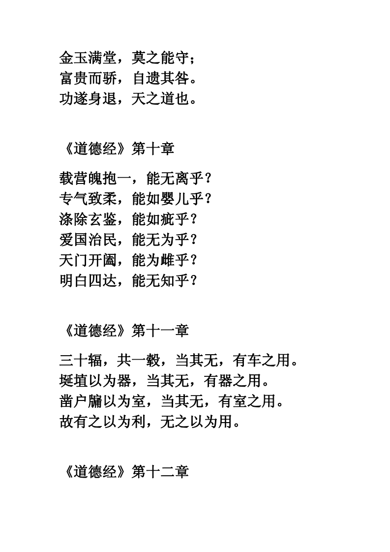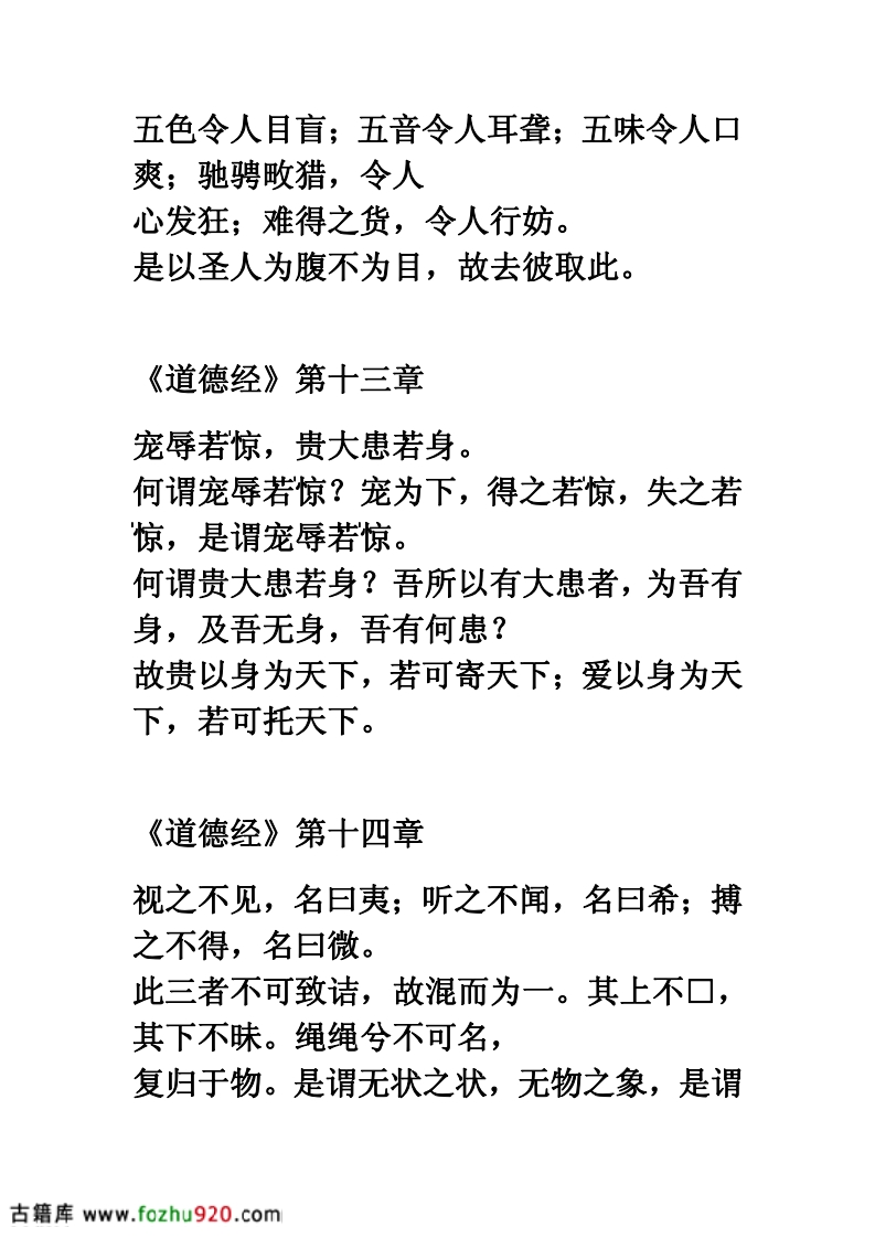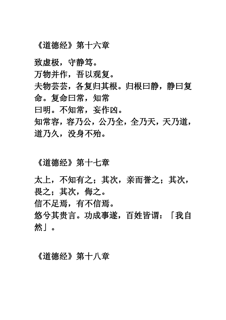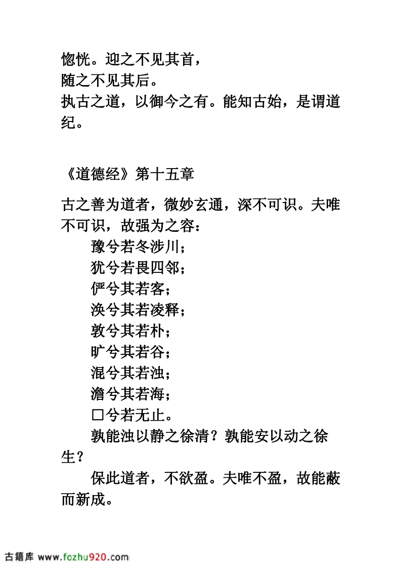 道德经(全文)sishuge46天前发布关注私信0.79MB105页02414道德经(全文)此内容为付费资源,请付费后查看¥5¥10VIP会员免费立即购买您当前未登录!建议登陆后购买,可保存购买订单付费资源 第1页 / 共105页 第2页 / 共105页 第3页 / 共105页 第4页 / 共105页 第5页 / 共105页 第6页 / 共105页 第7页 / 共105页 第8页 / 共105页 试读已结束,还剩97页,您可下载完整版后进行离线阅读 © 版权声明文章版权归作者所有,未经允许请勿转载。THE END五术专题 文本预览 是以圣人之治,虚其心,实其腹,弱其志,强其骨。常使民无知无欲。使夫智者不敢为也。为无为,则无不治。《道德经》第四章道冲,而用之或不盈。渊兮,似万物之宗;(挫其锐,解其纷,和其光,同其尘。)湛兮,似或存。吾不知谁之子,象帝之先。《道德经》第五章天地不仁,以万物为刍狗;圣人不仁,以百姓为刍狗。天地之间,其犹橐龠乎?虚而不屈,动而愈出。多言数穷,不如守中。《道德经》第六章 查看更多 收起部分 喜欢就支持一下吧点赞14 分享QQ空间微博QQ好友海报分享复制链接收藏