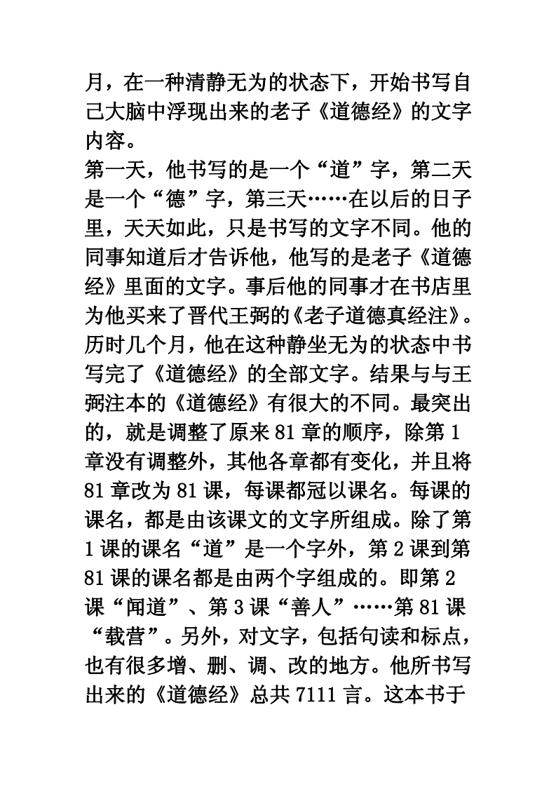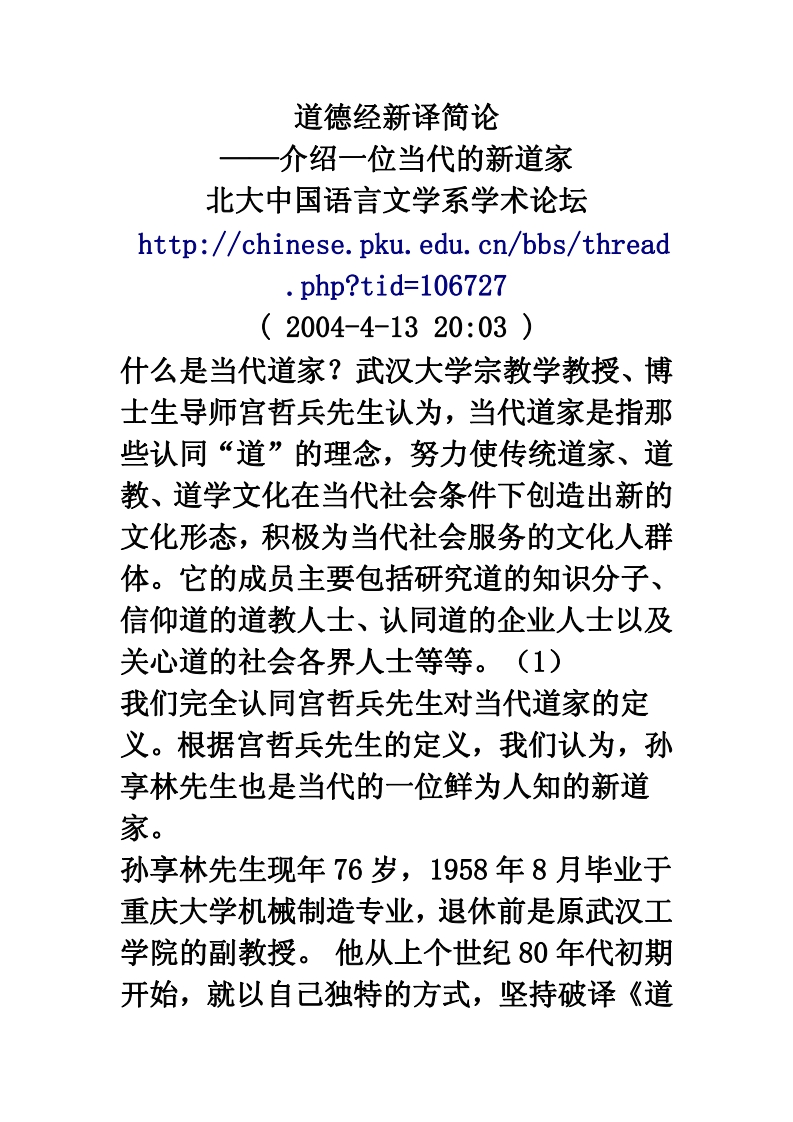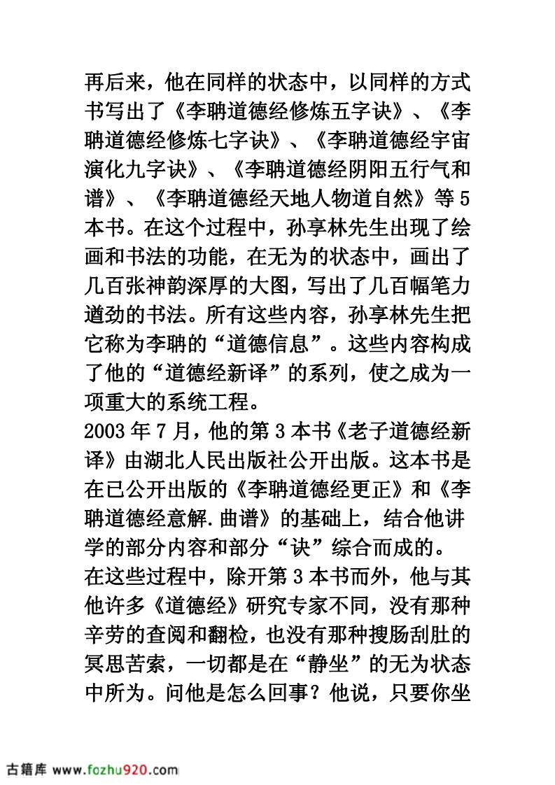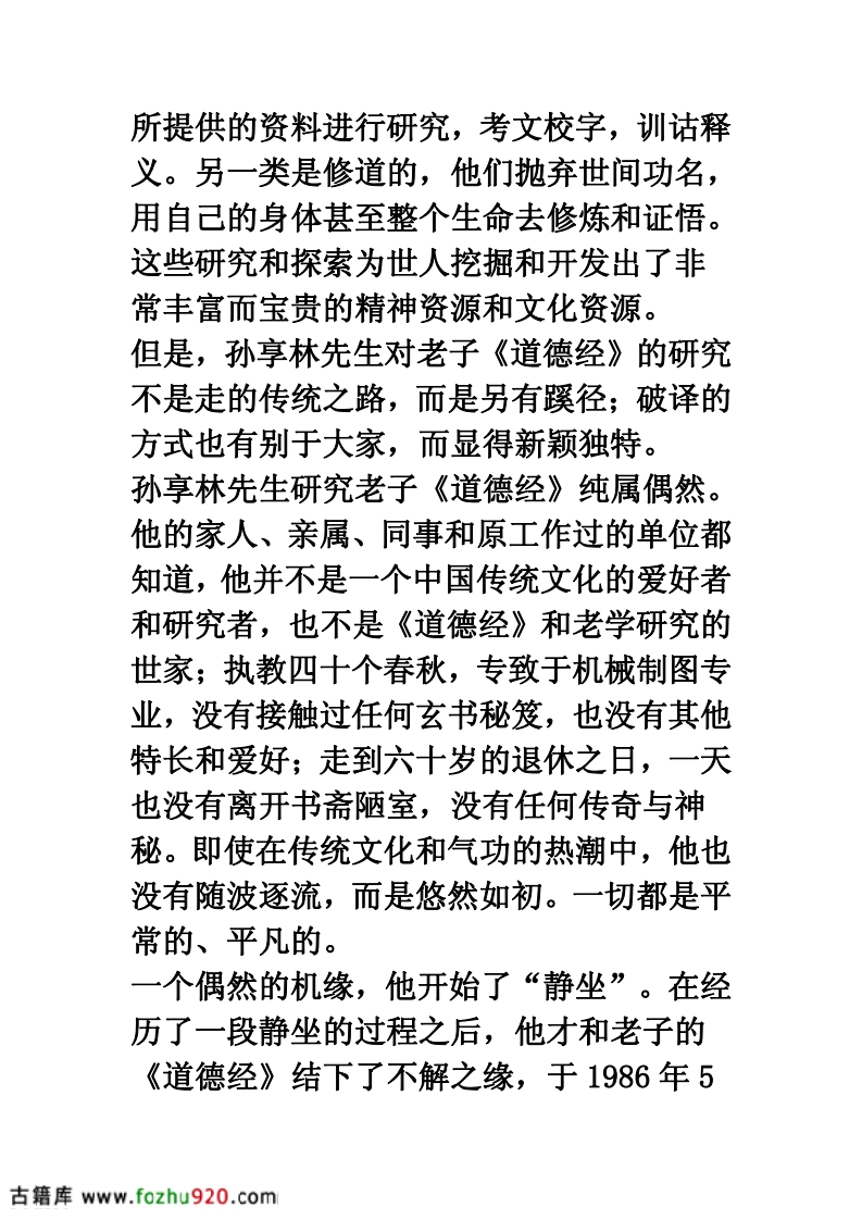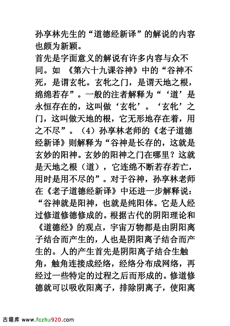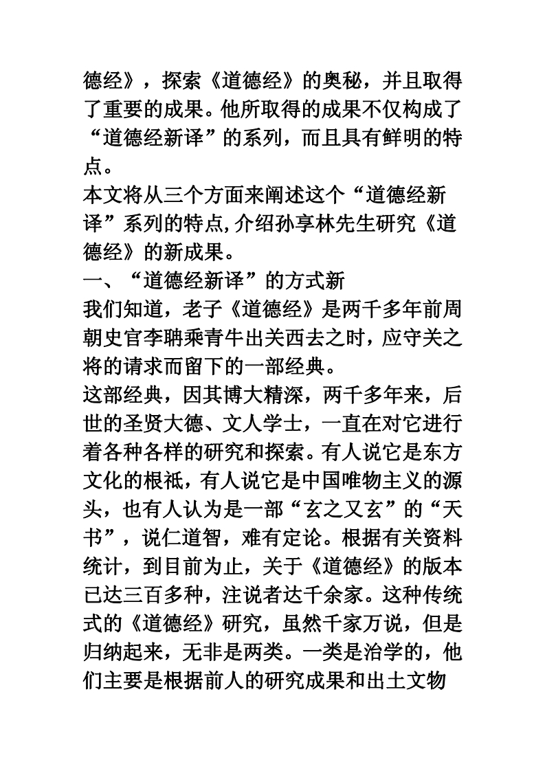 德经》,探索《道德经》的奥秘,并且取得了重要的成果。他所取得的成果不仅构成了“道德经新译”的系列,而且具有鲜明的特点。本文将从三个方面来阐述这个“道德经新译”系列的特点,介绍孙享林先生研究《道德经》的新成果。一、“道德经新译”的方式新我们知道,老子《道德经》是两千多年前周朝史官李聃乘青牛出关西去之时,应守关之将的请求而留下的一部经典。这部经典,因其博大精深,两千多年来,后世的圣贤大德、文人学士,一直在对它进行着各种各样的研究和探索。有人说它是东方文化的根祗,有人说它是中国唯物主义的源头,也有人认为是一部“玄之又玄”的“天书”,说仁道智,难有定论。根据有关资料统计,到目前为止,关于《道德经》的版本已达三百多种,注说者达千余家。这种传统式的《道德经》研究,虽然千家万说,但是归纳起来,无非是两类。一类是治学的,他们主要是根据前人的研究成果和出土文物