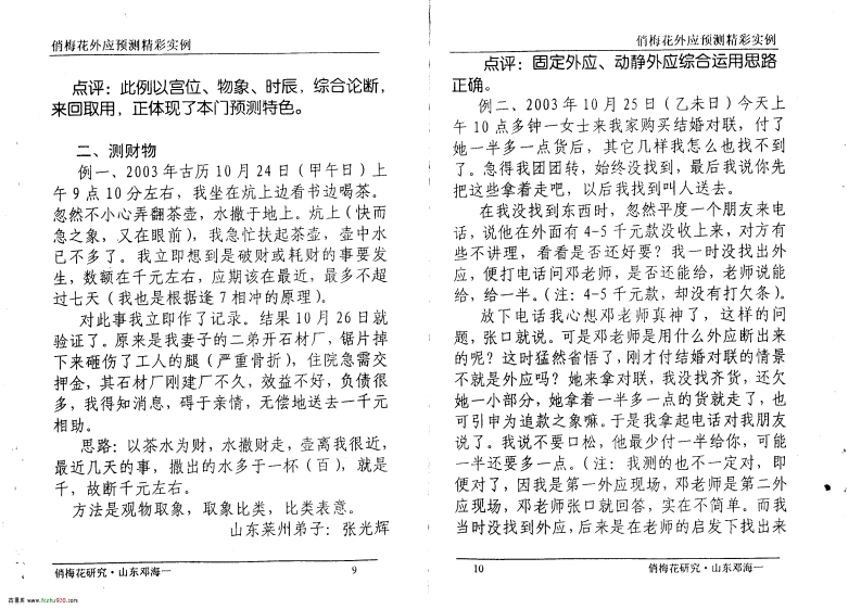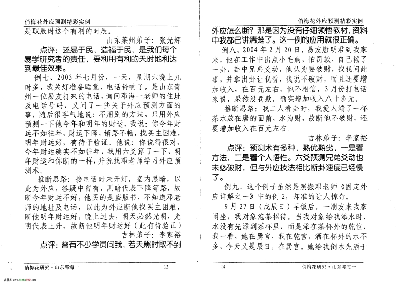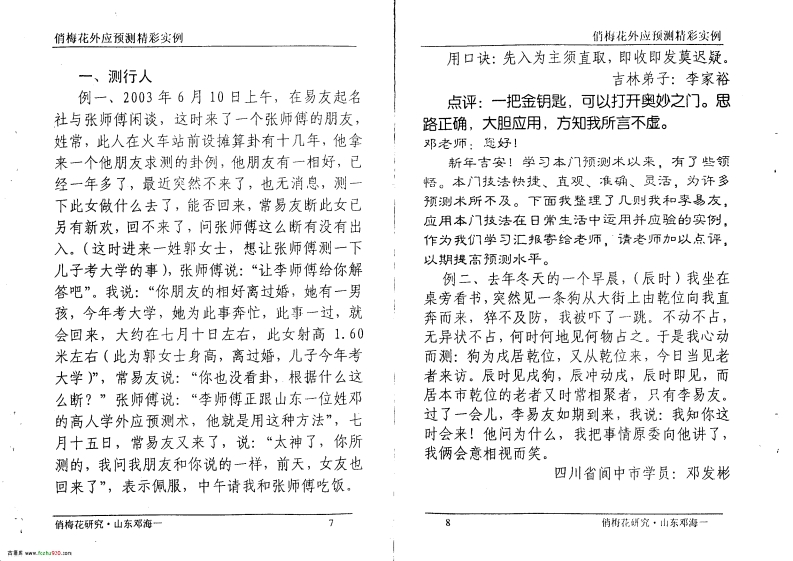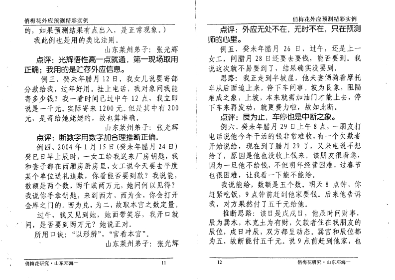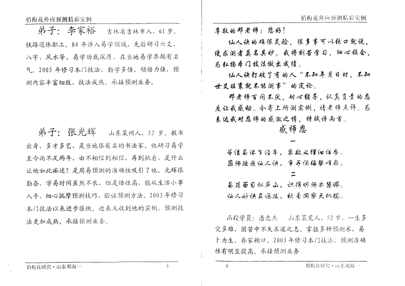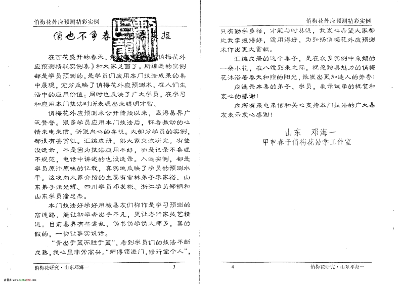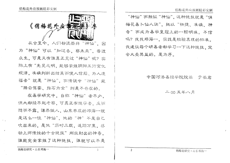 俏制花外应预测精彩实例的ǐ梅龙外应预测精彩实例“神仙”而胜似“神仙”,这种绝技就是“俏《俏梅花外应梅花易卜仙人决”,她以“快捷、准确、神奇”而成为易学皇冠上的一颗明珠。不信吗?找找邓海一,实践是检验真理的标准。从古至今,人们门都很崇拜“神仙”,因我速议每个研易者都学习一下这种绝技,定为“神仙”可以“知过去,察未来”,普渡会大受其益的。是为序。众生,可是又有谁真正见过“神仙”呢?实际上有“先见之明,能够学握阴阳五行变化规津,准确判断出结果而使人信服、为人造中国河洛易经学院院长于长君福者”就是“神仙”,而传说中“种仙”能“腾云驾雾、指石为金”则是不存在的。二00五年八月在易学研究中,自称“神仙”者不少,但大都经不起考察,可真正有绝学者,反而隐而不露,谦恭做人,山东枣庄的邓海一就是这么一位“神仙”,他的“神”不是自己吹出来的,是他“历时三载,追踪万里,感动上师传授的千古绝技”所放射出的神奇,谁能完全掌握了这种绝技,谁就可以不是俏梅花研究·山东邓海一俏梅花研究·山东邓游一