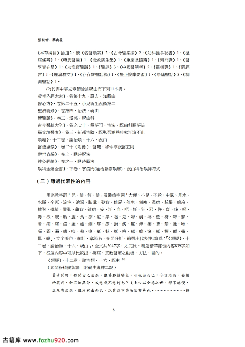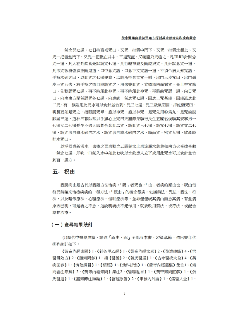 張臀哲、墓责花著、筮·卦·巫·道士·煉丹、神、鬼·魅·魎·魍、魑·魔·魔、請神、驅鬼等等,可搜羅中竖典籍中有關宗教醫療的文歉·探尋宗教療法·整理出重要的文歉資料來分析研究。我們從武從况由、符咒、占人、触卜入手·提出中醫典籍電餐分析研究模式。所查到的基本資料非常多·依目錄區篇數,全文區篇數,全文區字數統計:祝16篇,139篇,1,395,607字:符64篇,1519篇,4,410,682字:咒29篇,429篇,1,077,213字;占33篇,763篇,2,676,148字;卜31篇,2701篇,226,890字;含趣共計459本書,章節2,867筆,7,869,341字,17,655,881字,這麗大資料可證明在宗教與醫療的研究上,中醫藥典籍文獻献的探索是不可忽的一環。查到每篇篇單獨研究樣本·所有文歉格式化·匯入我們開發十年的中醫藥典籍分析研究程式系統·依照各書出典的年代排序,釐清上下前後傅承關係。依照需要的條件,粹取内容·群細審讀有關内容,找出與本論文有關重要主題·每筆標記·分離取出;依照論迹的主題·群細研藏、分别彙集整理·分類·歸钠·分析·比較~討論、考據·證明。提出古代諸名家有關的論述·使用的醫撩方法·助機、目的·醫籍著作·時代背景·對於疾病原因的詮釋和疾病宗教觀念,繪沿革關連圖來說明,討論相互之關係·提綱契頜·掌握要點·釐清中國醫學對宗教與醫療之間互補互動的關係,可提供更科學、更有效的資料。我們認僞宗教的意識型態是人們的價值信仰體系·醫獠雖是實證科學,但中國醫學對疾病的治潦上·精合了宗教療法·兩者互相調和·互重互補·爲疾病治潦提供一條更有撩效的方向。中醫藥典籍電子資料审時代來到·電腦可儲存巨大文猷資料,快速的搜每功能,固然帶來方便,但大迥異過去人工查閱,電腦查出來的資料太多·麗大資料·上百萬字·量多得讓人看不完·内容驱重雅擇的困雅。人工逐一覽讀,耗背時日·事倍功牛·且不易評量重點。本文用我們的過去累積的經驗,用書的章節内容比較法·統計内文相關字數及文字著色法·篩選·統計·比較·提綱挈頜·得到具體的结果·古籍中很多造字,衛生署中醫藥委員會有四千多字中醫藥造字,可下截做使用·本報告用用括號合併字如[魚止]是1個字·表示。二、醫籍宗教相關内容之比較用「祝(含祝由)、符·咒·占、卜·卦·巫·僧·道士·煉丹、神·鬼·魅·魎·魅·魍·魔·魑」等關键嗣·查尋《中華醫典》全文區及目錄區·所得基本資料·分一)原始資(含非宗教内容):(1)目錄區篇數,(2)全文區篇數·(3脱·符、咒全文區總字數。(二)删除非關宗教内容全文·及删除中華醫典同一本書出現在不同四類的重覆内容(重覆登錄是中華醫典很大的失误·甚至有同一本書重覆3次)·列表如下。本報告選取含祝由·符·咒·鱼卜之内容來时論。