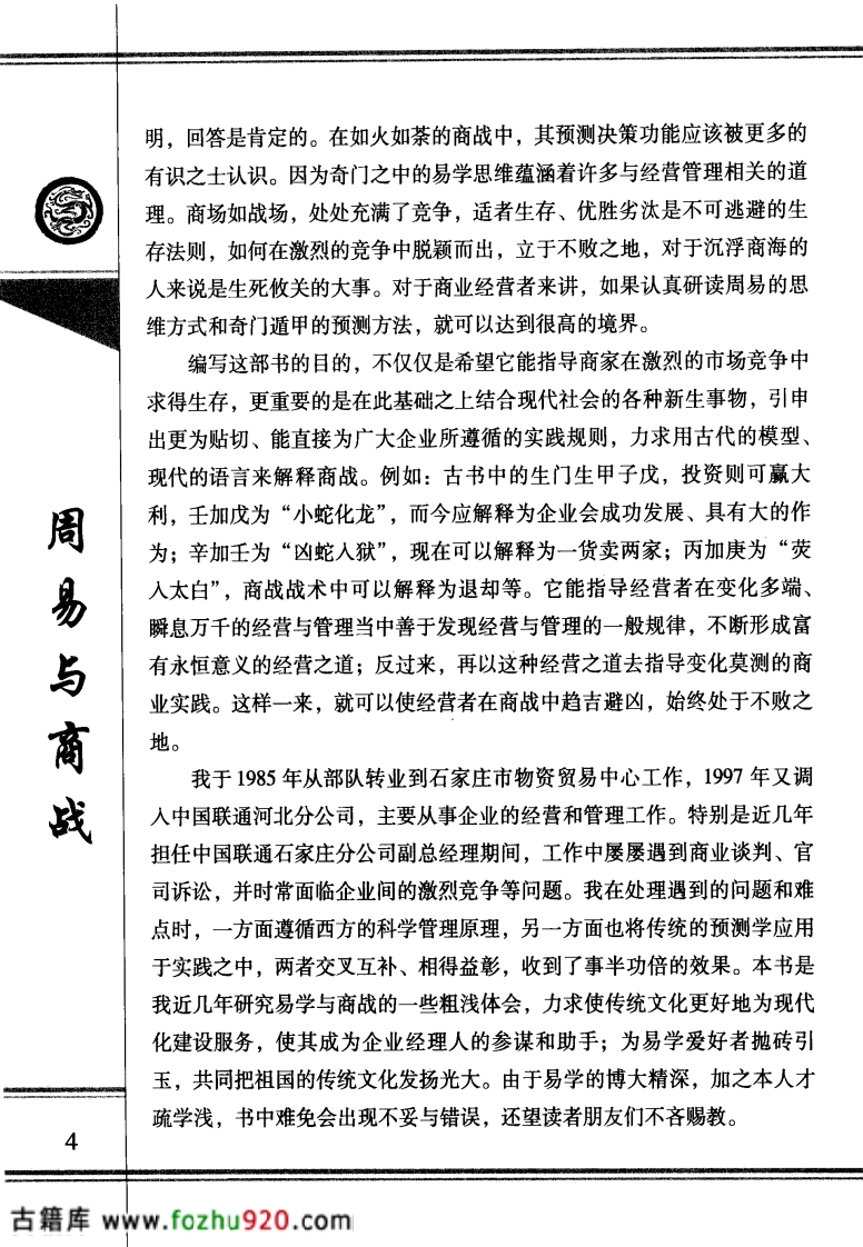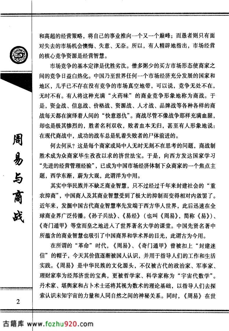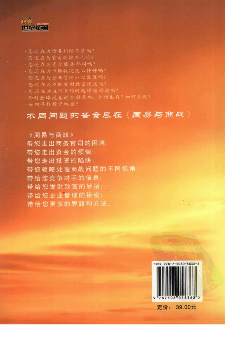 世纪誉·您还在为债务纠结不清吗?·您还在为官司烦恼不已吗?·您还在为资金账务郁闷吗?·您还在为市场状况忧心忡忡吗?·您还在为企业管理小心翼翼吗?·您还在为不能发财致富忧虑吗?·您还在为这许多的问题弹精竭虑吗?·面对全球漫卷的金融危机,如何生存?如何自救?·如何寻找投资机会?不同问题的答案尽在《周易与商战》《周易与商战》带您走出商务官司的困境带您走出资金的烦恼:带您走出投资的陷阱:带您领略处理商战问题的不同视角带给您竞争对手的信息带给您发财致富的妙招带给您企业管理的秘密:带给您更多的思路和方法1sBN978-7-5080-5836-89787508058368定价:39.00元