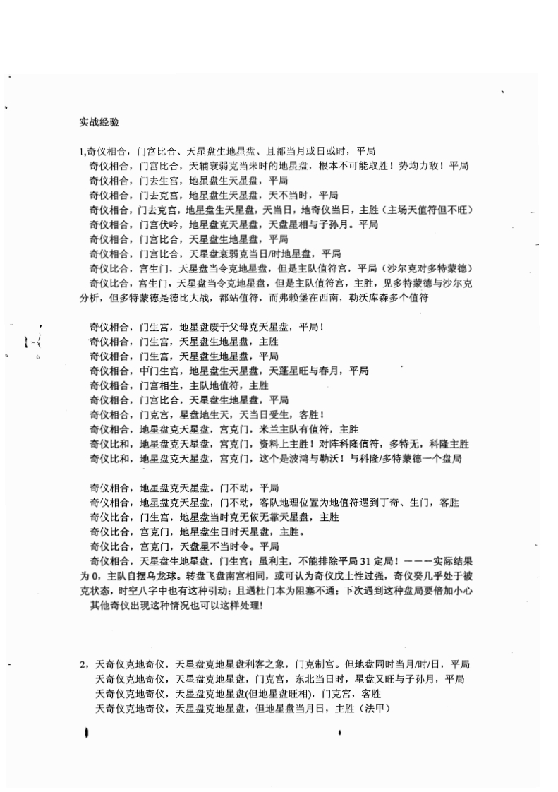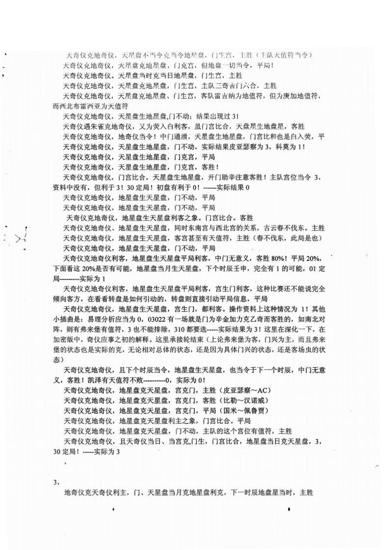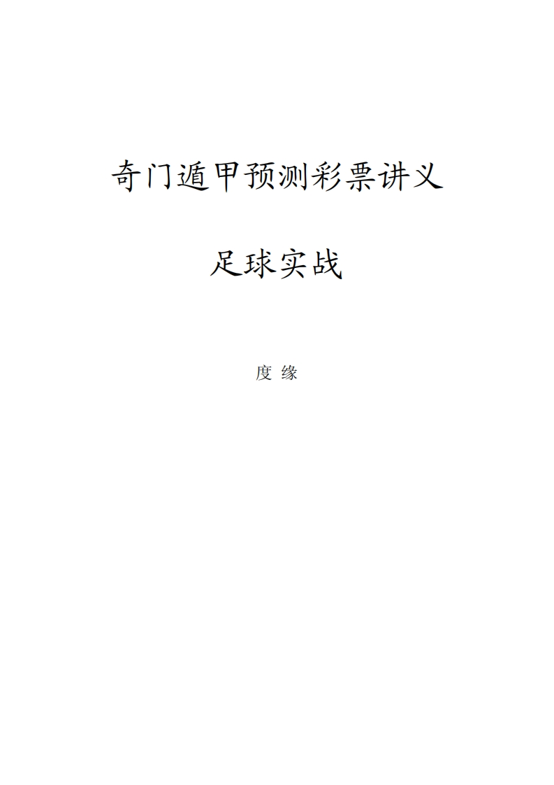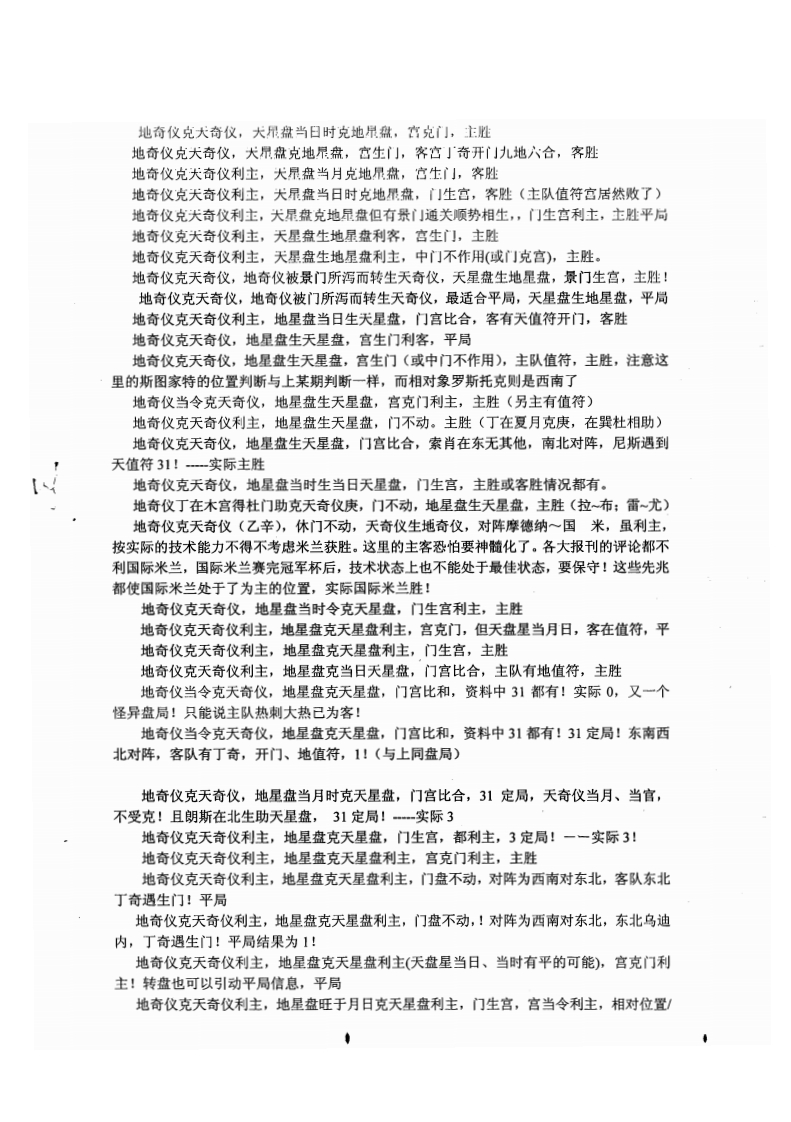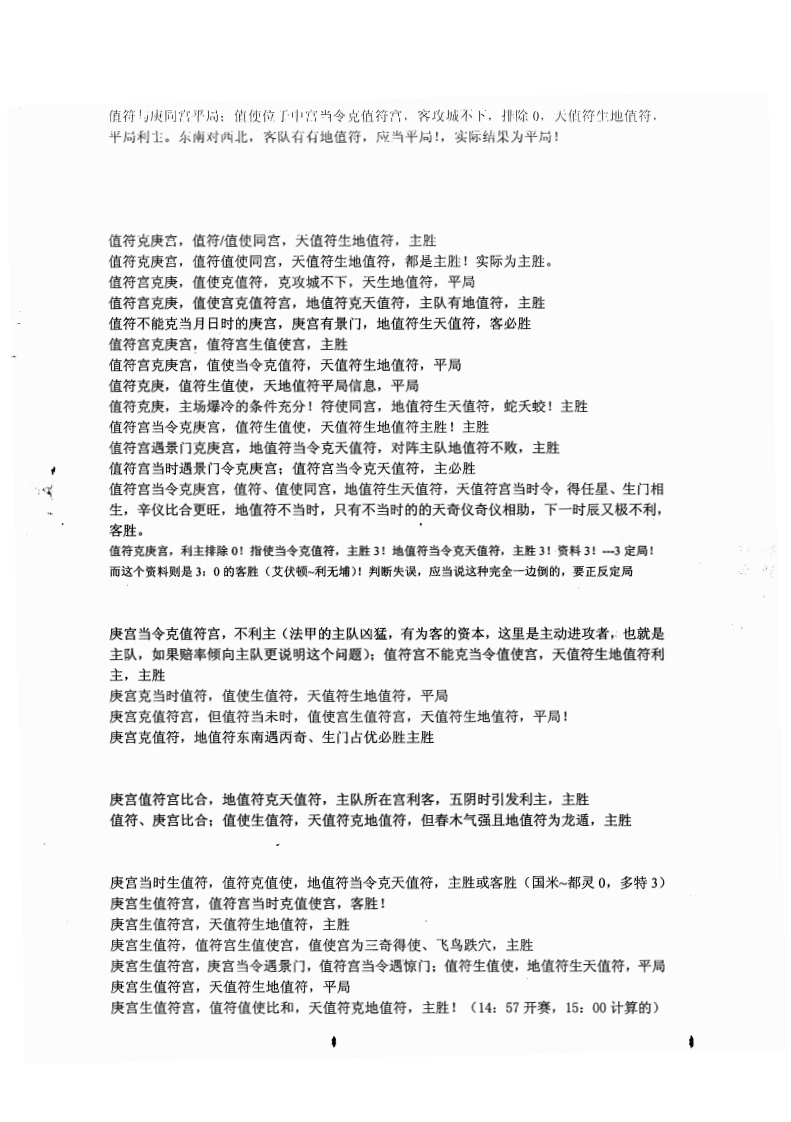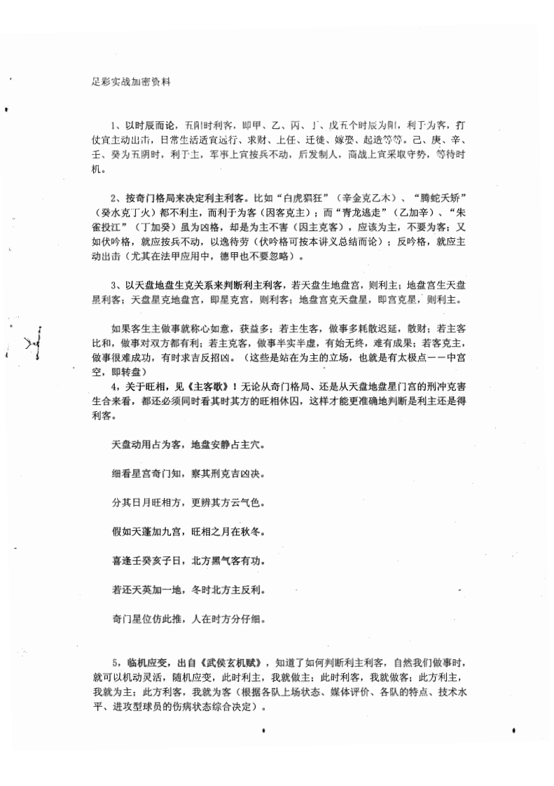 足彩实战加密资料1、以时辰而论,五阴引时利客,即甲、乙、丙、」、戊五个时辰为,利丁为客,打仗宜主动山击,日常生活适宜远行、求财、上任、迁徙、嫁娶、起造等等。己、庚、辛、壬、癸为五阴时,利丁主,军东上宜按兵不动,后发制人,商战上宜采取守势,等待时机。2、按奇门格局来决定利主利客。比如“白虎得狂”(辛金克乙木)、“腾蛇天矫”(癸水克丁火)都不利主,而利于为客(因客克主);而“青龙逃走”(乙加辛)、“朱雀投江”(丁加癸)虽为凶格,却是为主不害(因主克客),应该为主,不要为客:又如伏吟格,就应按兵不动,以逸待劳(伏吟格可按本讲义总结而论);反吟格,就应主动出击(尤其在法甲应用中,德甲也不要忽略)。3、以天盘地盘生克关系来判断利主利客,若天盘生地盘宫,则利主:地盘宫生天盘星利客:天盘星克地盘宫,即星克宫,则利客:地盘宫克天盘星,即官克星,则利主。如果客生主做事就称心如意,获益多:若主生客,做事多耗散迟延,散财:若主客比和,做事对双方都有利:若主克客,做事半实半虚,有始无终,难有成果;若客克主,做事很难成功,有时求吉反招凶。(这些是站在为主的立场,也就是有太极点一一中宫空,即转盘)4,关于旺相,见《主客歌》!无论从奇门格局、还是从天盘地盘星门宫的刑冲克害生合来看,都还必须同时看其时其方的旺相休囚,这样才能更准确地判断是利主还是得利客。天盘动用占为客,地盘安静占主穴。细看星宫奇门知,察其刑克吉凶决。分其日月旺相方,更辨其方云气色。假如天蓬加九宫,旺相之月在秋冬。喜逢壬癸亥子日,北方黑气客有功。若还天英加一地,冬时北方主反利。奇门星位仿此推,人在时方分仔细。5,临机应变,出自《武侯玄机赋》,知道了如何判断利主利客,自然我们做事时,就可以机动灵活,随机应变,此时利主,我就做主:此时利客,我就做客:此方利主,我就为主:此方利客,我就为客(根据各队上场状态、媒体评价、各队的特点、技术水平、进攻型球员的伤病状态综合决定)。