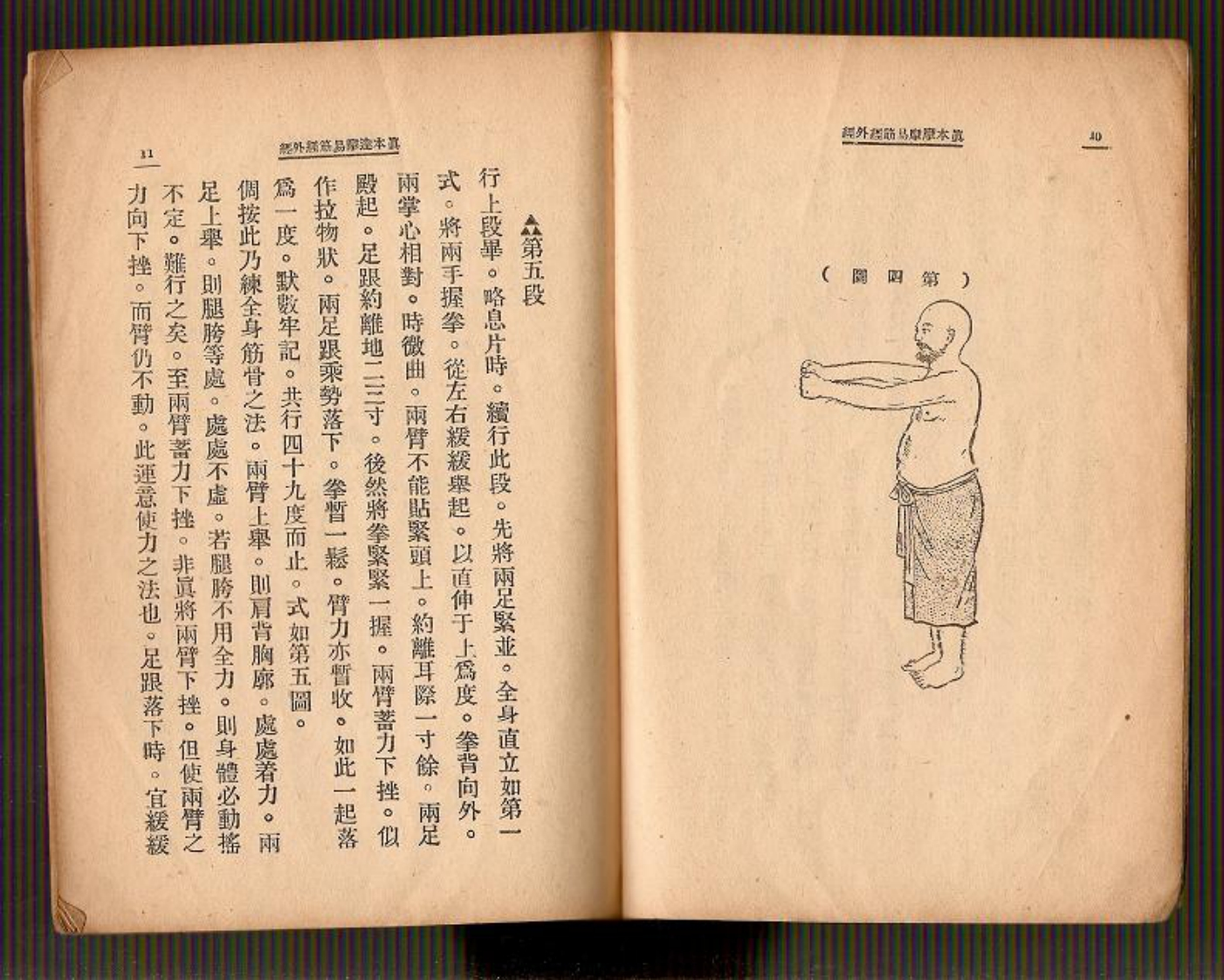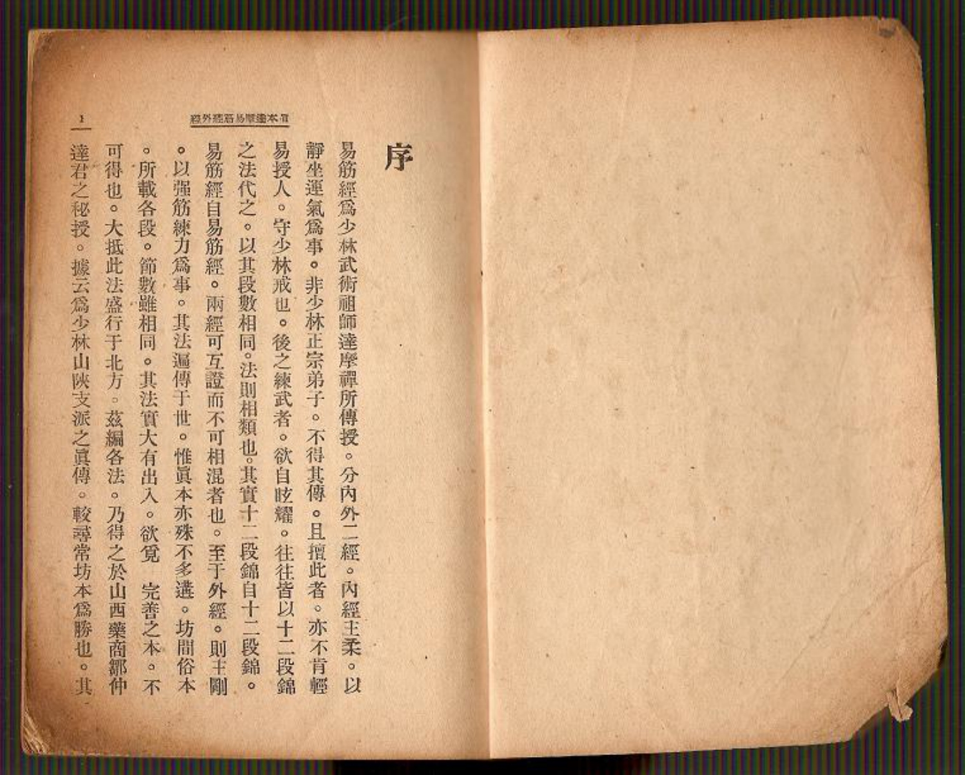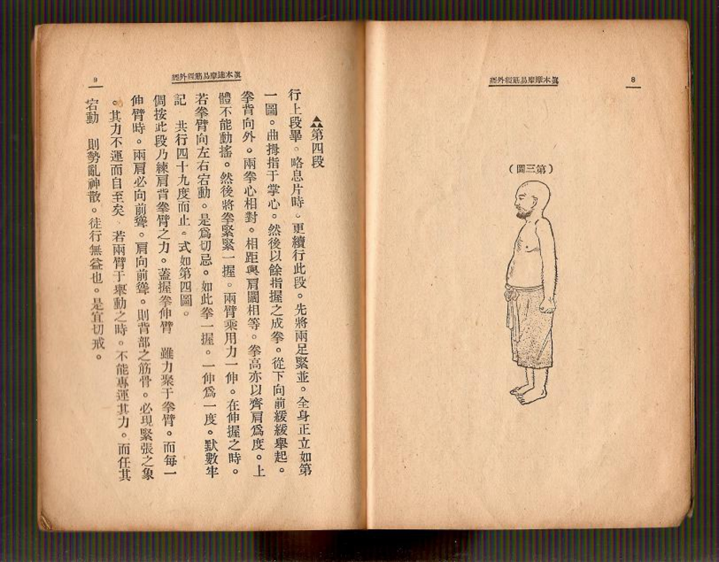 招州程符与摩演太门序莲君之秘授。據云為少林山映支派之旗傳。較尋常坊本為勝也。其可得也。大抵此法盛行于北方。兹編各法。乃得之於山西藥商部仲。所載各段。節數雖相同。其法質大有出入。欲覺完善之本。不。以强筋辣力為事。其法逼傳于世。惟员本亦殊不多遗。坊間俗本易筋經自易筋經。兩經可互證而不可相混着也。至于外經。则主剛之法代之。以其段數相同。法期相類也。其寶十二段錦自十二段錦。易授人。守少林戒也。後之辣武者。欲自眩耀。往往普以十二段錦静坐運氣為事。非少林正宗弟子。不得其傳。且擅此者。亦不肯輕易筋經為少林武術咀師達摩譚所傳授。分内外二經。丙經主柔。以