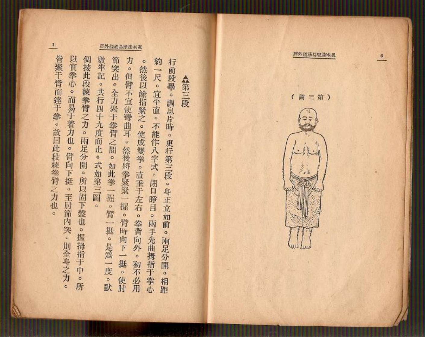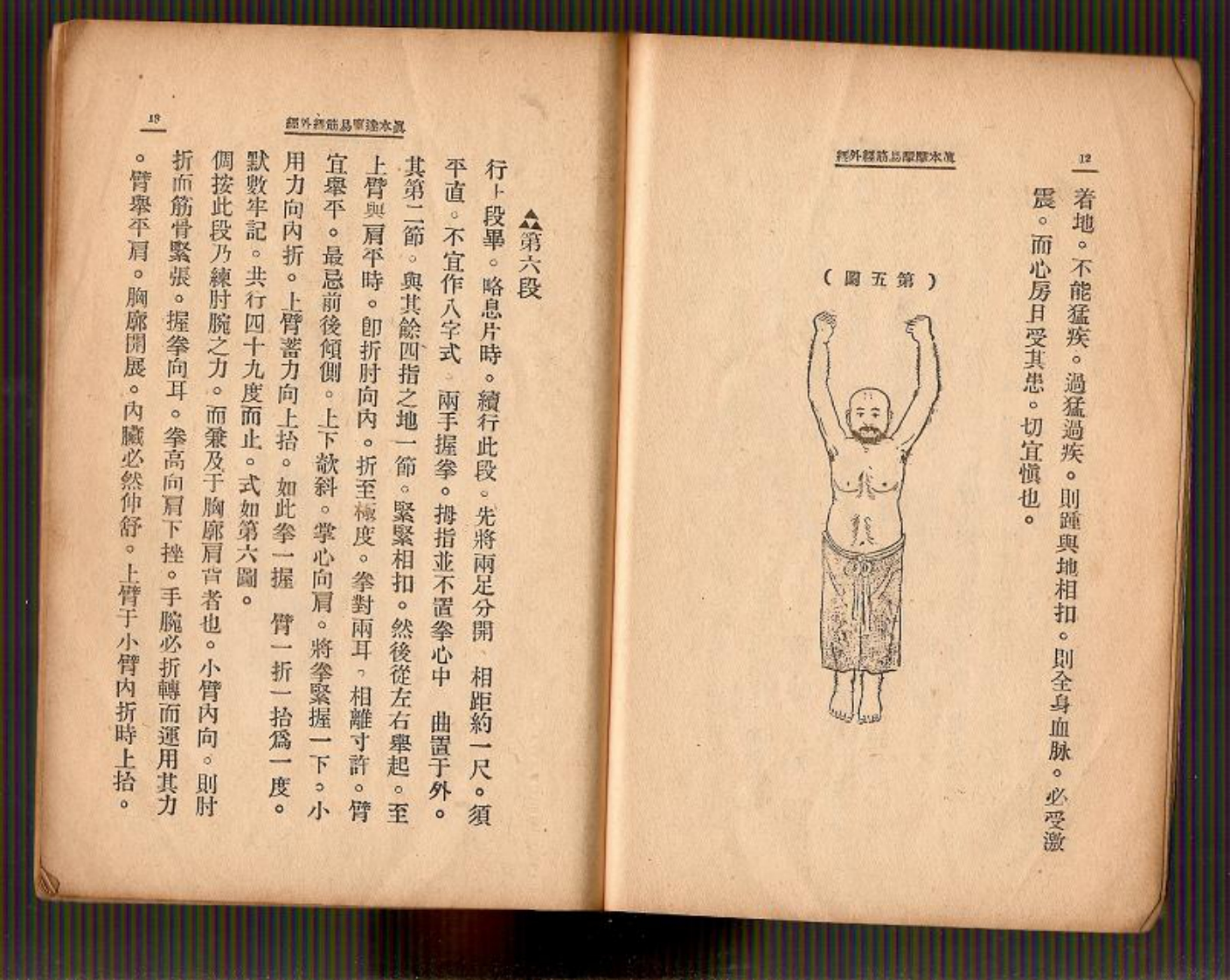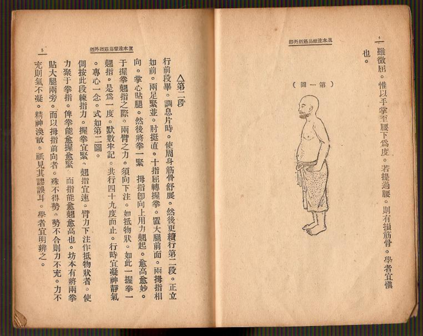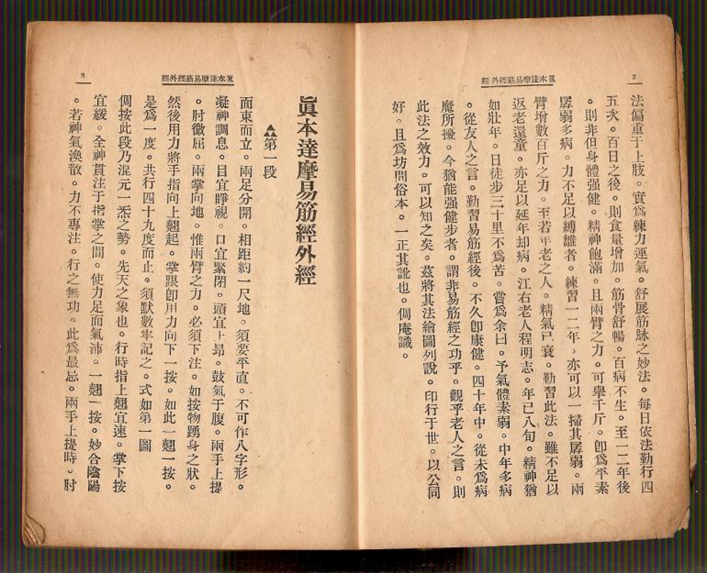 招州程符与摩演太门序莲君之秘授。據云為少林山映支派之旗傳。較尋常坊本為勝也。其可得也。大抵此法盛行于北方。兹編各法。乃得之於山西藥商部仲。所載各段。節數雖相同。其法質大有出入。欲覺完善之本。不。以强筋辣力為事。其法逼傳于世。惟员本亦殊不多遗。坊間俗本易筋經自易筋經。兩經可互證而不可相混着也。至于外經。则主剛之法代之。以其段數相同。法期相類也。其寶十二段錦自十二段錦。易授人。守少林戒也。後之辣武者。欲自眩耀。往往普以十二段錦静坐運氣為事。非少林正宗弟子。不得其傳。且擅此者。亦不肯輕易筋經為少林武術咀師達摩譚所傳授。分内外二經。丙經主柔。以