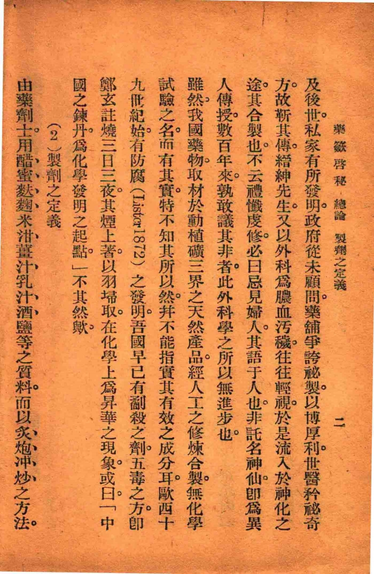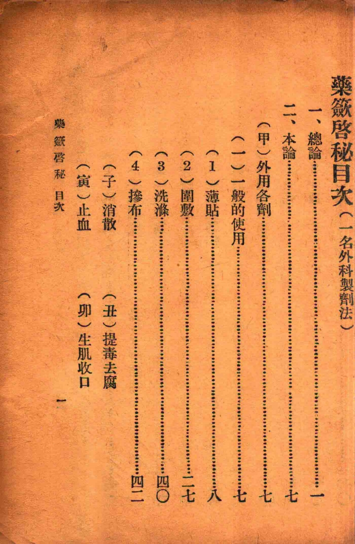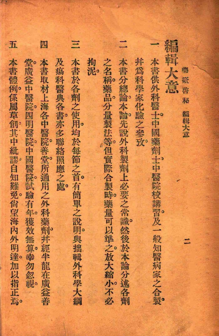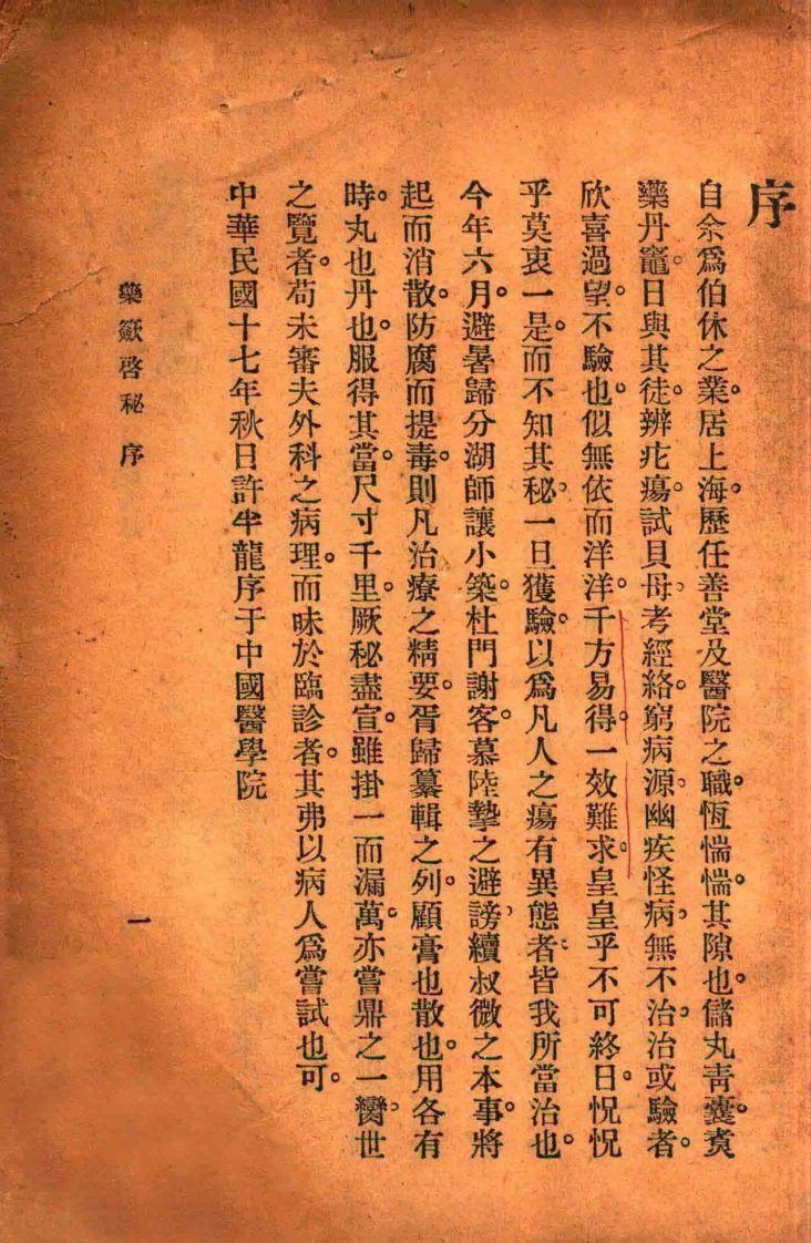 序藥筋啓秘序中華民國十七年秋日許牛龍序于中國醫學院之覽者荷未審夫外科之病理而味於臨診者其弗以病人為雪試也可時丸也丹也服得其當尺寸千里厥秘盡宣雖掛一而漏萬亦嘗鼎之一赞世起而消散防腐而提毒則凡治療之精要胥歸纂輯之列顧膏也散也用各有今年六月避暑歸分湖師讓小築杜門謝客慕陸擊之避務顧叔微之本事將乎莫妻一是而不知其秘一日獲驗以為凡人之寫有異態者皆我所當治也欣喜過望不驗也似無依而洋洋千方易得一效難求皇皇乎不可移日悦悦藥丹箭日與其徒辦為試貝母考經絡窮病源幽疾怪病無不治治或驗者自余為伯休之業居上海歷任善堂及醫院之職恒惴惜其隙也樣丸青囊煮