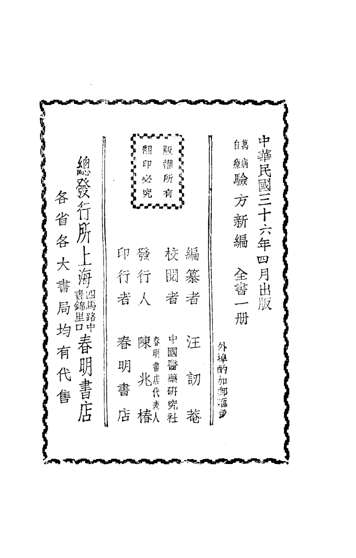 增广验方新编下册民国文献sishuge12小时前发布关注私信7.76MB179页0319增广验方新编下册民国文献此内容为付费资源,请付费后查看¥6¥10VIP会员免费立即购买您当前未登录!建议登陆后购买,可保存购买订单付费资源 第1页 / 共179页 第2页 / 共179页 第3页 / 共179页 第4页 / 共179页 第5页 / 共179页 第6页 / 共179页 第7页 / 共179页 第8页 / 共179页 试读已结束,还剩171页,您可下载完整版后进行离线阅读 © 版权声明文章版权归作者所有,未经允许请勿转载。THE END中医针灸# 中医# 民国中医 文本预览 翻印必究版所有传納驗方新績各省各大書局均有代售總發行所上海智智臨春明書店印發校行關者纂中華民國三十六年四月出版人全害一册春陳汪明書兆訒店春明書店代表人中國醫藥研究社外埠酌加邹涯堂菴 查看更多 收起部分 喜欢就支持一下吧点赞9 分享QQ空间微博QQ好友海报分享复制链接收藏
