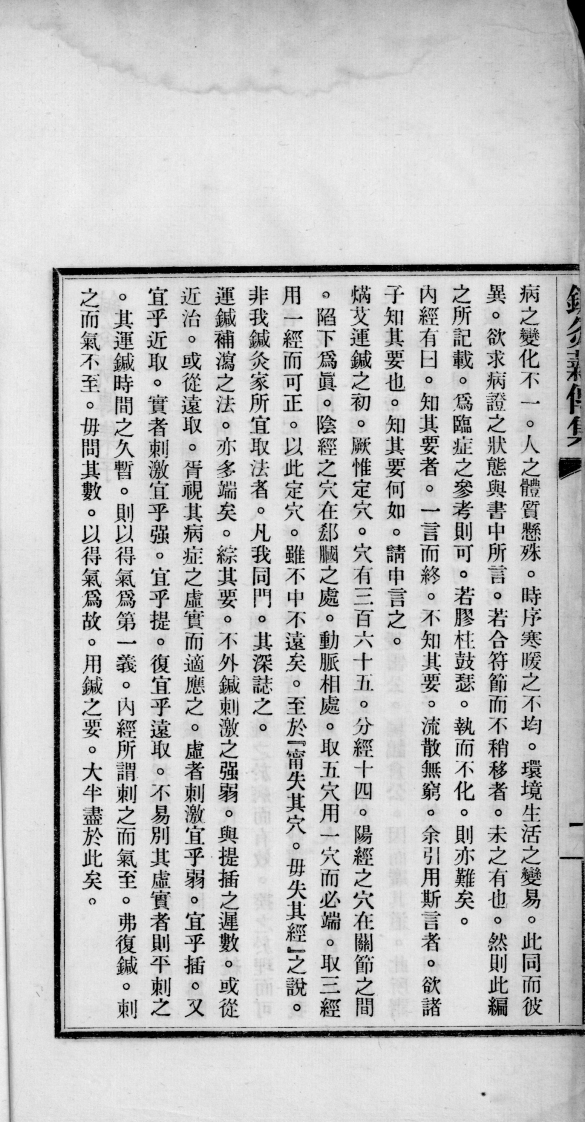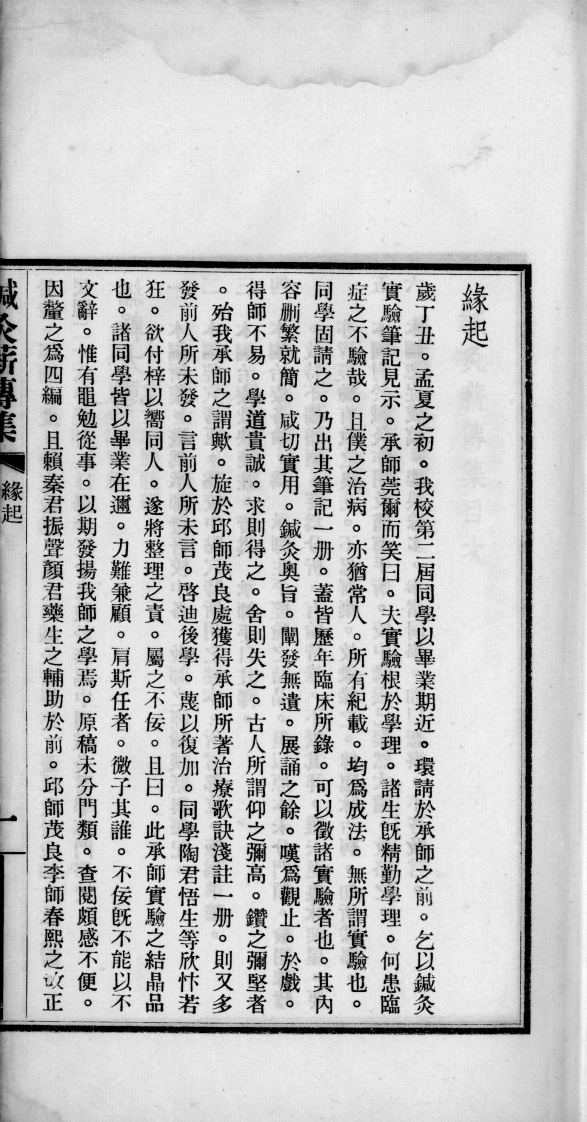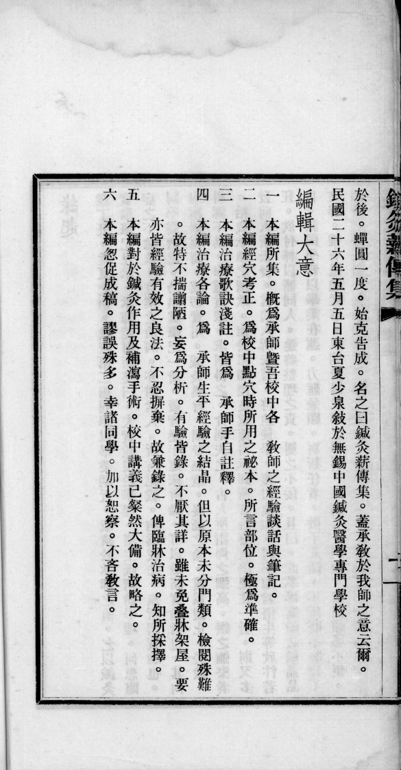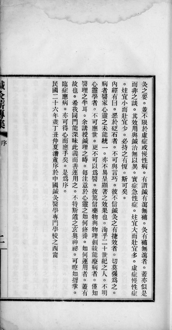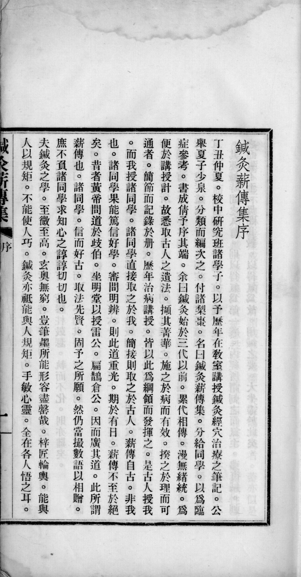 而詻通者。簡便於講授計序人以规矩。不能使人巧。铖灸亦厭能與人规矩。手敏心靈。全在各人悟之耳。夫铖灸之學。至微至高。玄奧無窮。壹筆噩所能形容盡醬哉。梓匠輪奥。能與無不負諸同學求知心之篝淳切切也。鏃灸薪傳集序不。薪傳也。諸同學。信而好古。取法先賢。固予之所顔。然仍當摄數語以相贈。矣。背者黄带問道於域伯。坐明堂以授雷公◎扁鹅倉公◎因而廣其道。此所謂也。諸同學果能篤信好學。答間明辩。則此道重光。期於有日。薪博不至於絕。諸同學直接取之於我。簡接則取之於古人。薪傳自古。非我而記録於册。歷年治病講授。皆以此為網額而發揮之。是古人授我。故悉取古人之遗法。插其菁華。施之於病而有效。揆之於理而可症參考。書成倩予序其端。余目簸灸始於三代以前。梁代相傳。漫無緒統。為舉夏子少泉。分類而編次之。付諸梨路。名日铖灸薪傳集。分給同學。以為臨丁丑仲夏。校中研究班諸學子。以予歷年在教室講授铖灸經穴治療之筆記。公