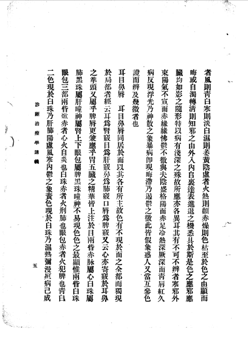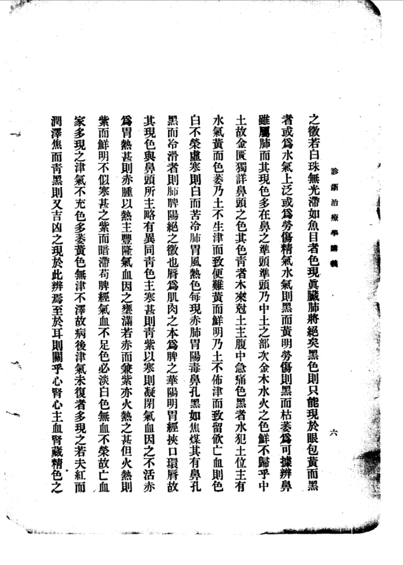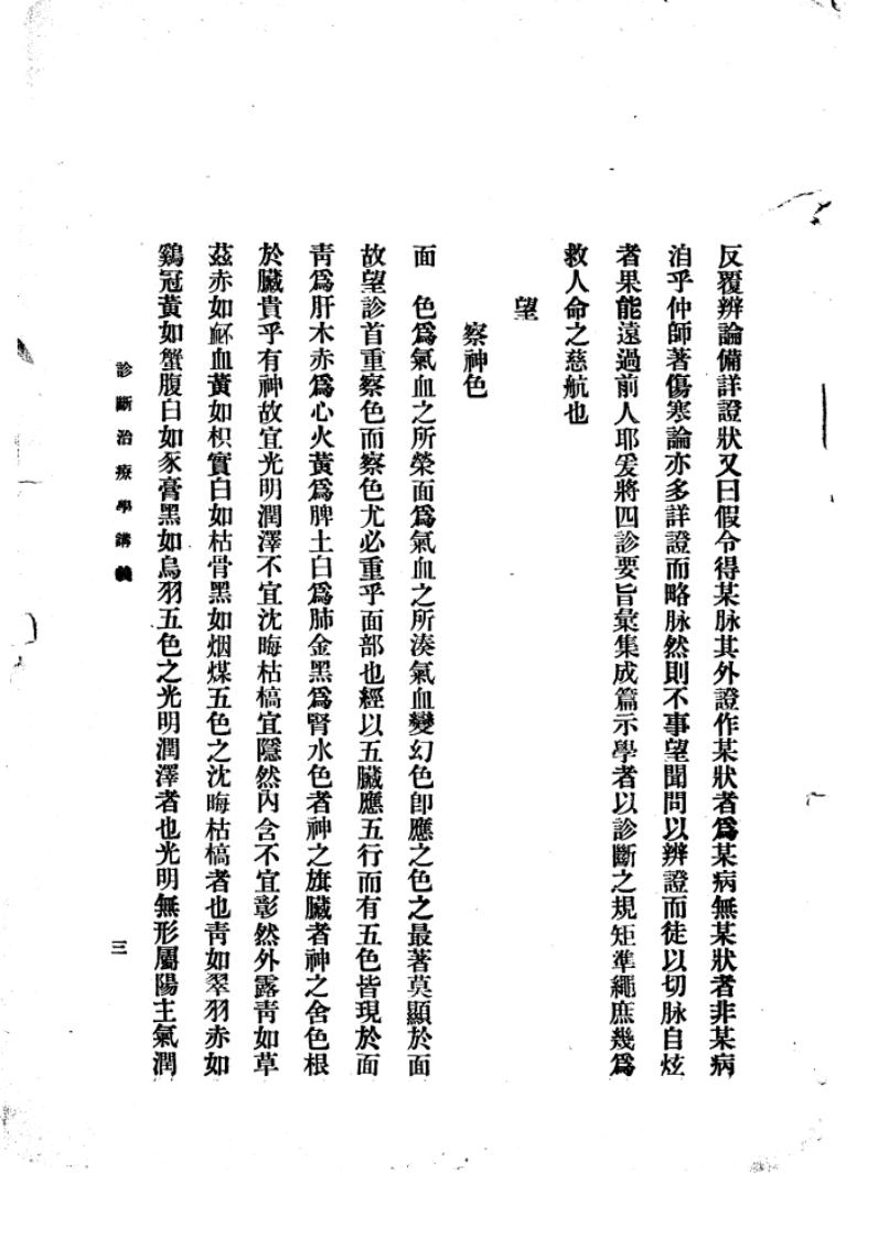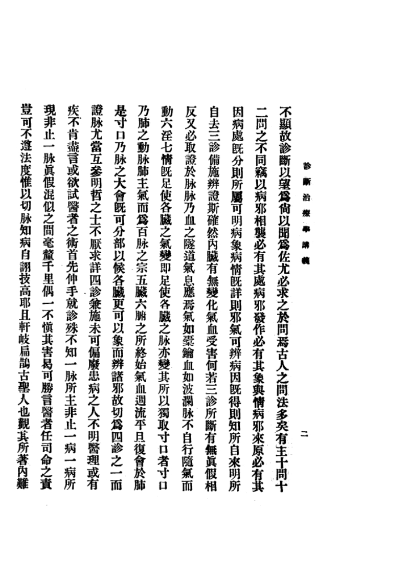 登可不遵法度惟以切脉知病自额技高耶且軒岐局韵古聖人也觀其所著内鲜現非止一脉真假混似之間毫釐千里偶一不慎其害易可勝冒醫者任司命之青疾不肯盡或欲試醫者之術首先伸手就診殊不知一脉所主非止一病一病所證脉尤當互參明哲之士不厭求詳四診策施未可偏陵患病之人不明醫理或有是寸口乃脉之大會既可分部以候各藏更可以象而辨蓄邪故切為四診之一而乃肺之動脉肺主氣而為百脉之宗五藏六腑之所終始氣血週流平且復會於肺動六淫七情既足使各藏之氣變即足使各藏之脉亦變其所以獨取寸口者寸口反又必取證於脉脉乃血之隧道氣息應為氣如聚驗血如波瀾脉不自行隨氣而自去三診備施辨證斯確然内臟有無變化氣血受害何若三爹所斷有無真假相因病處既分則所属可明病象病情既詳則邪氣可辨病因既得則知所自來明所二問之不同竊以病邪相製必有其處病邪發作必有其象與情病邪來原必有其不顯故爹斷以望為伺以聞為佐尤必求之於問為古人之問法多有主十問十二