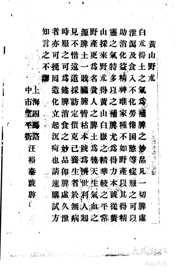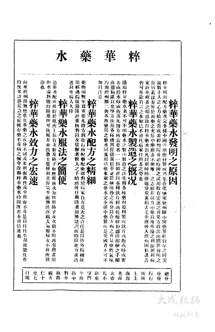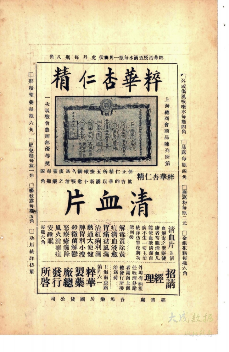 角入瓶每.丹·虎伏●角一瓶每水酒五疫治華粹精仁杏華粹口疳積聖藥每瓶六角□肥兒糕每盒一角大展覽會度商部優等獎上海總商會商品陳列所第外成傷風暖嗽水每瓶四角四每靈痰久福嗽療五所精仁止係口肺露每瓶四角精仁杏華粹角瓶藥之治暖愈十新福以華的杏其片血清□燕富粉每瓶二元口功用美安風怒船脾熱治胃疽解能就海潘解小便利風除就群仿單疽降鬱溲健濕濕愈群仿單垃將功不生一切主治能使血液清课百康者常服清血凡血解毒之聖藥健清血片复情口金銀花精每瓶所發廠製粹第P六啓行總藥華上海南京路者請楼就日理司公货國房埠各感售鄹大成教
