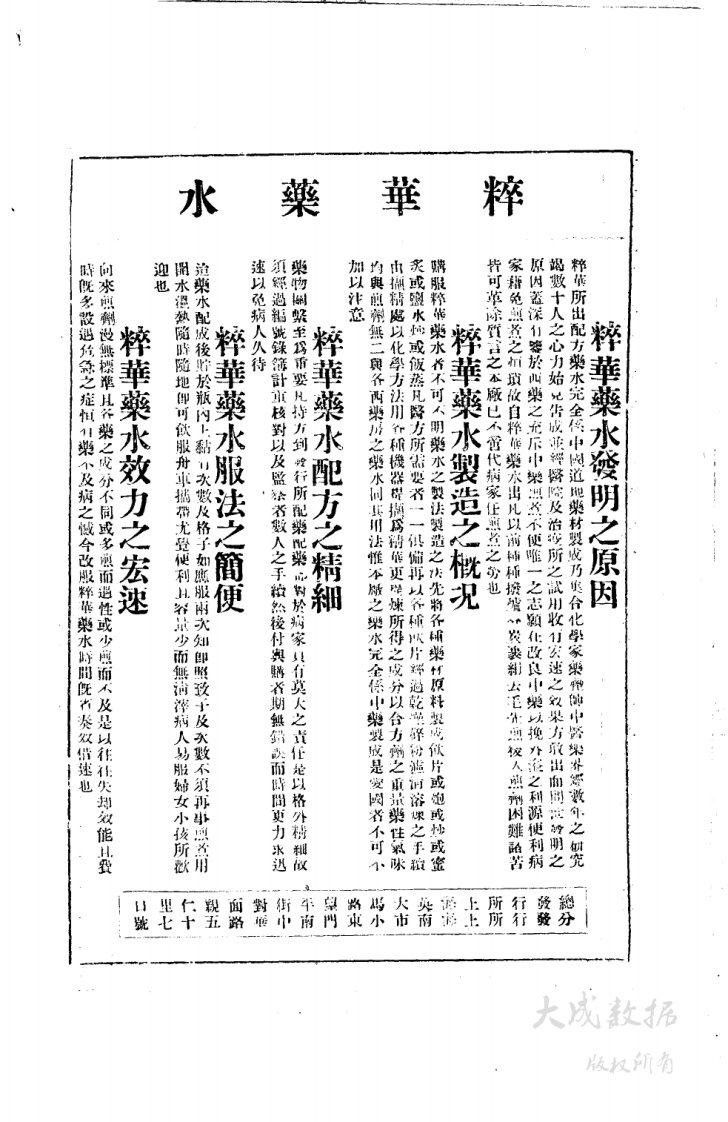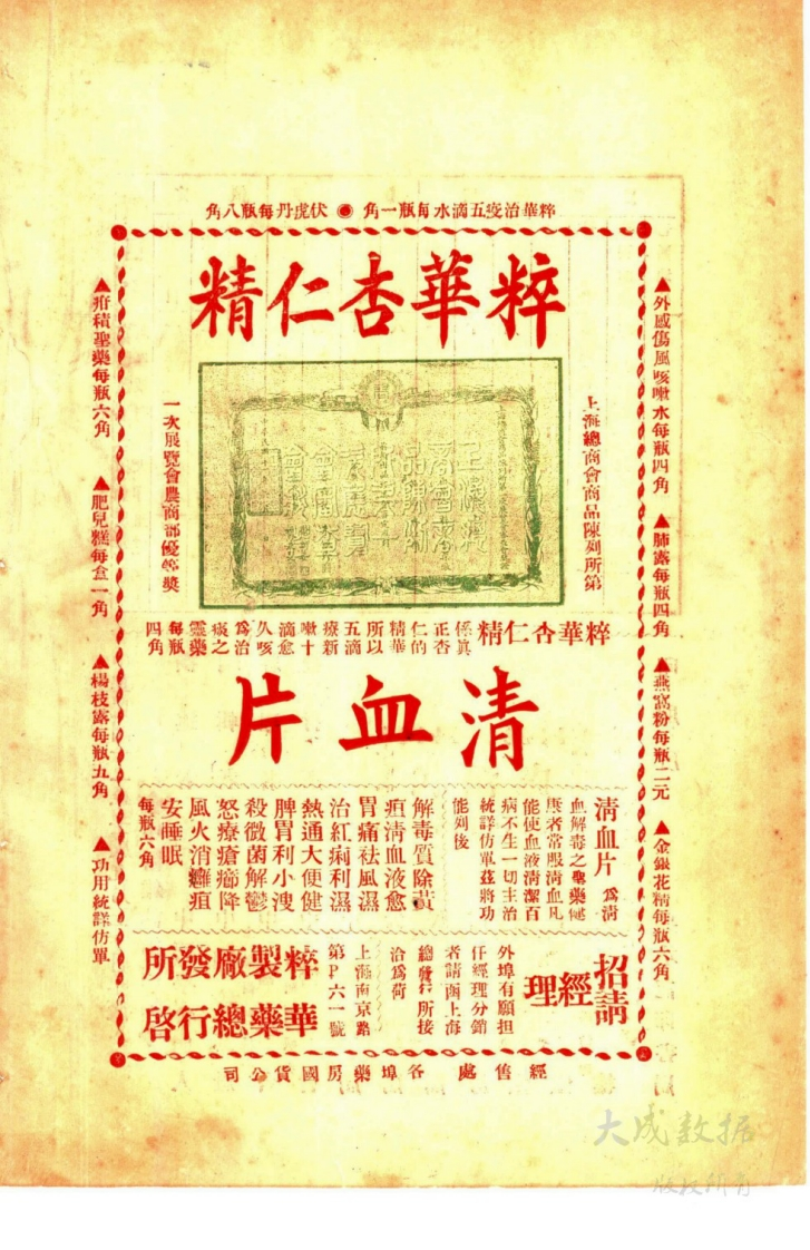 角入顺每丹虎伏。角一瓶每水滴五疫治粹▲積銮藥每瓶六角精仁杏華粹外成傷風医嗽水每瓶四角▲肥兒糕每盒一角I大展墅會農商部侵樂獎上海總商會商品陳列所第▲肺露每瓶四角四每露毯您久滴墩擦五所精仁渠堡精仁杏華粹角瓶藥之治罗愈十新滴以推的杏其▲科枝游每款九角片血清▲燕富粉每聯二元每安風怒殺脾熱治胃疽解病能功用統安能刘後血解毒之譽藥清質不生一切者常服清避猫解小便利風液」疽降鬱溲健濕濕愈單莊將功使血液清潔百片鸳谐腋}▲金銀花精每激六角所酸廠製粹上询者仔六荷面理啓行總藥華京所接外埠有理經担司公货國房藥埠各處售大成教