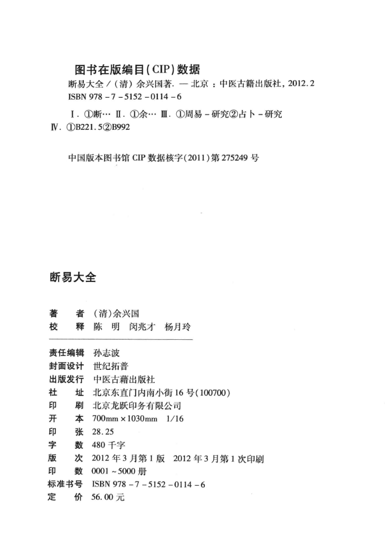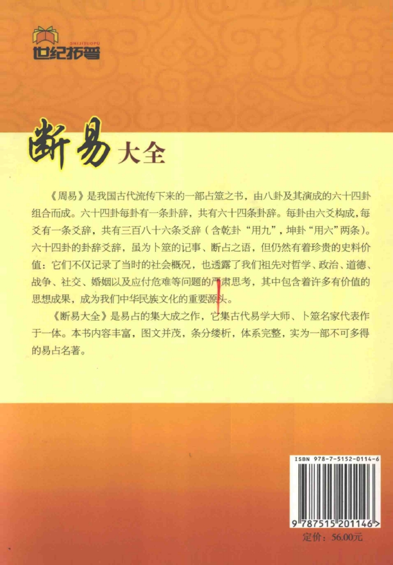 世纪拓增断易大全《周易》是我国古代流传下来的一部占筮之书,由八卦及其演成的六十四卦组合而成。六十四卦每卦有一条卦辞,共有六十四条卦辞。每卦由六爻构成,每爻有一条爻辞,共有三百八十六条爻辞(含乾卦“用九”,坤卦“用六”两条)。六十四卦的卦辞爻辞,虽为卜筮的记事、断占之语,但仍然有着珍贵的史料价值:它们不仅记录了当时的社会概况,也透露了我们祖先对哲学、政治、道德、战争、社交、婚姻以及应付危难等问题的严肃思考,其中包含着许多有价值的思想成果,成为我们中华民族文化的重要源头。《断易大全》是易占的集大成之作,它集古代易学大师、卜筮名家代表作于一体。本书内容丰富,图文并茂,条分缕析,体系完整,实为一部不可多得的易占名著。1BN978-7-5152-0114-69787515201146>定价:56.00元
